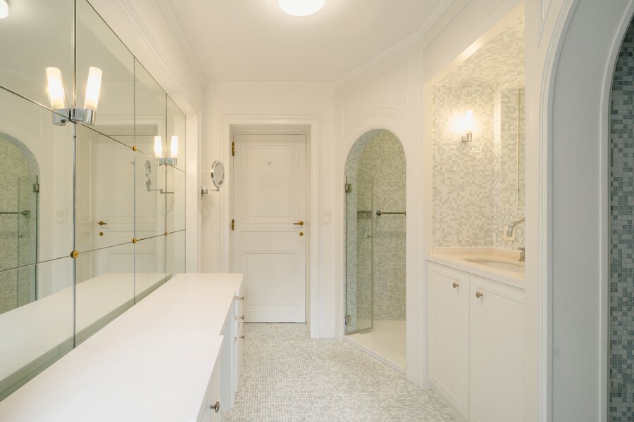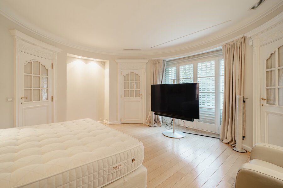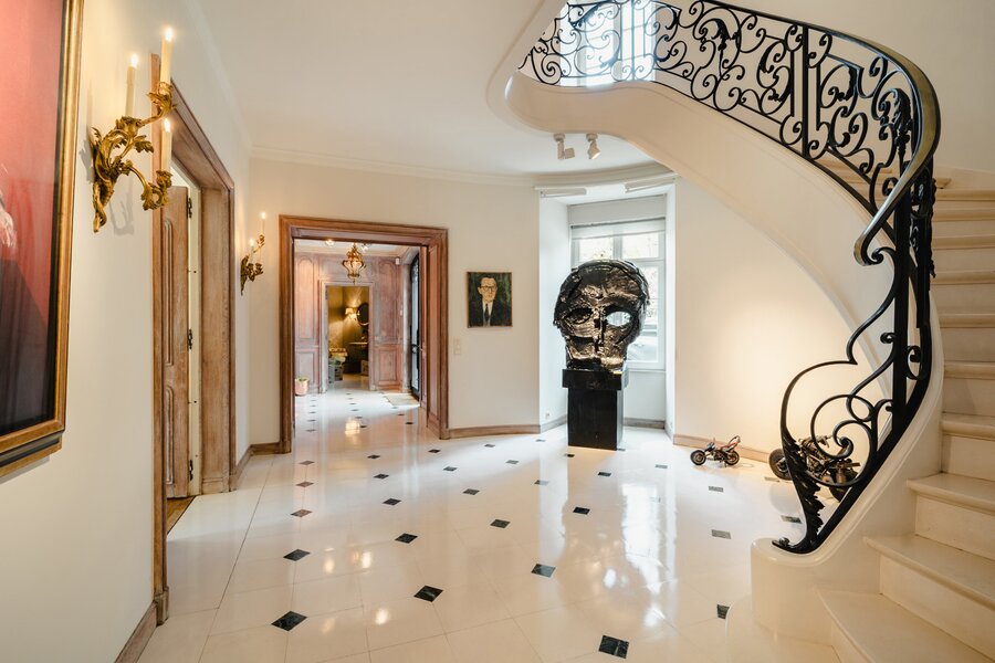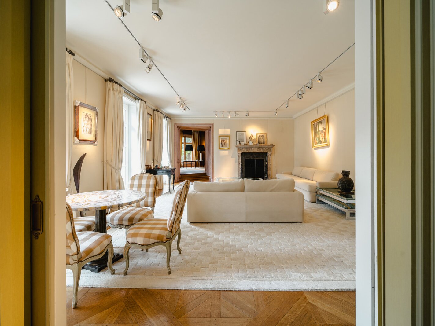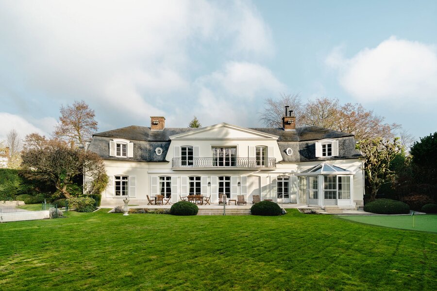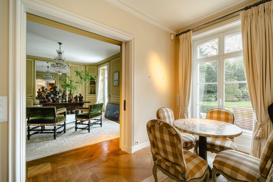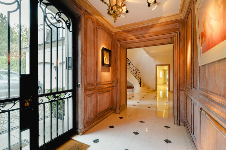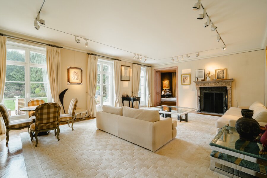 Deze villa, die zowel geschikt is voor recepties als voor familiegebruik, ligt verborgen aan het einde van een boomrijke laan. De ruime inkomhal leidt naar lichte ontvangstruimten, bestaande uit een salon met open haard, een bibliotheeklounge, eveneens met open haard, een eetkamer met houten lambrisering en een professionele keuken met een ruime eethoek, aangevuld met een bijkeuken en een dienstingang. Elk van deze ruimtes geeft toegang tot de tuin met zwembad, poolhouse en putting green. Op de verdieping bevinden zich de master suite met uitzicht op de tuin, een dubbele dressing, een doucheruimte voor dames en een doucheruimte voor heren en suite, een massageruimte en 3 andere slaapkamers en suite. Een deel is bestemd voor een dienstappartement met salon, slaapkamer en doucheruimte. In de kelder bevinden zich geklimatiseerde wijnkelder, fitnessruimte en wasruimte.