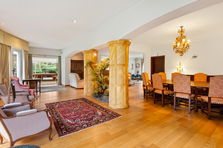 ruime inkomhal - aparte vestiaire met gastentoilet en handenwasser - riante leefruimte op parket ingedeeld in een eetkamer, zithoek met O.H., salon en een grote polyvalente ruimte (extra tv-salon/bureau/..) van ca. 50 m². De leefkeuken is uitgerust met een kookeiland in graniet en een ruime eethoek met zicht en toegang tot het terras en de tuin. De keuken is voorzien van een aanrecht met dubbele spoelbak, kookplaat, dampkap, friteuse, vaatwasmachine, ijskast, 2 ovens. Via de keuken is er toegang naar een hal met dienstingang.