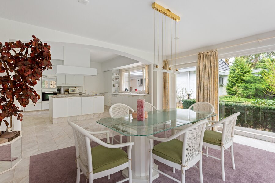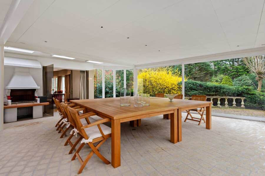 Grenzend aan de woonkamer is er via een dubbele glazen deur toegang tot de veranda van ca. 40 m² met O.H/BBQ, grote schuiframen met zicht en toegang tot de tuin.