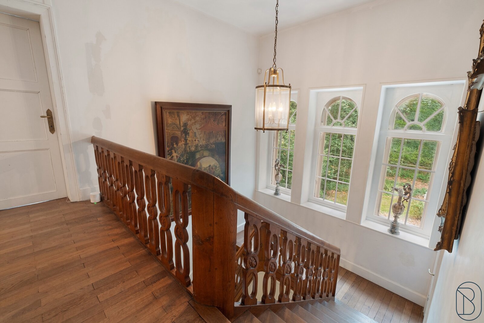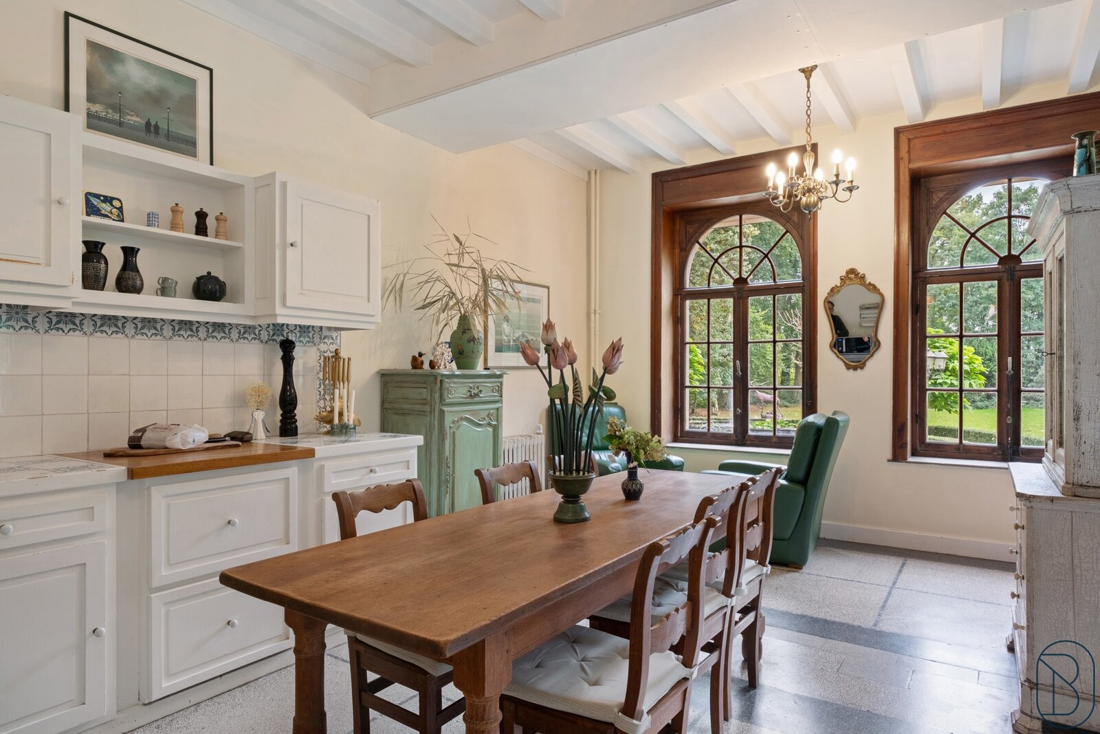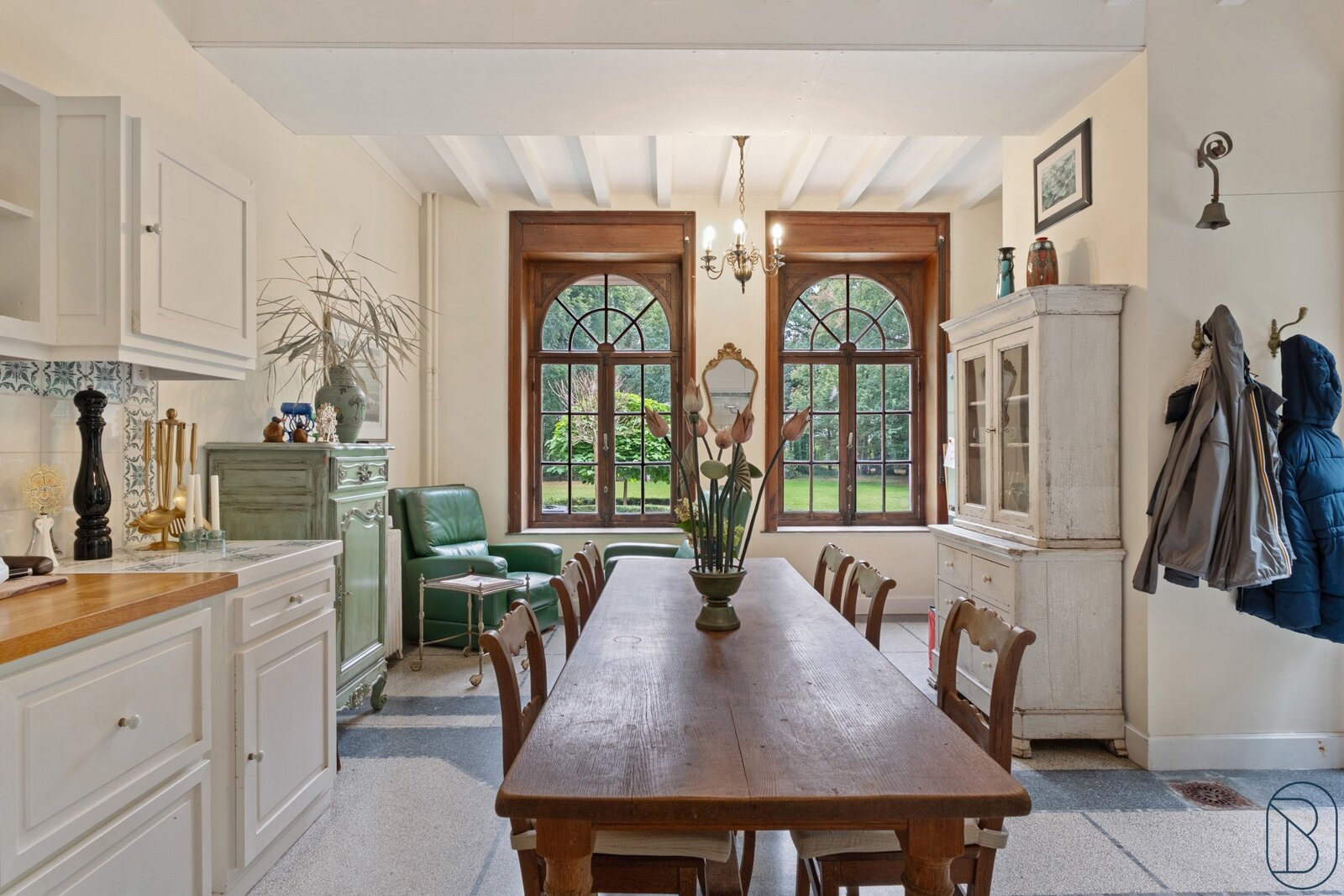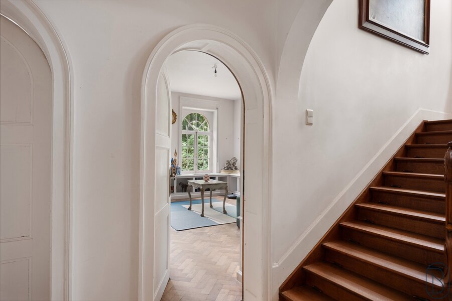 De woning omvat op het gelijkvloers een mooie inkomhal, salon en leefruimte, ingerichte keuken, bibliotheek en bureau.
