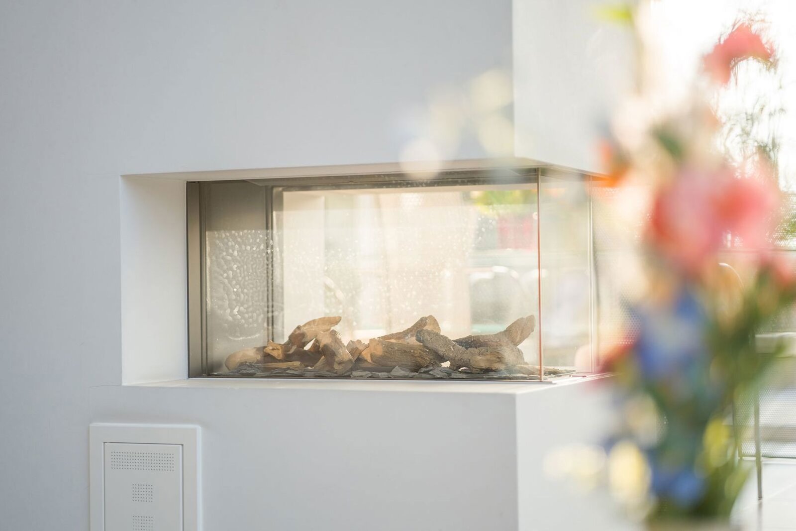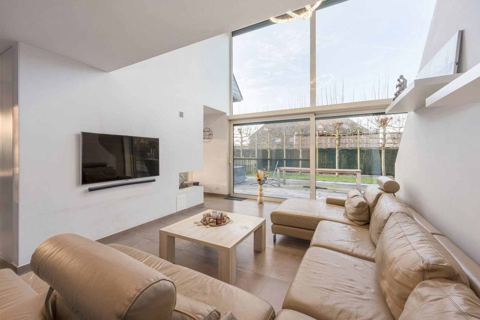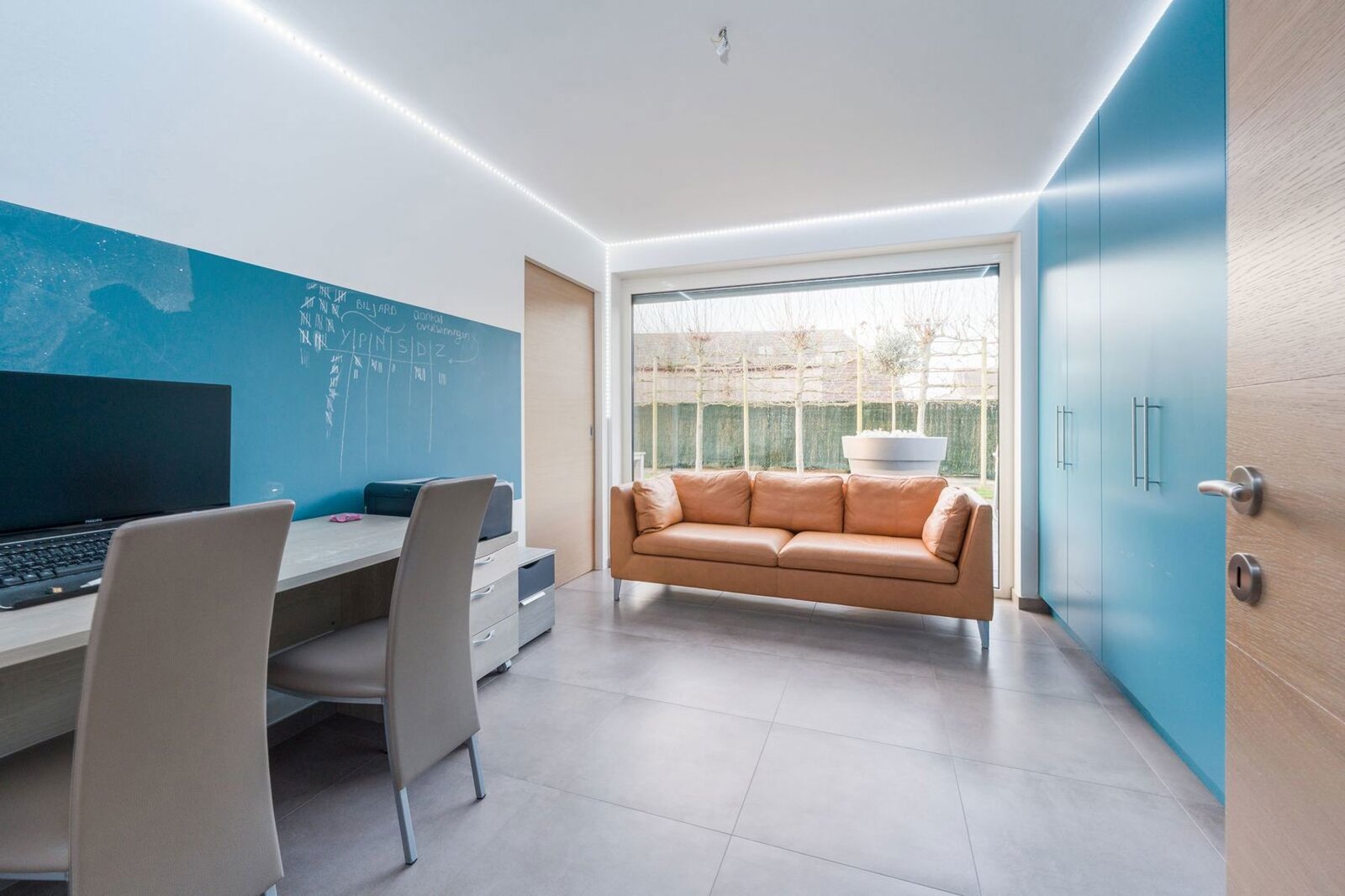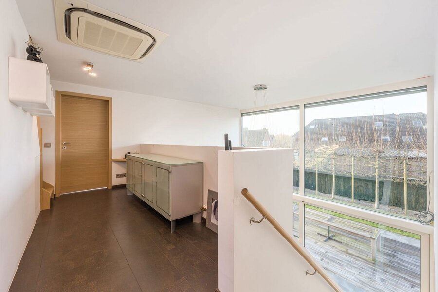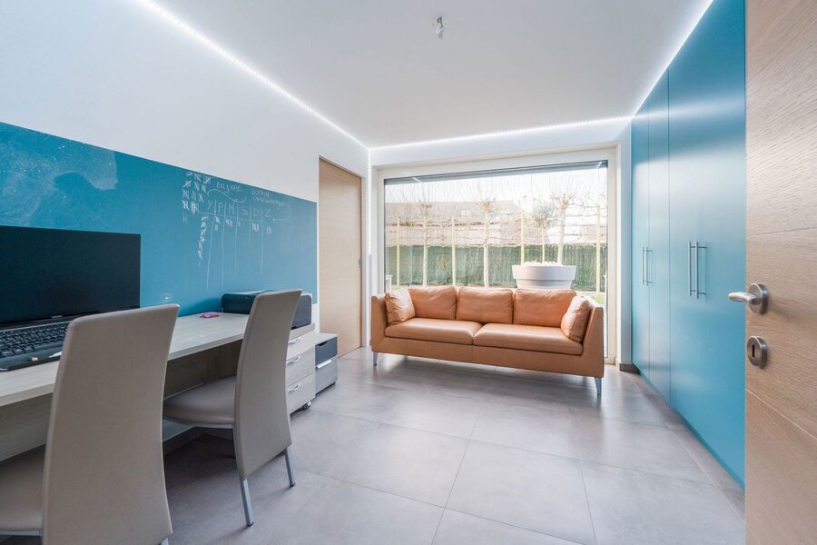 Vanaf het gelijkvloers word je verwelkomd door een aangename flow en een overvloed aan natuurlijke lichtinval in alle hoeken van de woning. De aparte bureauruimte biedt een rustige werkplek, ideaal voor thuiswerk of een vrij beroep. De zitruimte baadt in het licht dankzij de hoge raampartijen en wordt extra sfeervol door de gashaard met ingebouwde cassette – warmte en elegantie in één.