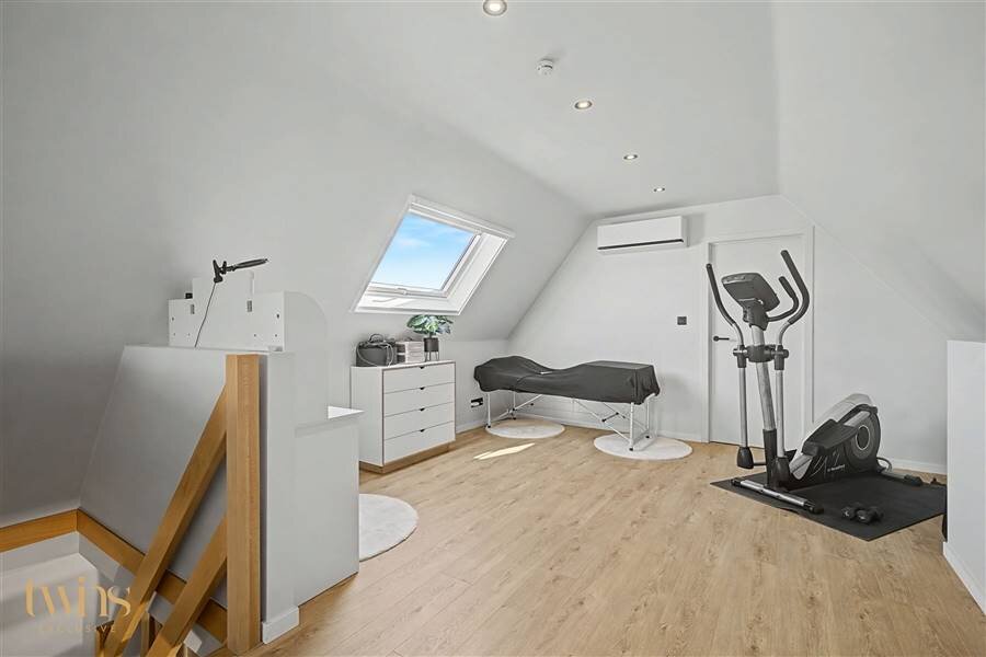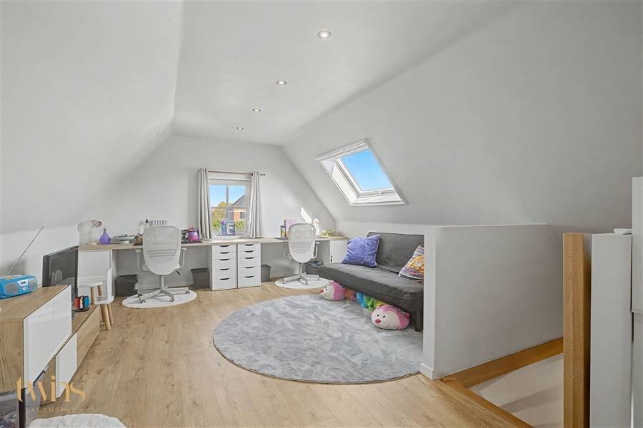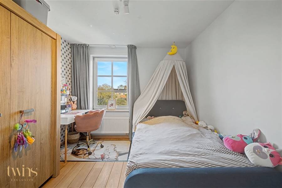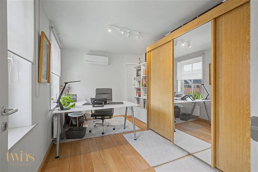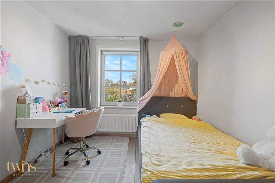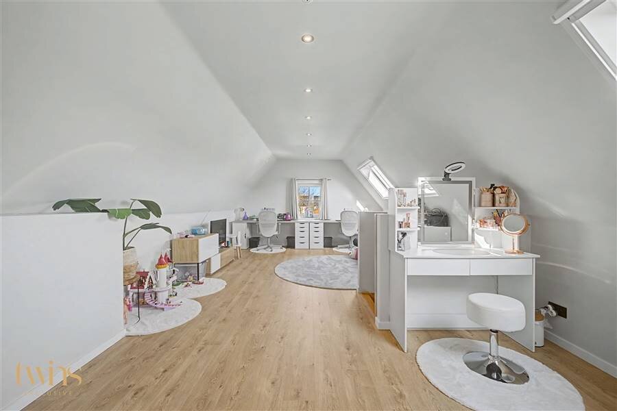 Via de inkomhal met gastentoilet betreed je de woning. Van hieruit kom je in de lichtrijke leefruimte die in open verbinding staat met de volledig ingerichte keuken, uitgerust met Miele-toestellen. Aansluitend bevindt zich een praktische berging/wasruimte. De woning beschikt verder over een oprit afgesloten met een poort, een garage en een aangename achterliggende tuin waar je in alle rust kan genieten. Op de eerste verdieping bevindt zich een ruime nachthal met apart toilet, vier slaapkamers waarvan één momenteel ingericht is als bureau, en een badkamer uitgerust met ligbad, douche en dubbele wastafel in meubel. Via een vaste trap bereik je de zolderverdieping, die volledig werd ingericht als hobbykamer/speelkamer en waar zich daarnaast nog een aparte opbergruimte bevindt.
