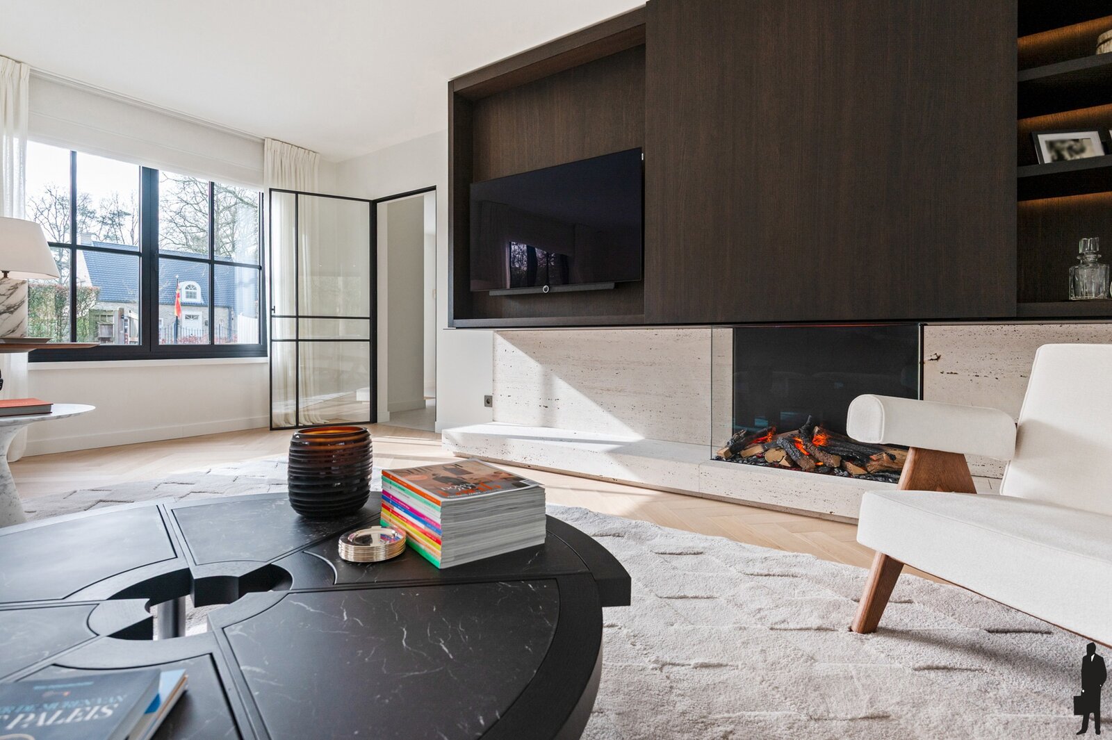 - een tweede leefruimte / tv-kamer / bureau met travertinvloer, open haard op hout, grote raampartijen tot op de grond en toegang tot terras en tuin,