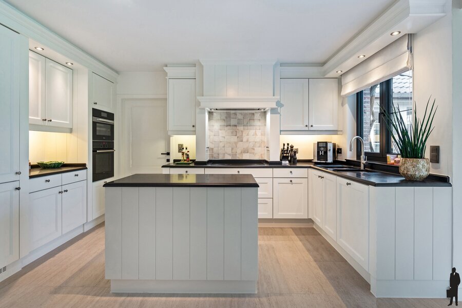 - een volledig uitgeruste keuken op beige travertin met dubbele spoelbak, natuurstenen eiland en kwalitatieve inbouwtoestellen (Miele inductiekookplaat en dampkap, Siemens vaatwasser, Siemens combi-oven en heteluchtoven, Miele koelkast en vriezer High Line),