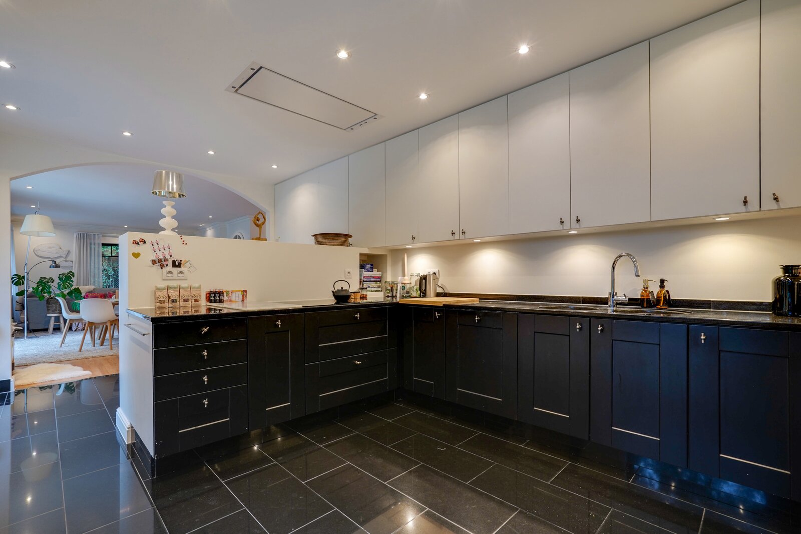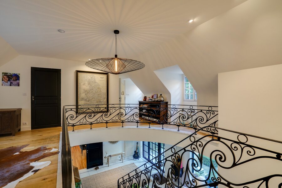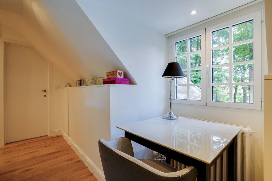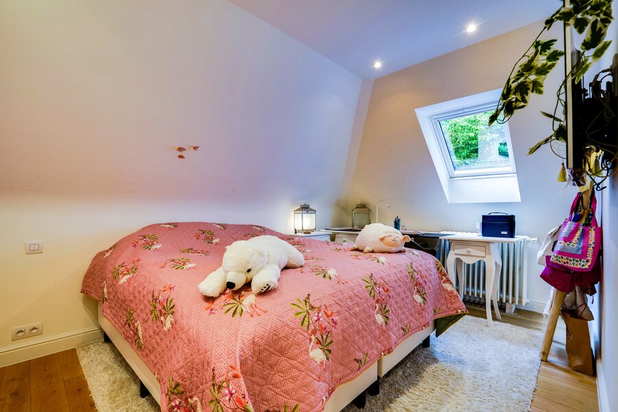 Het gelijkvloers bestaat uit een ruime inkomhal met open trap, een vestiaire, een lichtrijke woonkamer met haard en toegang naar het terras, een open keuken voorzien van alle nodige apparatuur met kastruimtes op maat. De grote raampartijen zorgen voor een mooie verbinding tussen binnen en buiten. De wasruimte met toegang naar de buitenruimte, een speel- of leeskamer en een ingerichte bureauruimte. De eerste slaapkamer met badkamer en tweede ruime slaapkamer met dressing en badkamer met douche. Het bovenste verdiep bevat drie slaapkamers met privatieve badkamers.
