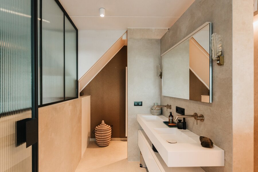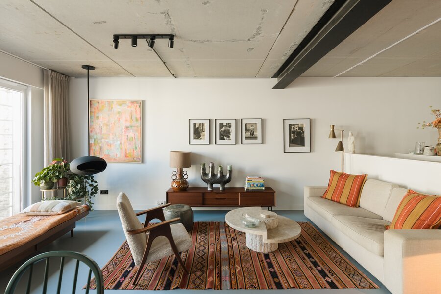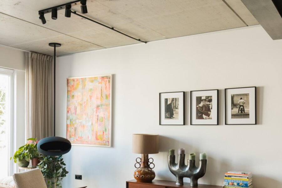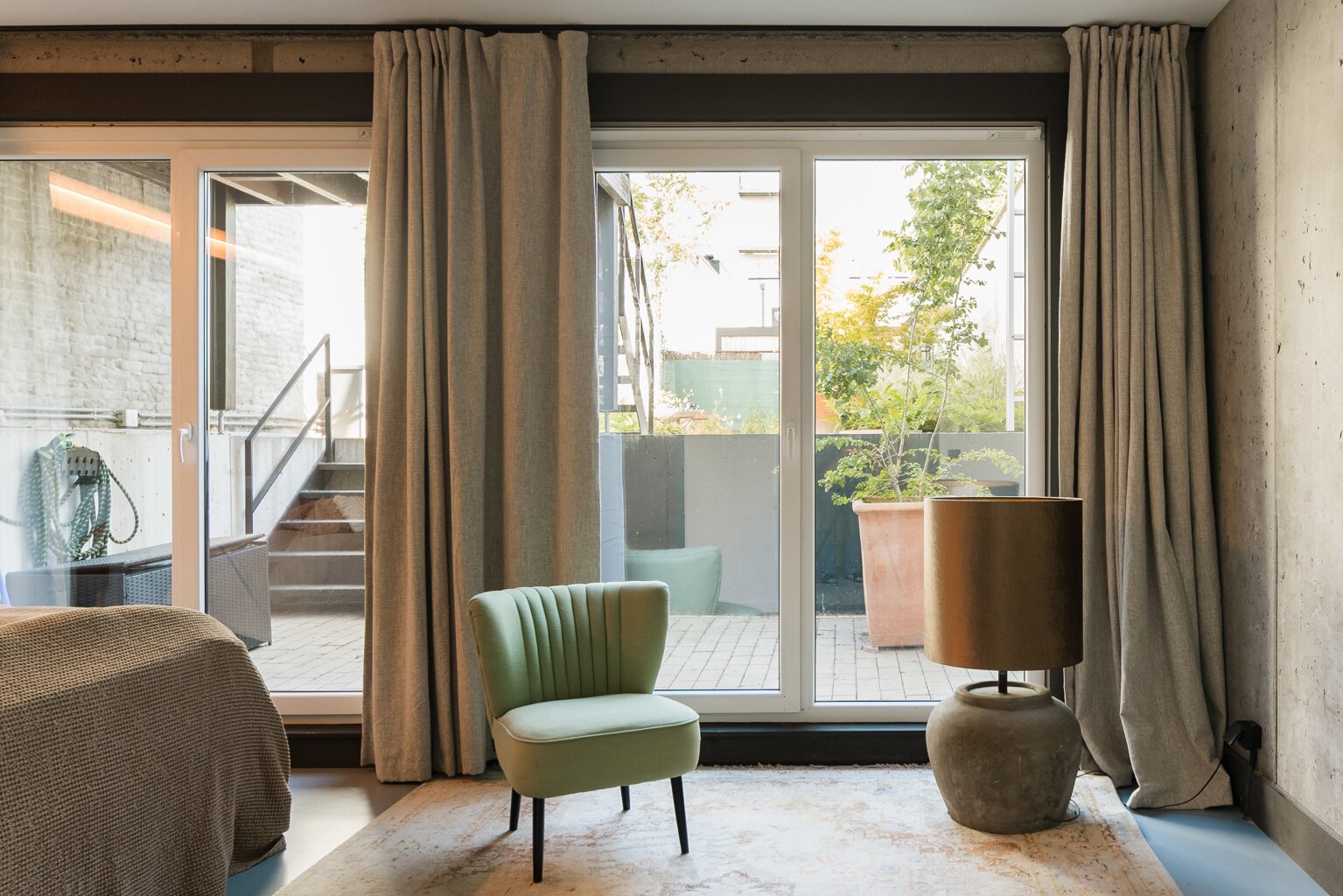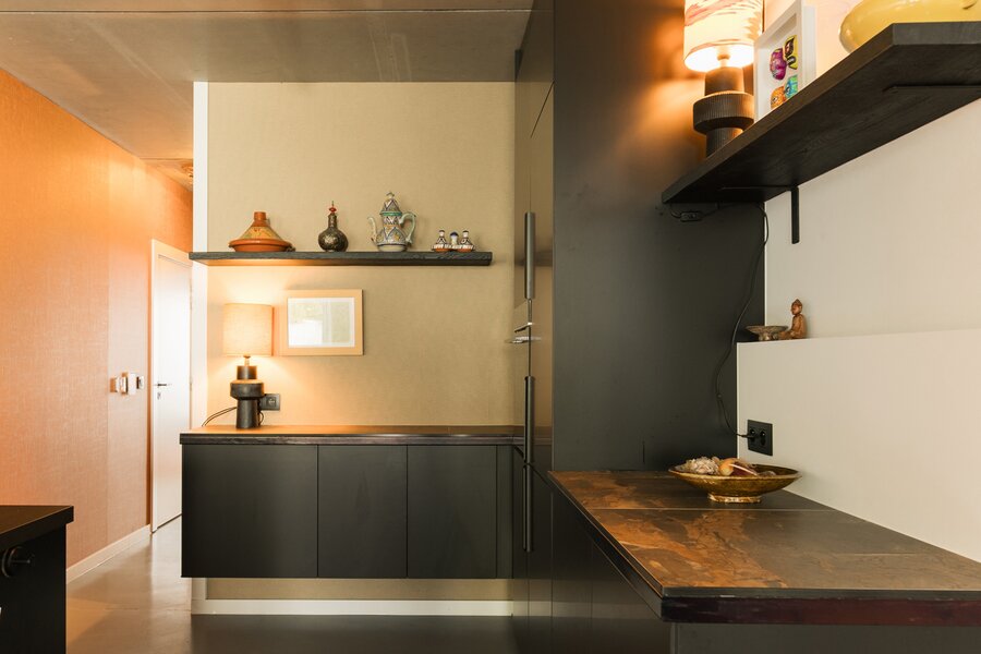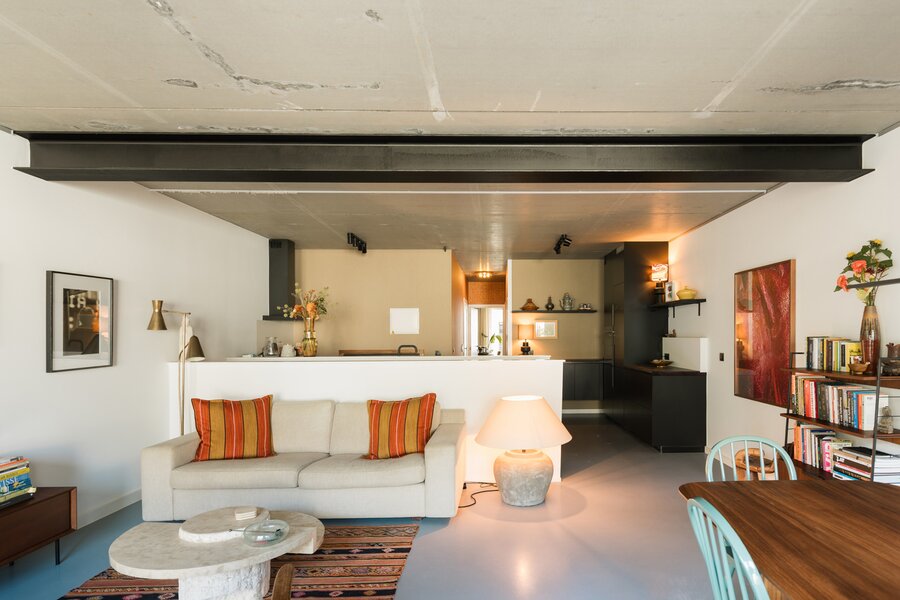 Het appartement combineert ruwe materialen met zachte tinten, veel lichtinval en een afwerking tot in de kleinste details, inclusief design verlichting.