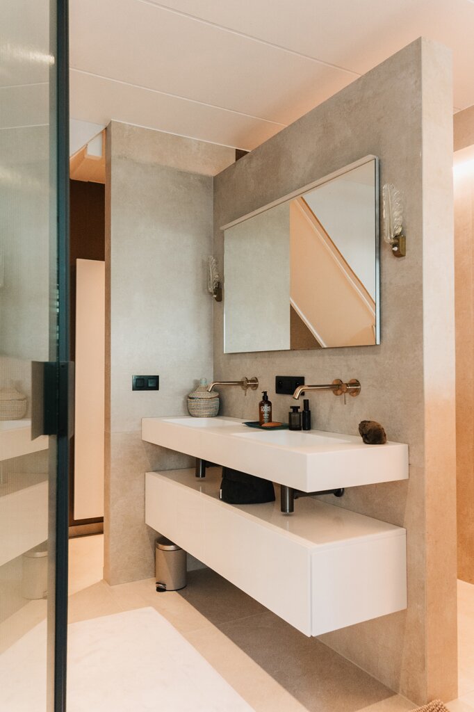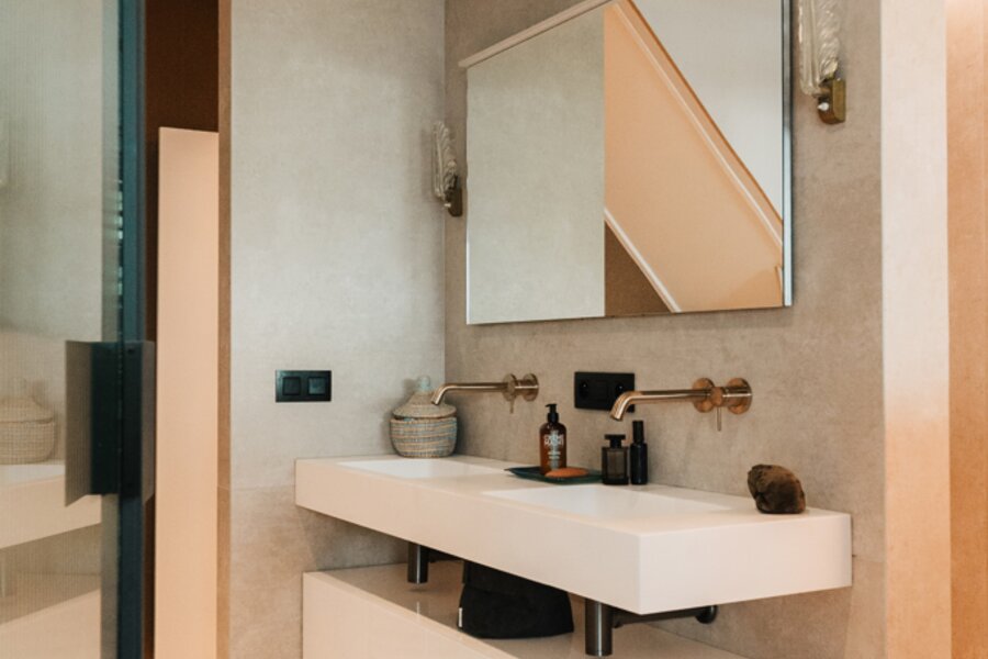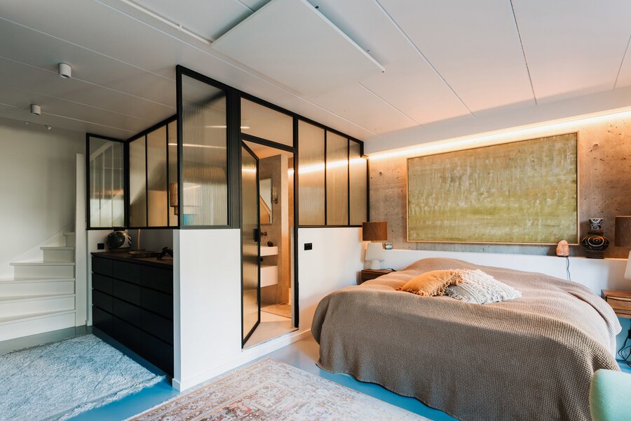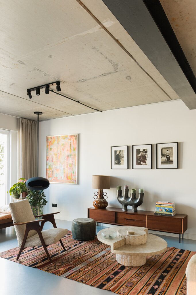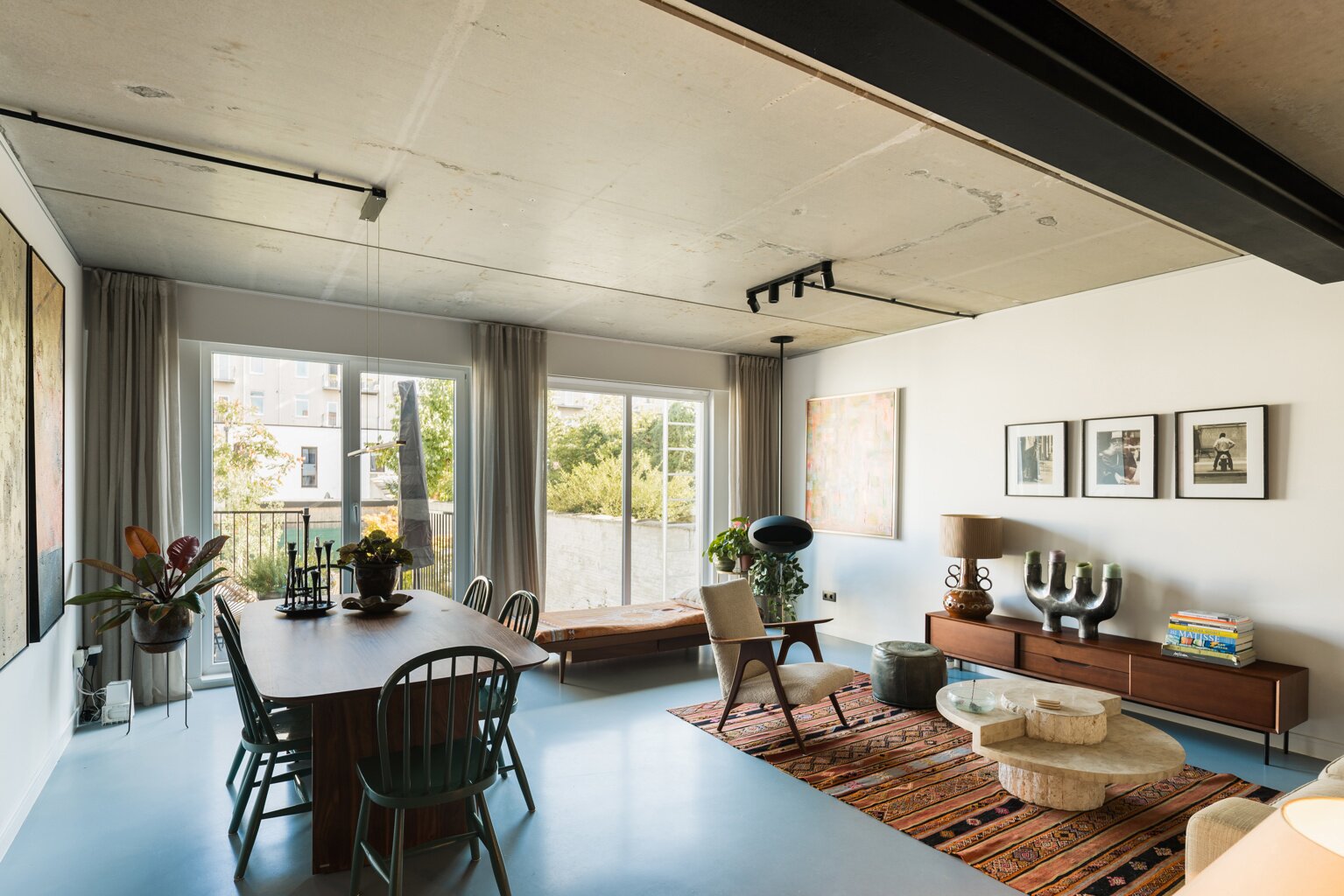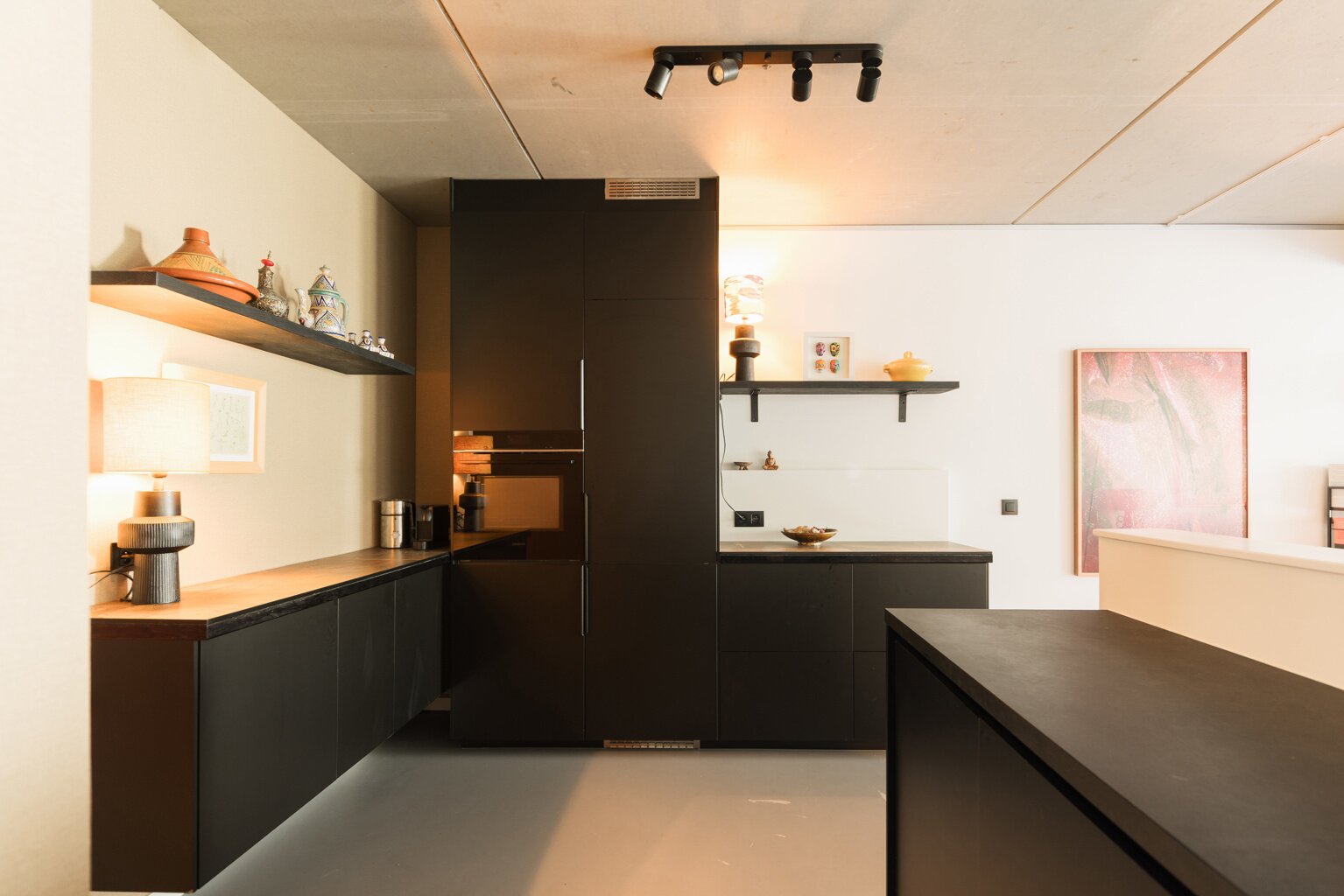 Het appartement combineert ruwe materialen met zachte tinten, veel lichtinval en een afwerking tot in de kleinste details, inclusief design verlichting.