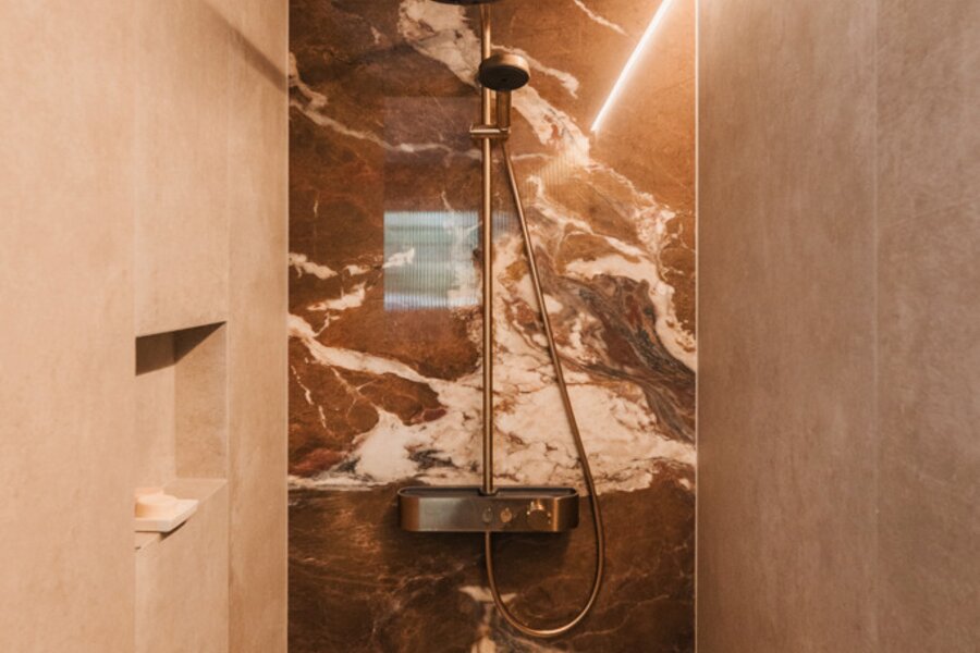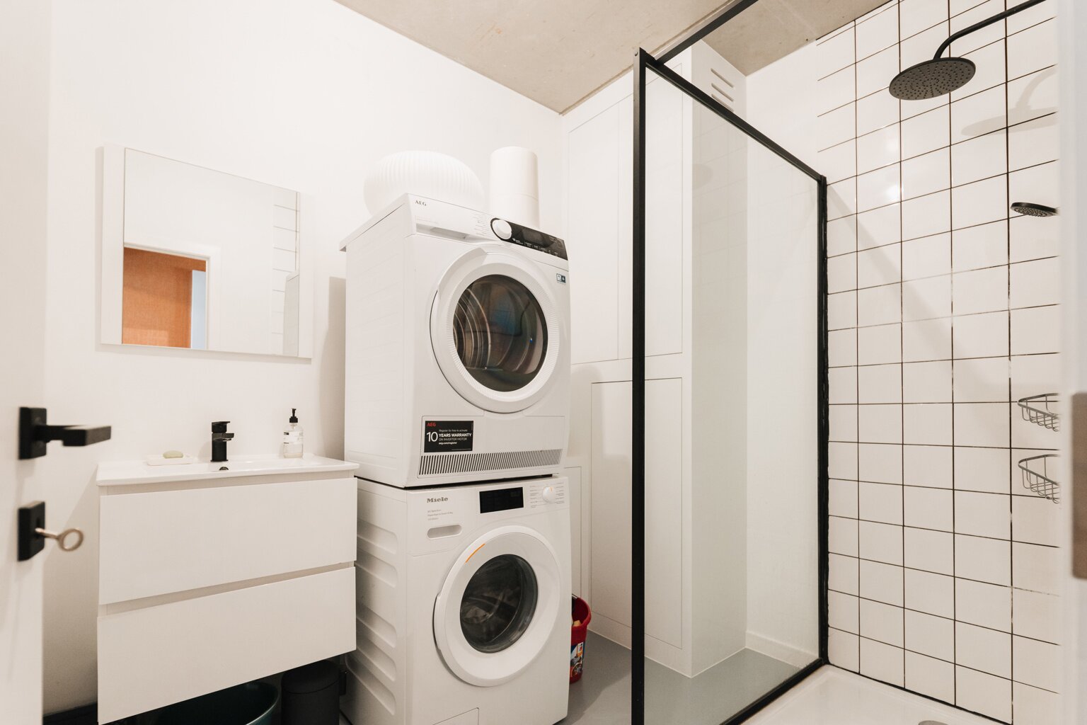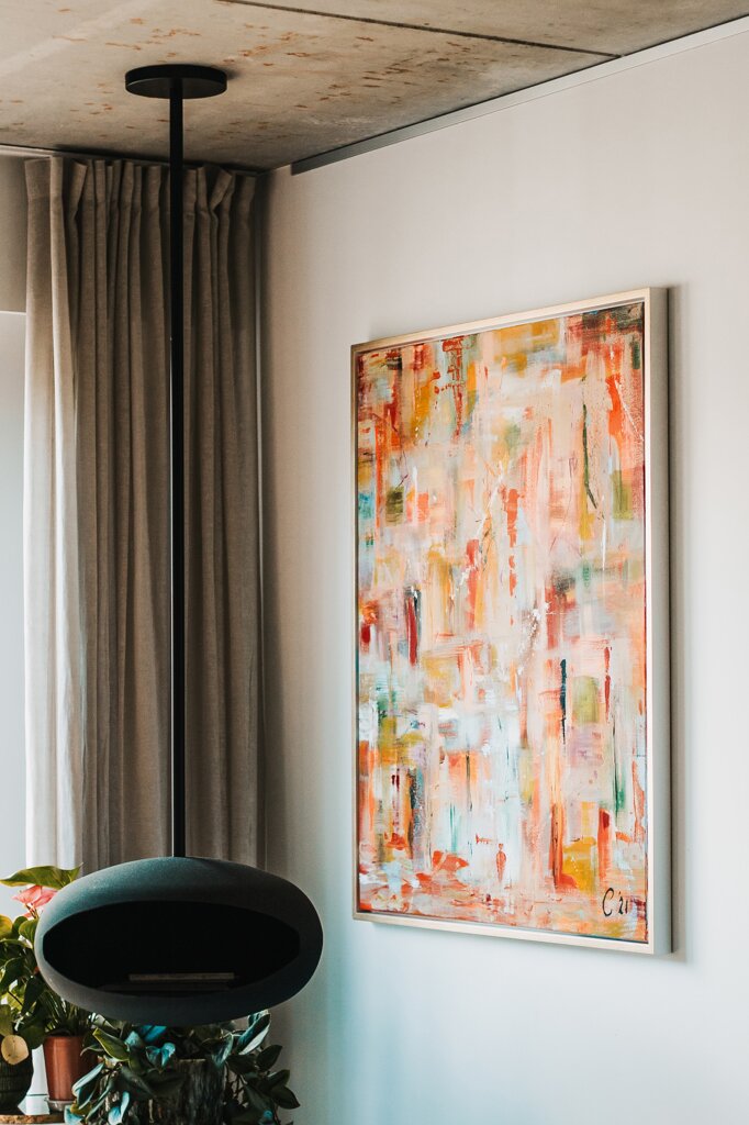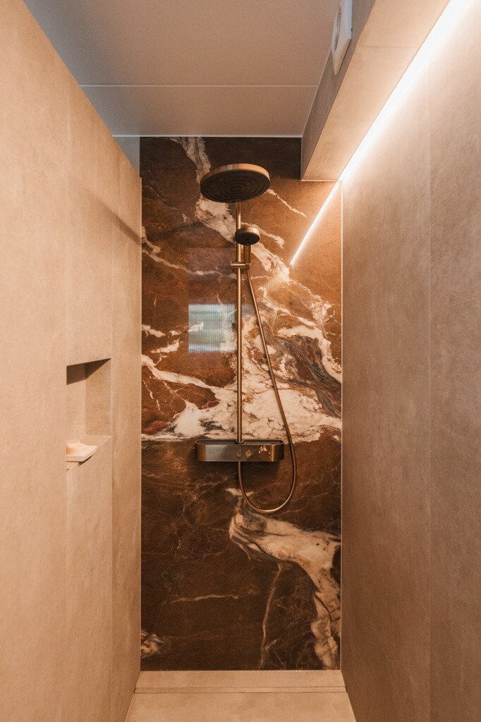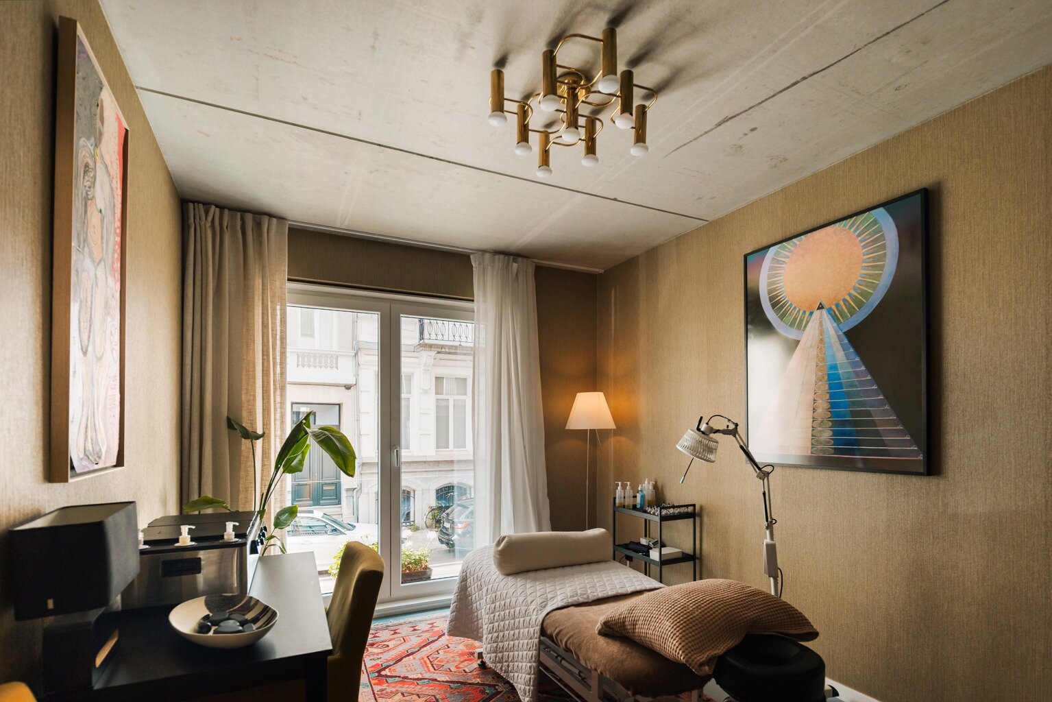 Het appartement combineert ruwe materialen met zachte tinten, veel lichtinval en een afwerking tot in de kleinste details, inclusief design verlichting.