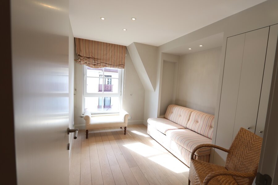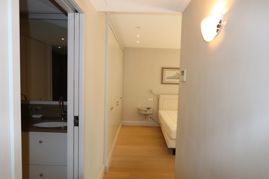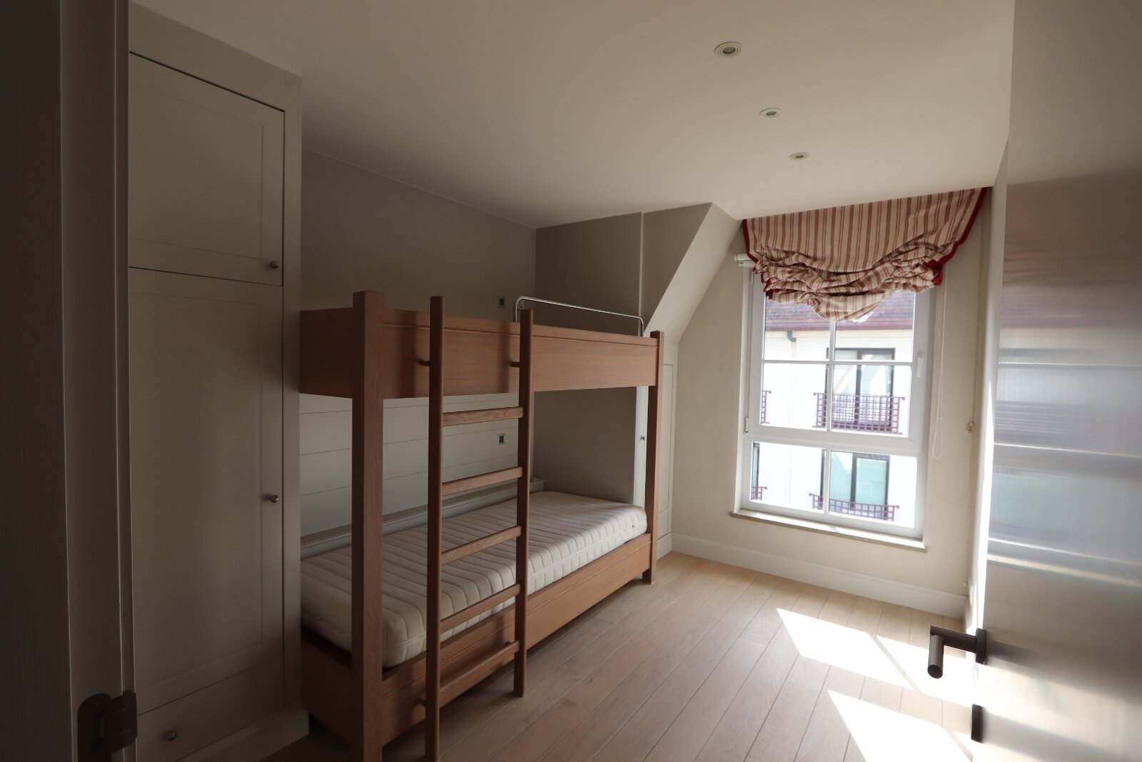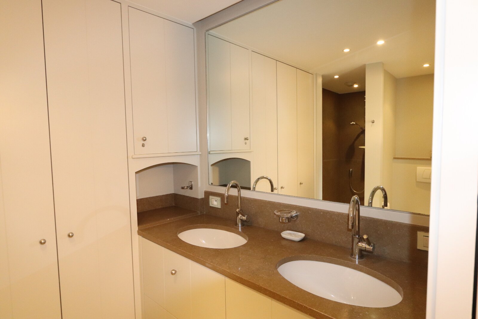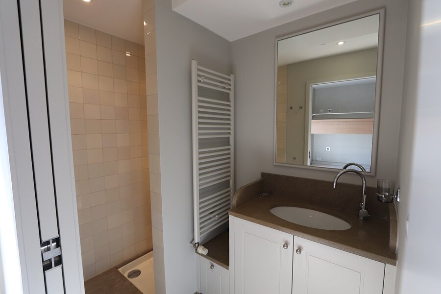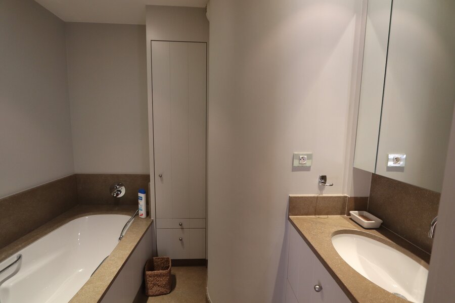 Het appartement beschikt over drie slaapkamers. De masterbedroom heeft ingebouwde kasten en een eigen douchekamer. De tweede slaapkamer is uitgerust met een zetelbed, wat deze kamer ook geschikt maakt als bureau of logeerkamer. De derde slaapkamer beschikt over een stapelbed, ideaal voor kinderen of extra gasten. Alle kamers zijn voorzien van ingemaakte kasten, wat zorgt voor een nette en efficiënte inrichting. Een aparte badkamer met ligbad biedt extra comfort.