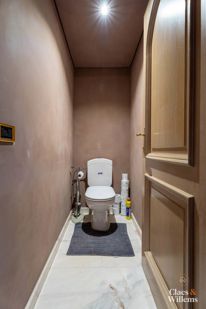 De woning is volledig onderkelderd en omvat een wasplaats, diverse bergruimtes, een wijnkelder en een garage voor drie wagens dankzij twee garagepoorten. De brede oprit biedt bijkomende parkeerruimte, wat een extra troef is voor bezoekers of klanten.
