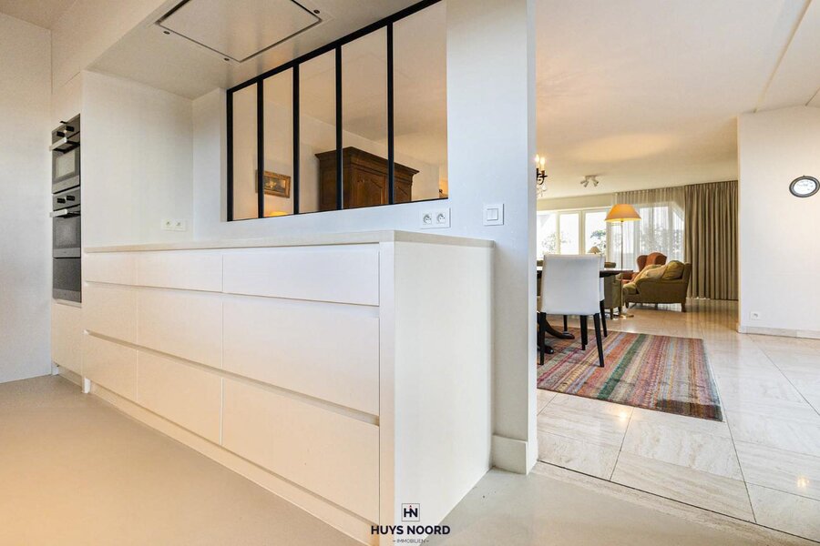 Van zodra u het appartement betreedt, wordt u verwelkomd in een aangename inkomhal met een riante glaspartij, die meteen zorgt voor een open en lichtrijk gevoel. De prachtige leefruimte baadt in het licht en straalt rust en elegantie uit, waardoor u hier echt het gevoel krijgt in een villa te wonen.