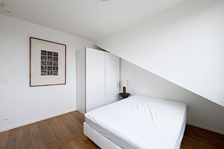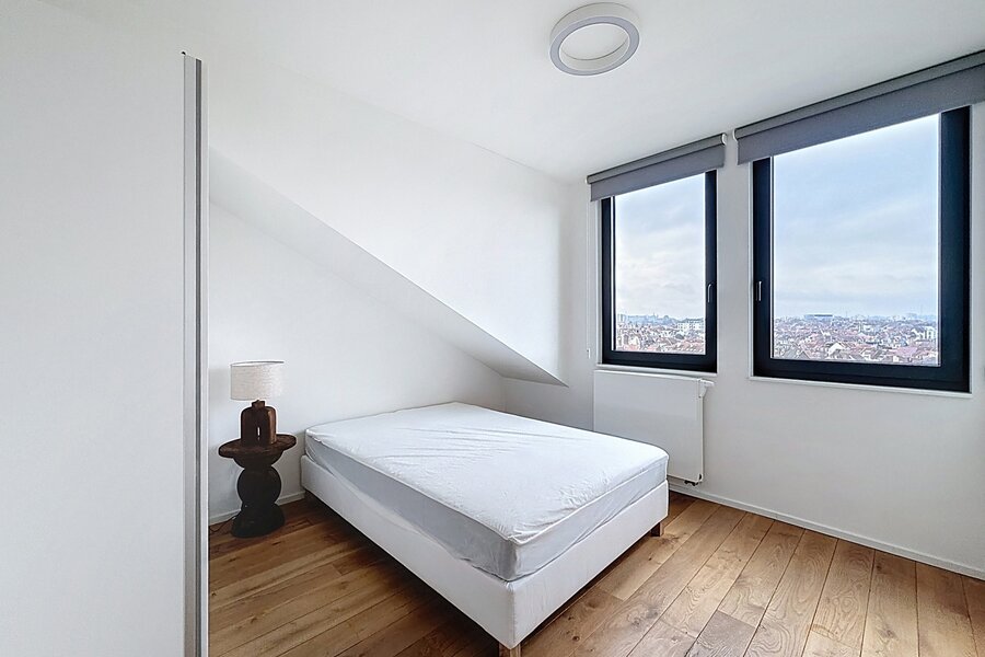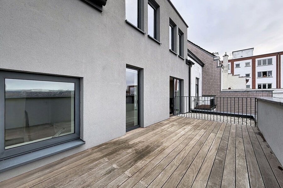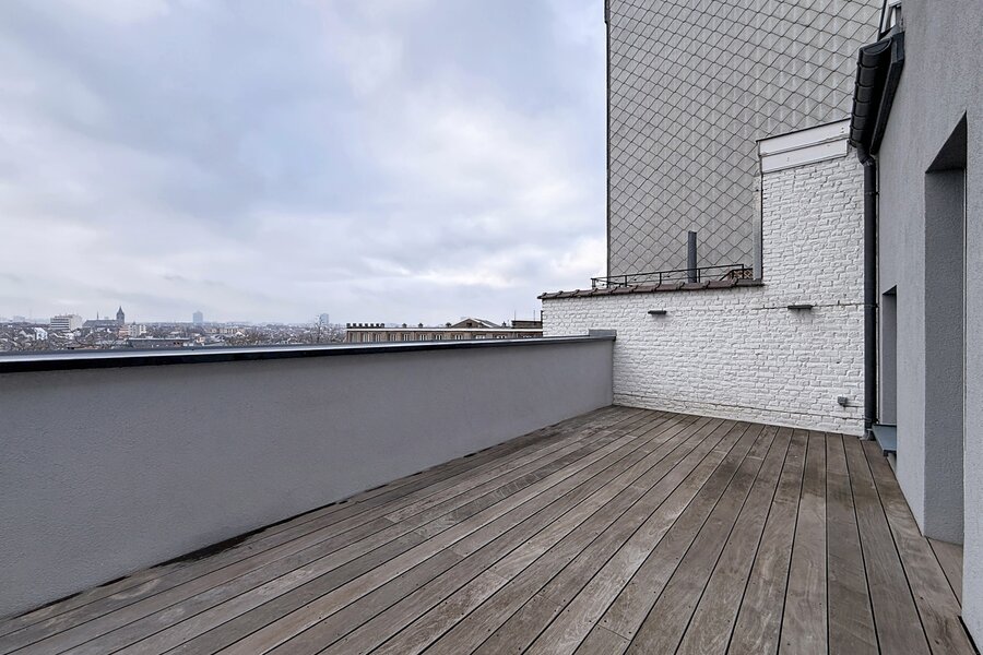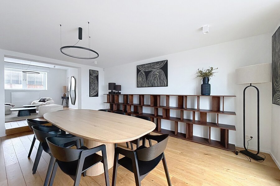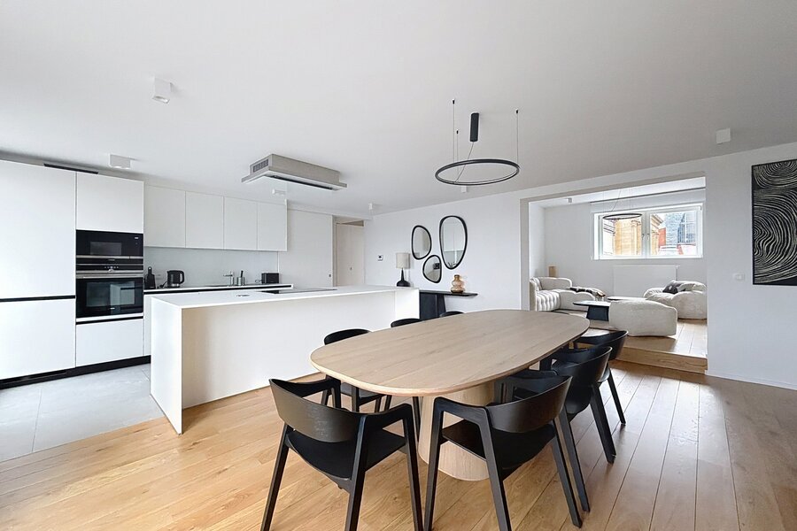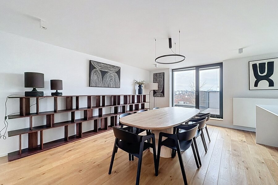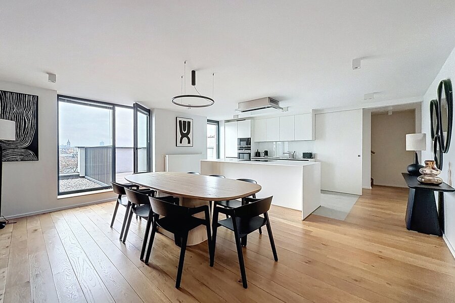 Dit prachtige, volledig gemeubileerde duplex penthouse-appartement, gelegen vlakbij de Europese instellingen en het Cinquantenaire Park, biedt circa 147 m² woonruimte in een voormalig burgerlijk huis, gebouwd in 1904 door architect Hubert Marcq. Het appartement bestaat uit een entreehal, een ruime woonkamer (circa 21 m²), een volledig uitgeruste open keuken (circa 10,35 m²) met een eethoek (circa 24 m²), een hal, drie aantrekkelijke slaapkamers (circa 15 m², 13,50 m² en 12,65 m²), een badkamer, een doucheruimte en een apart toilet. Een fraai panoramisch terras op het zuiden (circa 22 m²) is eveneens inbegrepen. In het gebouw bevindt zich een privékelder. Het appartement is voorzien van een alarmsysteem, hoogwaardige afwerking en veel natuurlijk licht. Inbegrepen services: Schoonmaak en verschoning van beddengoed om de 15 dagen, beddengoed en handdoeken aanwezig, en toegewijde klantenservice. Alle nutsvoorzieningen worden individueel gemeten. Energieprestatiecertificaat (EPC) met score C+. Ontdek het binnenkort bij Vaneau Lecobel!