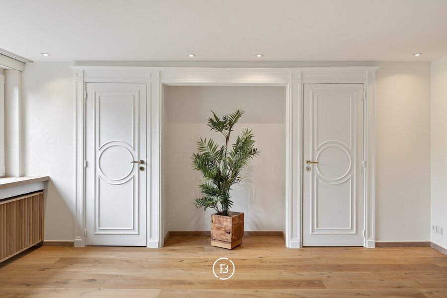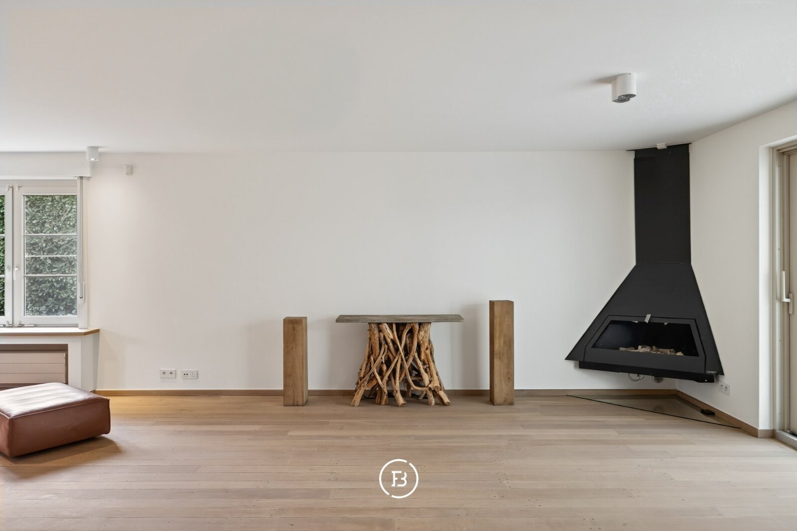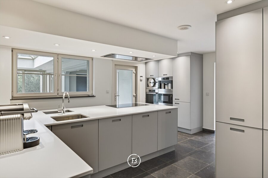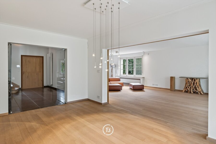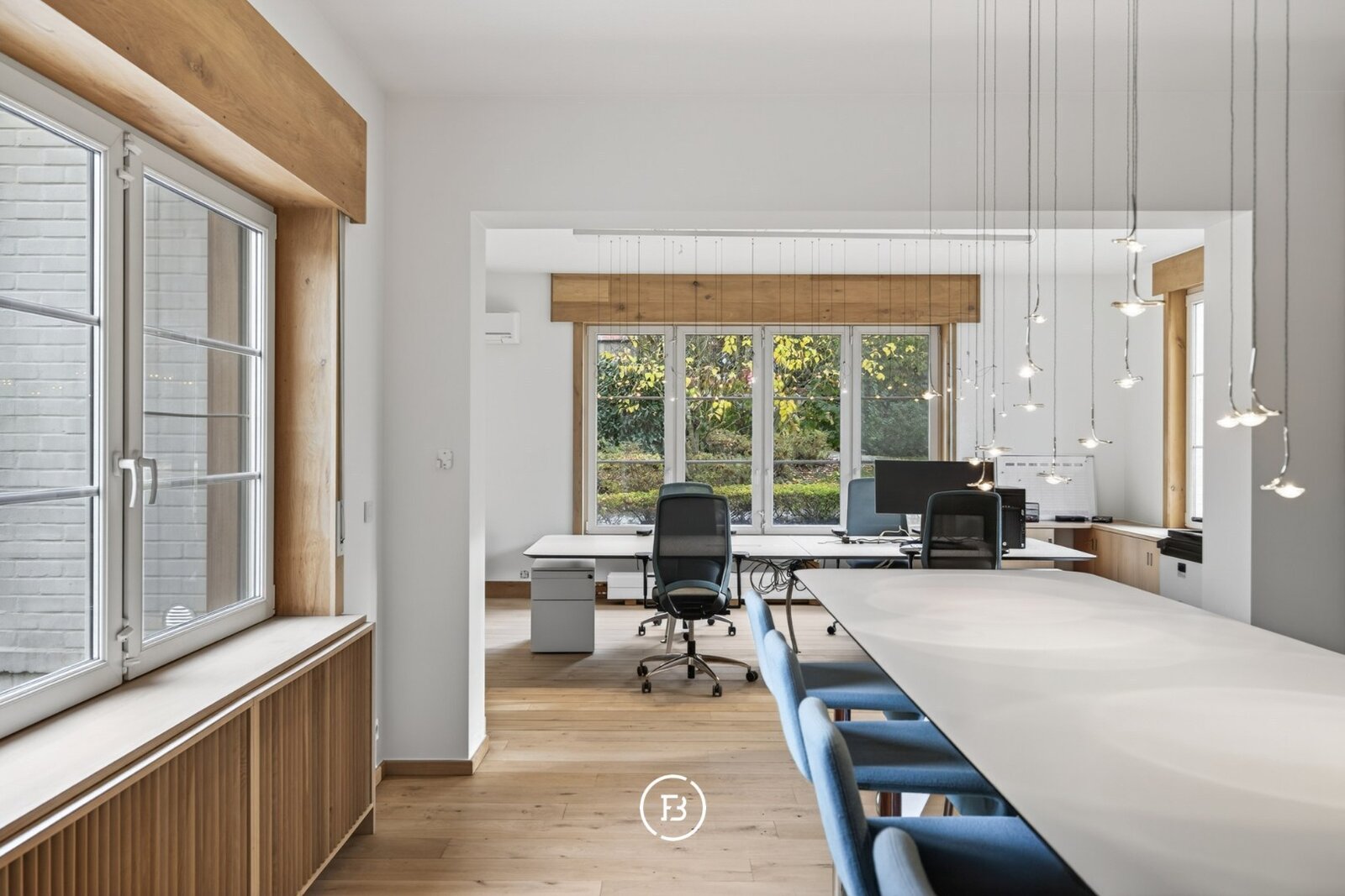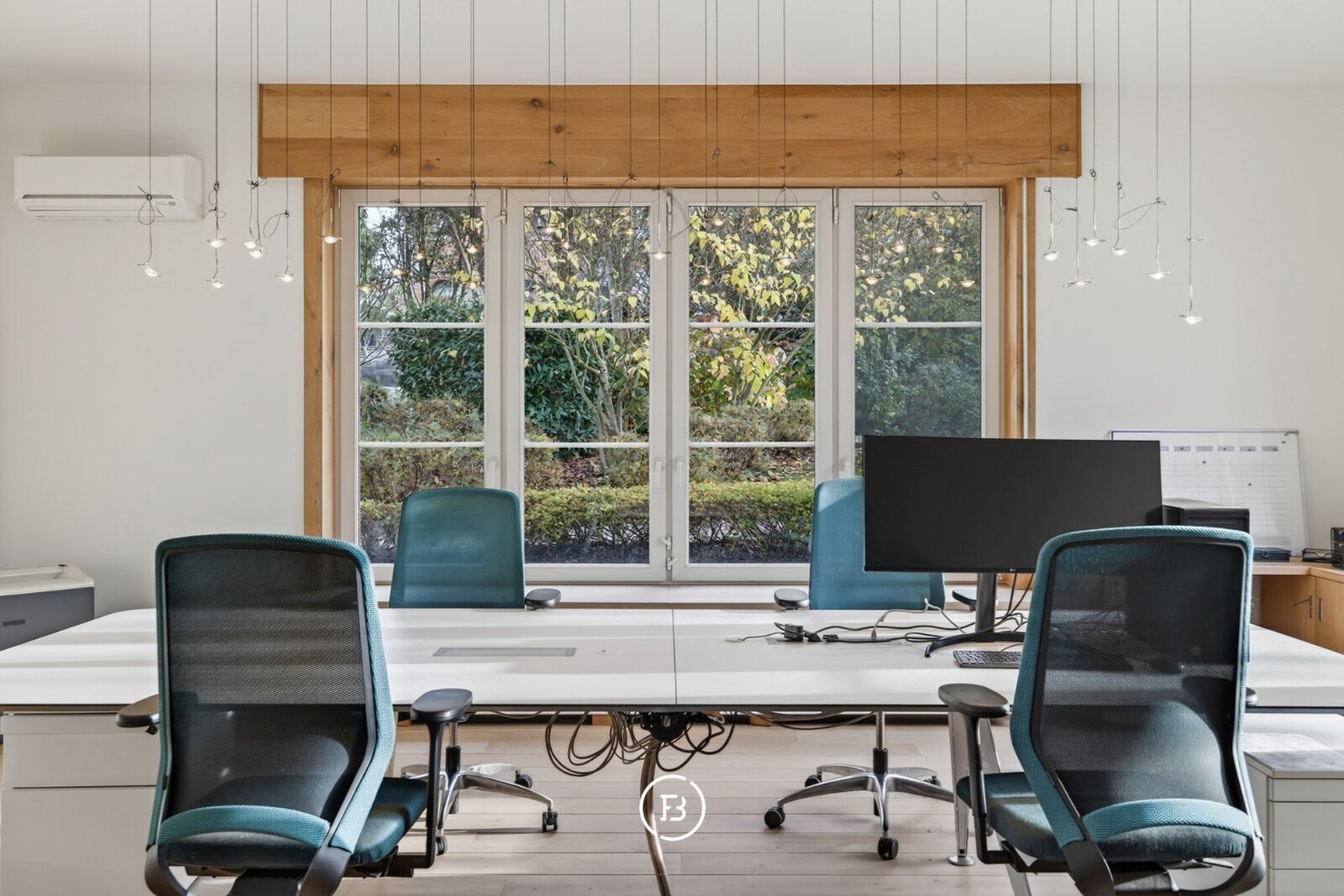 Een elegante inkomhal met gastentoilet en vestiaire leidt naar de lichtrijke leefruimtes: een volledig uitgeruste keuken, eetkamer, gezellige living en een veranda met zicht op de groene omgeving. Verder bevinden zich op dit niveau een technische ruimte, berging en een dubbele garage met extra stockage. De aparte professionele inkom geeft toegang tot het thuiskantoor, vergezeld van een wachtzone en bijkomende bureauruimte.