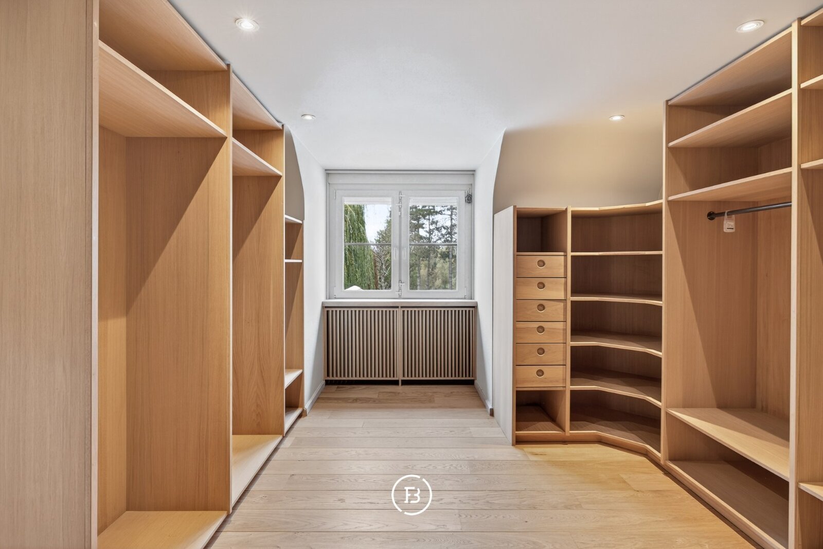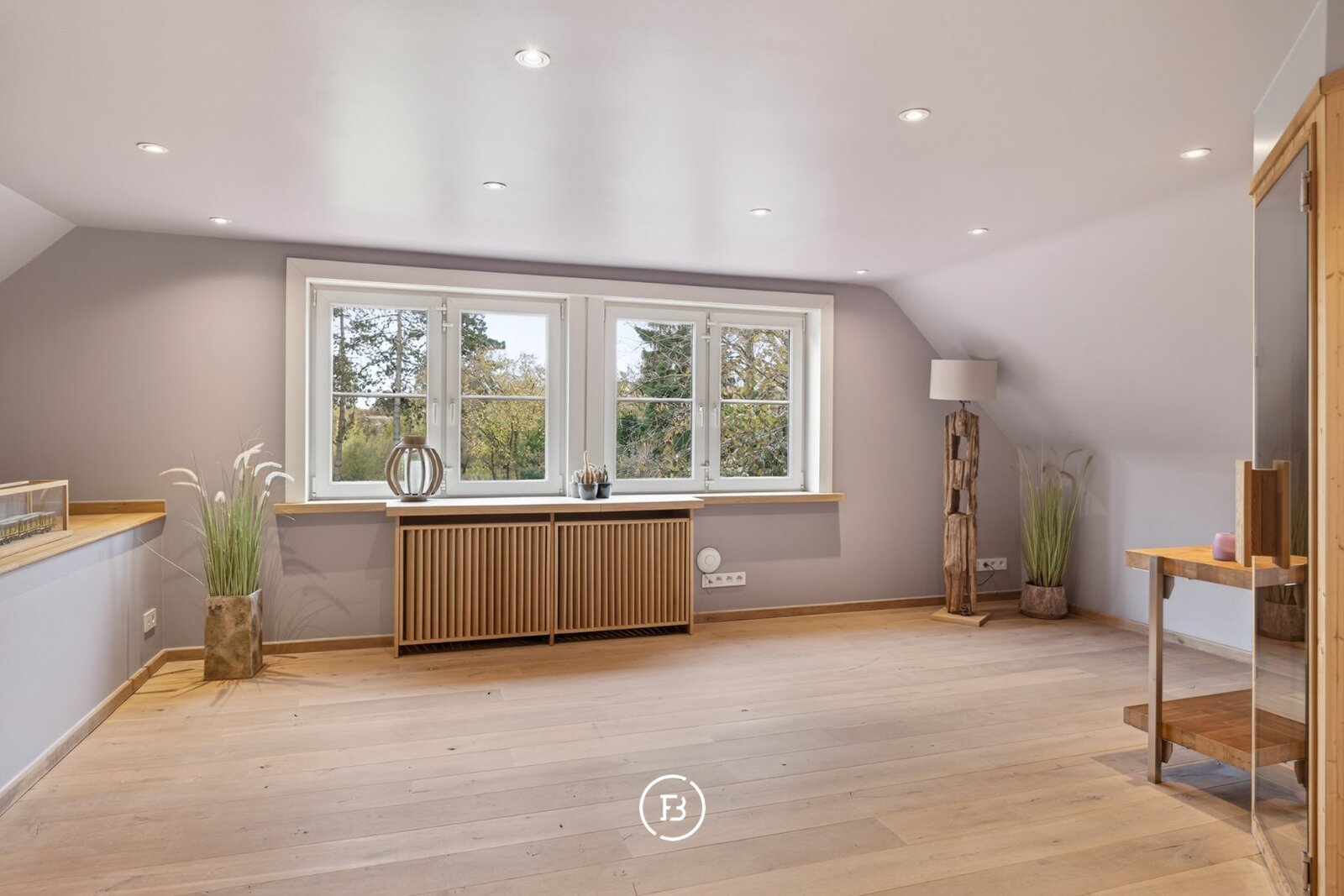 De master suite omvat een ruime slaapkamer, dressing en ensuite badkamer. Daarnaast zijn er vier royale kinderkamers met ingebouwde kasten (uitbreidbaar tot zes kamers), sauna en twee volwaardige badkamers.