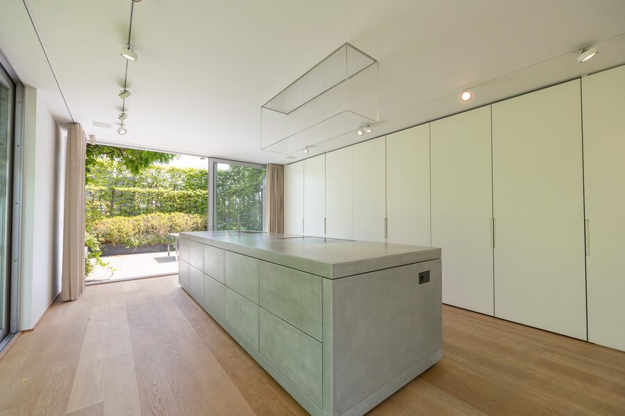 De riante leefruimte (VD2) op parketloer is voorzien van een sfeervolle open houthaard en sluit aan op een luxueuze maatwerkkeuken met een royaal keukeneiland (Gaggenau) omringd door kastruimte en meerdere bergruimtes. Dankzij de grote schuiframen loopt deze ruimte naadloos over in een schitterend zonneterras en de omliggende tuin.