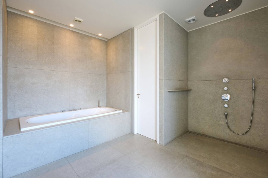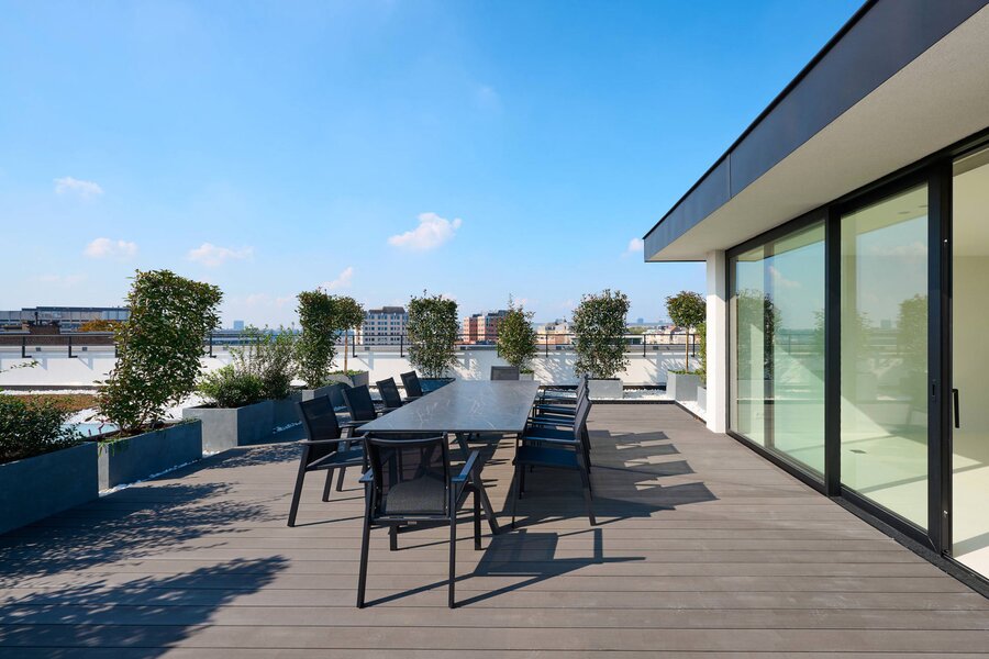 Het appartement bestaat uit een hal met een toilet, een ruime open woon-/eetkamer met balkon en een aparte semi-professionele keuken met een ontbijthoek en een klein terras. De hoofdslaapkamer beschikt over een aparte dressing en een complete badkamer (bubbelbad, aromatherapiedouche). De drie andere suites hebben elk een eigen dressing en een eigen badkamer/douche. Boven is er een ruimte die kan worden gebruikt als tweede ontvangstruimte met directe toegang tot de perfect georiënteerde terrassen en een spectaculair uitzicht over Brussel. Een bioscoopzaal completeert deze verdieping.