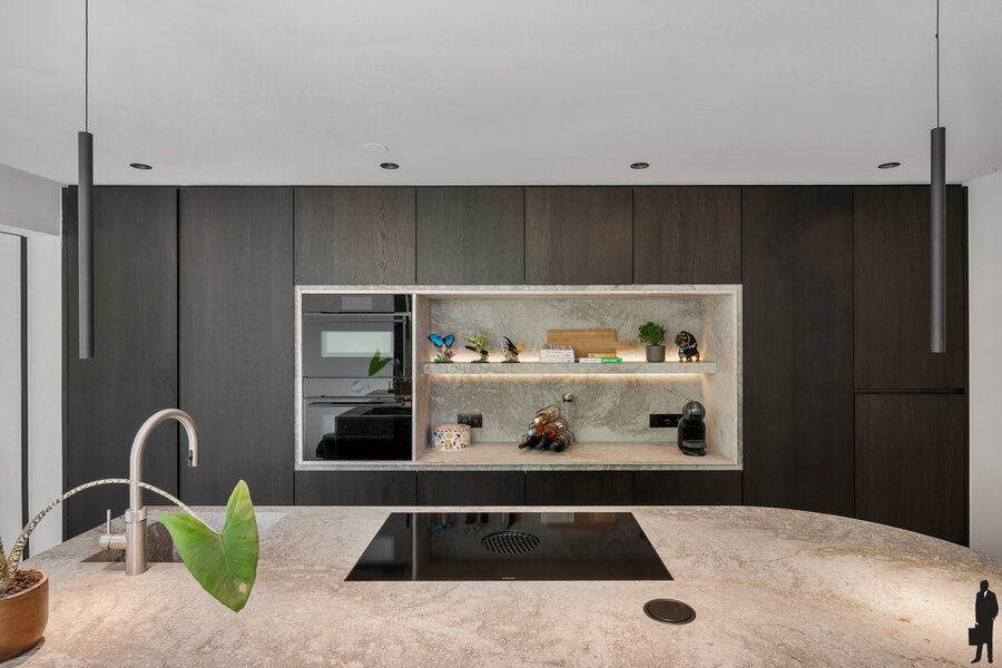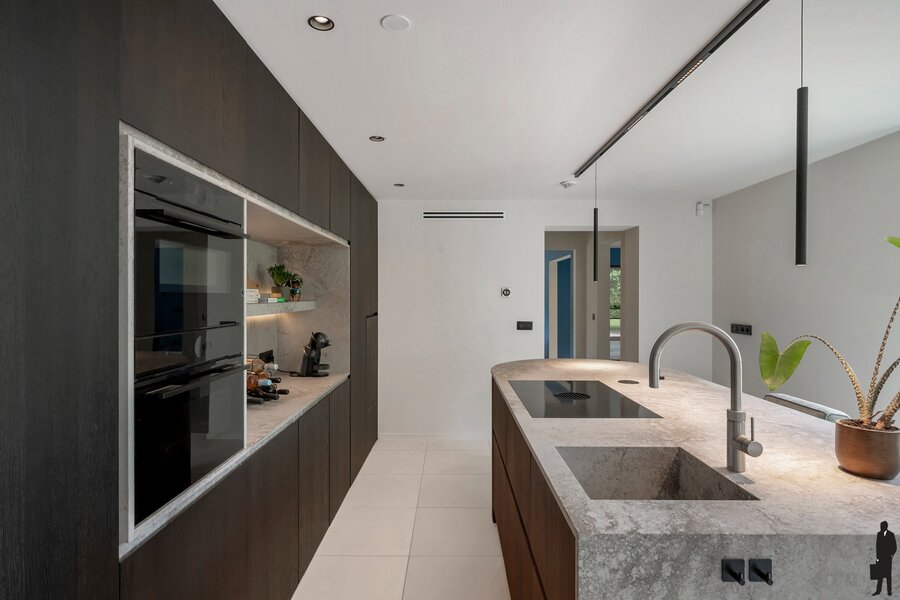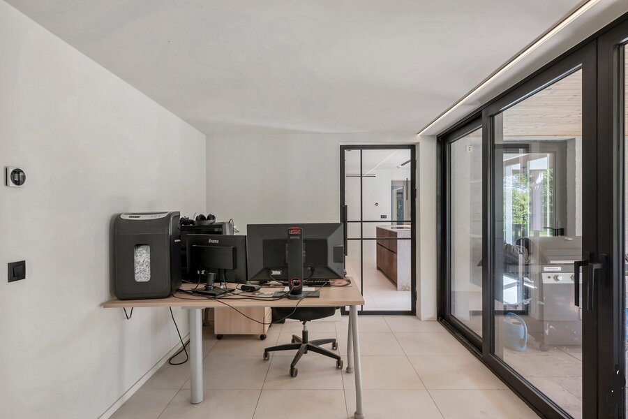 De nieuwe keuken is voorzien van een kookeiland , kastenwand en is voorzien van luxe inbouwapparatuur.Aangrenzend is er een handige berging. De ruime inpandige garage biedt plaats aan 2 auto's en is voorzien van een elektrische poort. Tot slot is er nog een kantoorruimte en een ruimte met een inloopdouche en toilet.