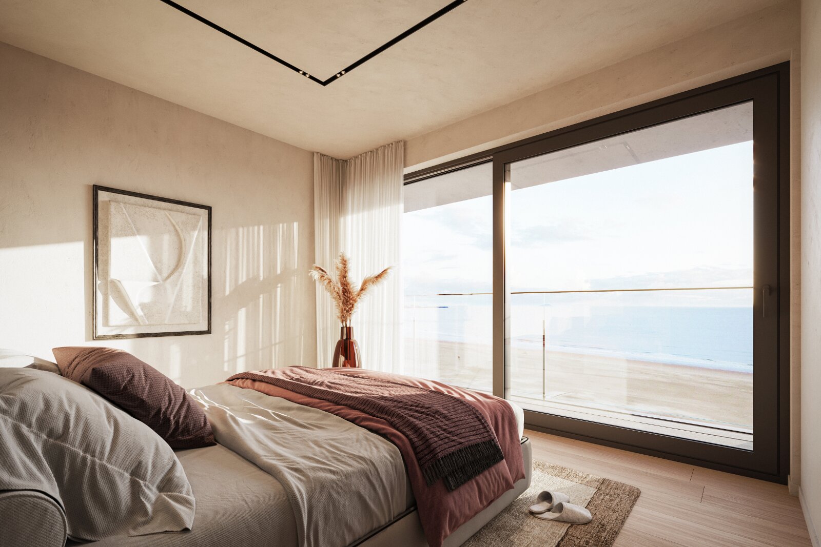 Het appartement beschikt over drie slaapkamers, waarvan 2 met toegang tot een ruim terras achteraan en de master gelegen aan de zeekant. De twee slaapkamers delen een badkamer, uitgerust met douche en dubbele lavabo, gelegen op de nachthal. De master heeft zijn eigen badkamer met 2 wastafels, toilet en inloopdouche.