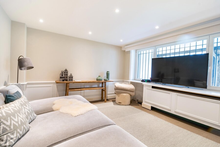 De woning bestaat op het gelijkvloers uit een inkomhal met vestiaire en gastentoiletten, recepties met open haard, eetkamer, open "Siematic" keuken en ontbijtruimte met toegang tot het terras en de tuin op het zuid/oosten. Op de eerste verdieping een hoofdslaapkamer met kleedkamer en en-suite douchekamer en een tweede slaapkamer met badkamer. Op de tweede verdieping, een kantoor, een derde slaapkamer met en-suite badkamer en terras. Op de derde en laatste verdieping is de zolder verbouwd tot speelkamer/kantoor. Het huis bestaat op de benedenverdieping uit een wasruimte, serviceappartement met een slaapkamer en een doucheruimte, toegang tot de tuin, stookruimte, werkplaats, wijnkelder, Engelse binnenplaats evenals een garage en zijn oprit. .