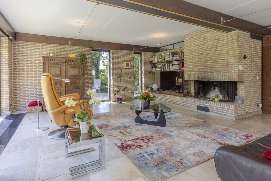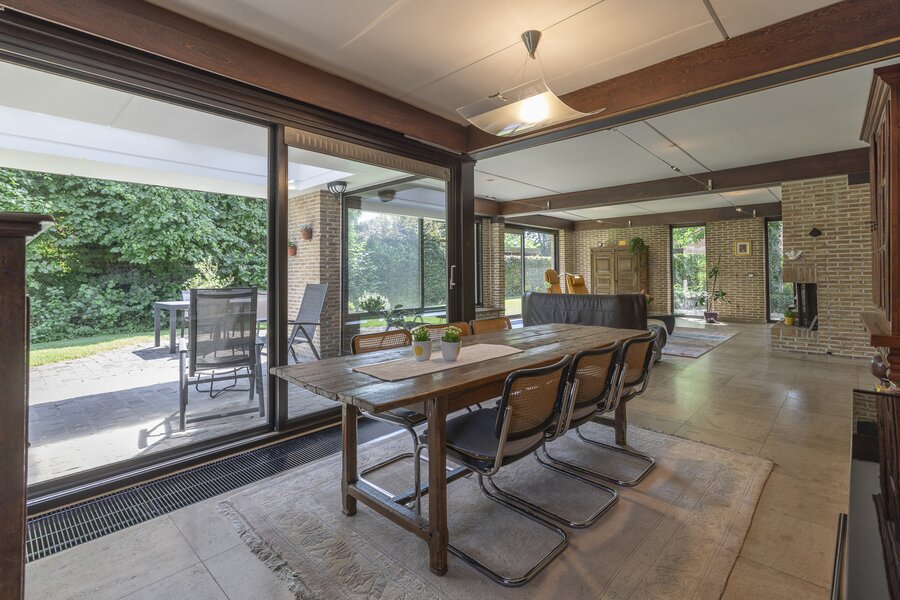 Anderzijds opent de hall tot grote leefruimte die zich uitstrekst langs de zuidelijke achtergevel van de woning, met oppervlakte van +/- 70m² en grote raampartijen biedt de leef- en eetplaats alle comfort en toegang tot de tuin.