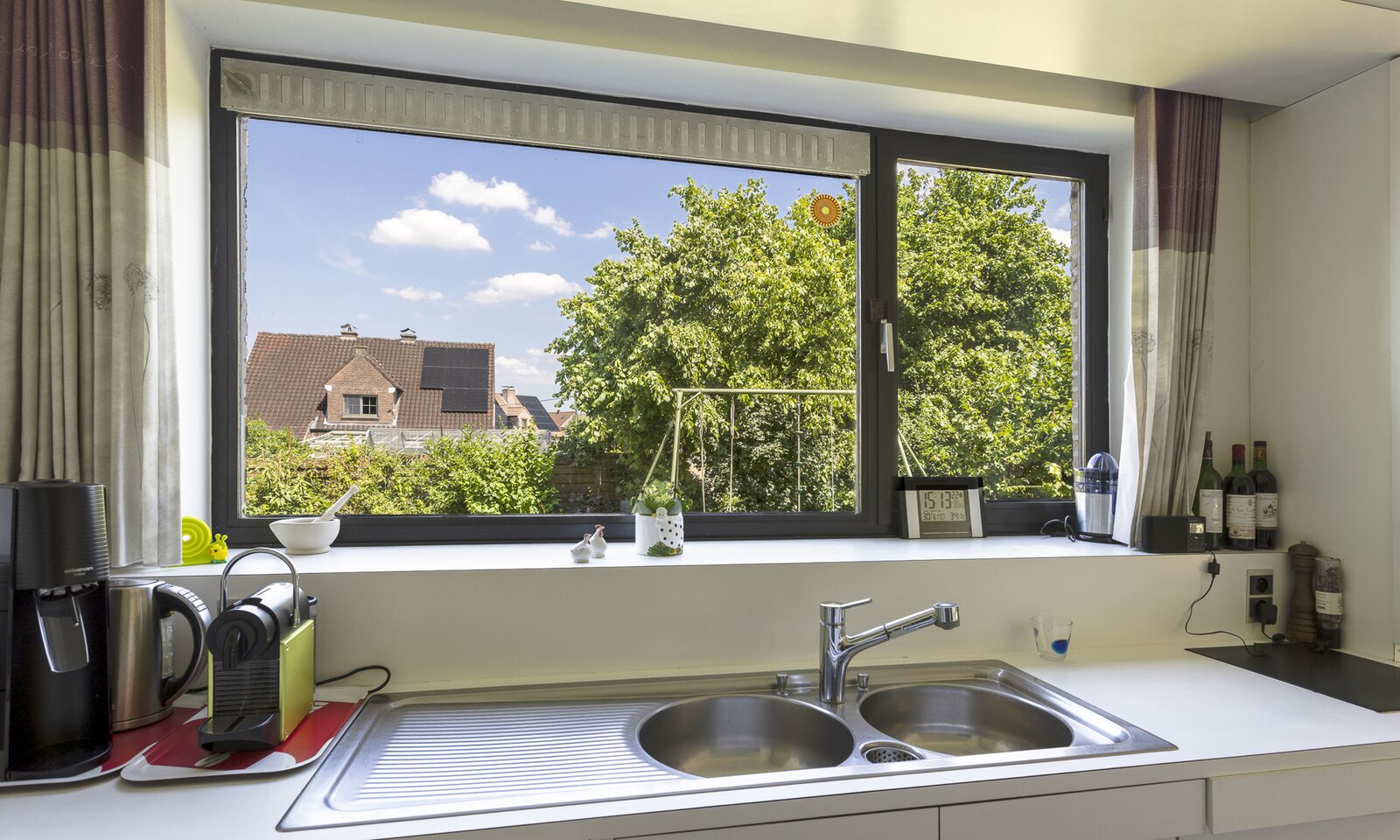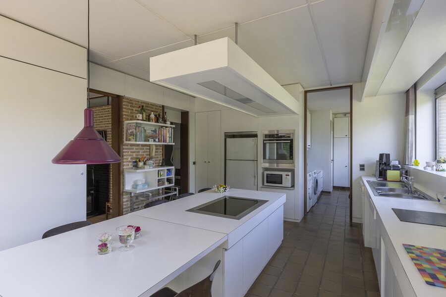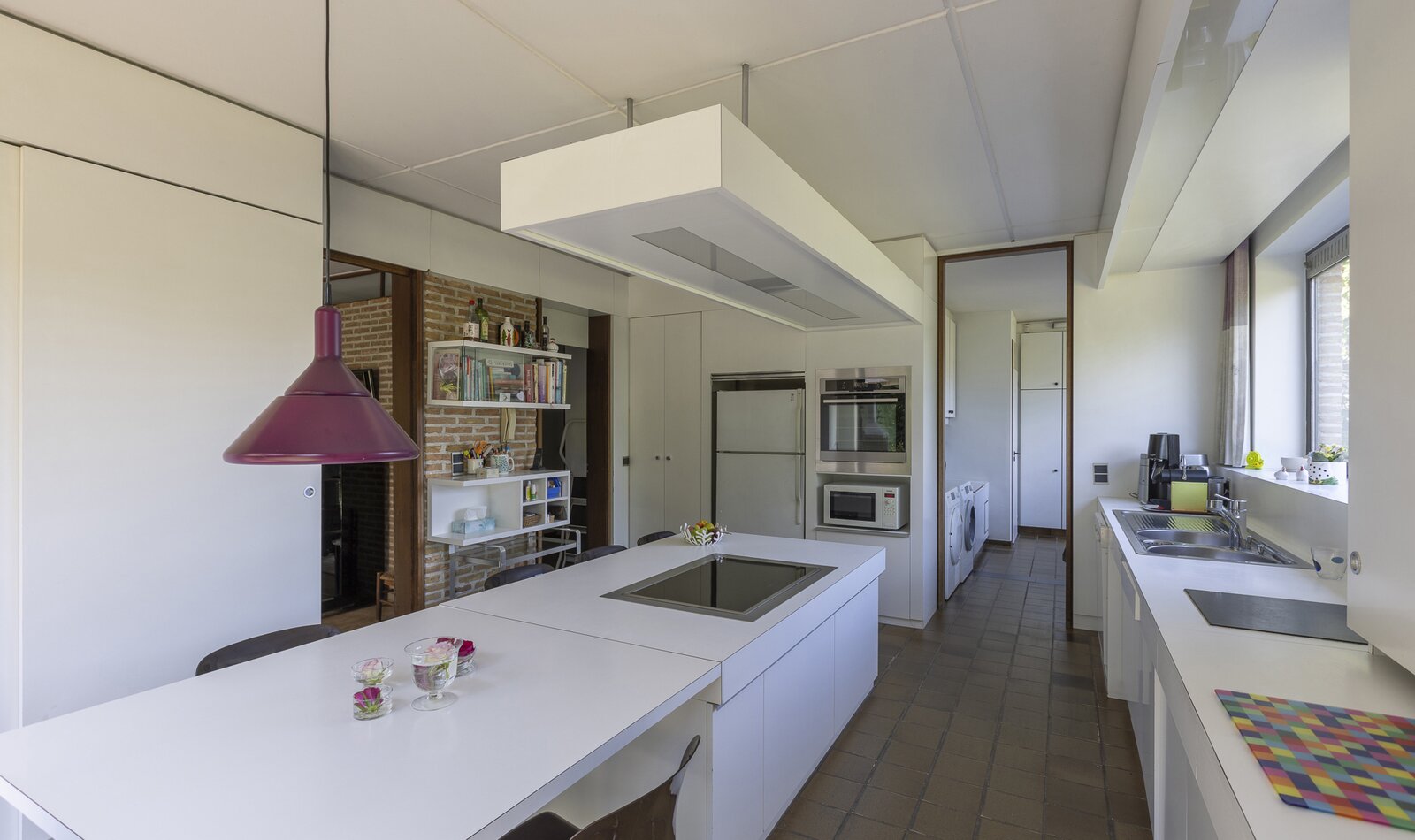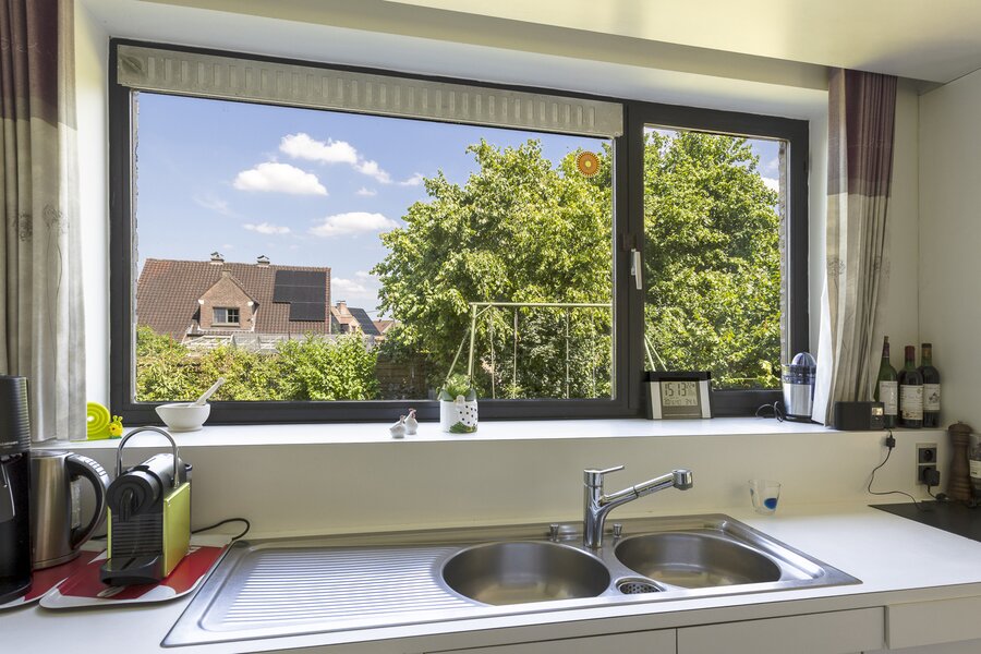Ook de gesloten Top Moutonkeuken is voorzien van schuifraam tot de tuin. Aangesloten hier vinden we een praktische bijkeuken/wasplaats die op haar beurt toegang voorziet tot de inpandige garage (voor 2 wagens) met extra bergplaats en koele berging.