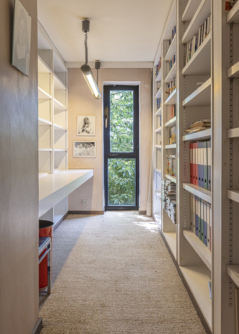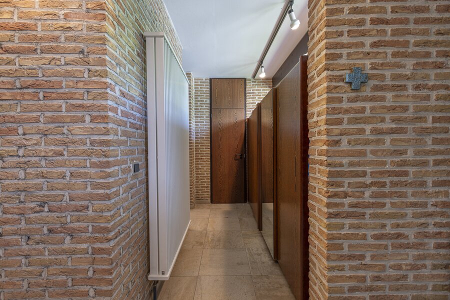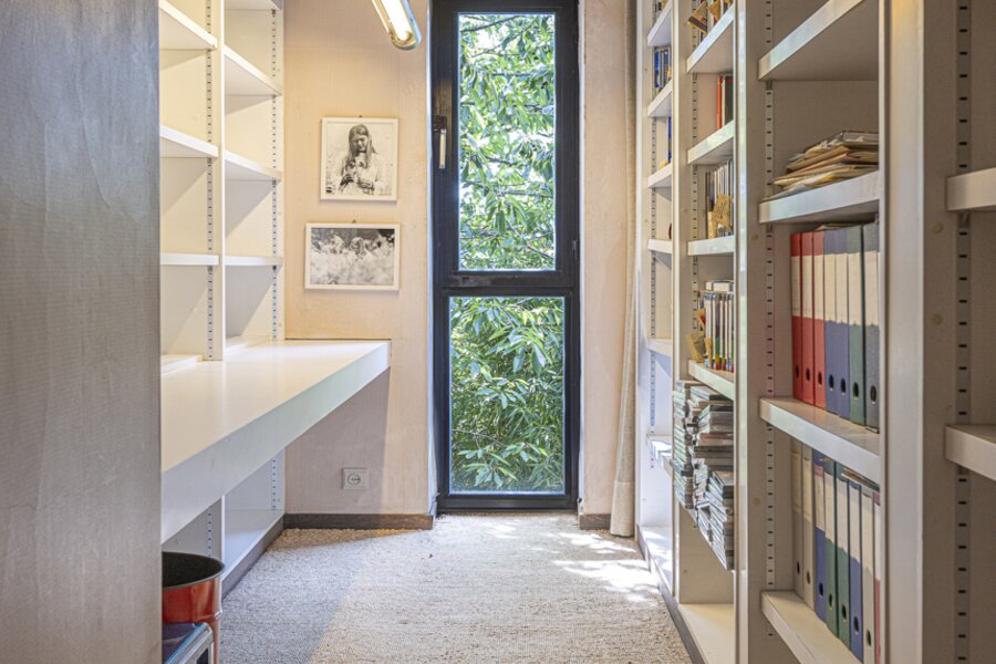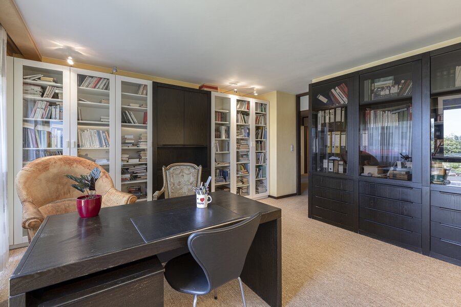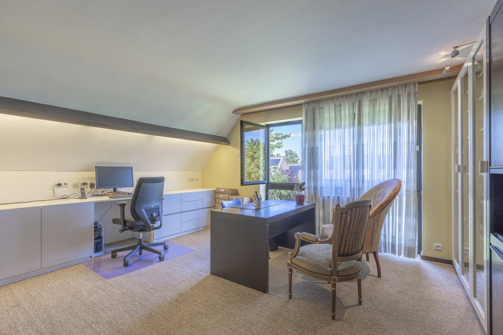 Langsheen een ruime inkomhal met maatwerk-vestiaire in terugkerend Wengéhout, voorzien van eigen toilet is een leuk bureel/hobbykamer/praktijk- of therapieruimte te ontdekken.