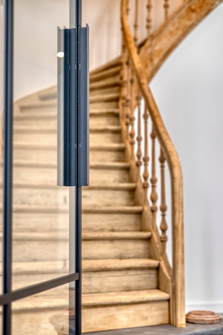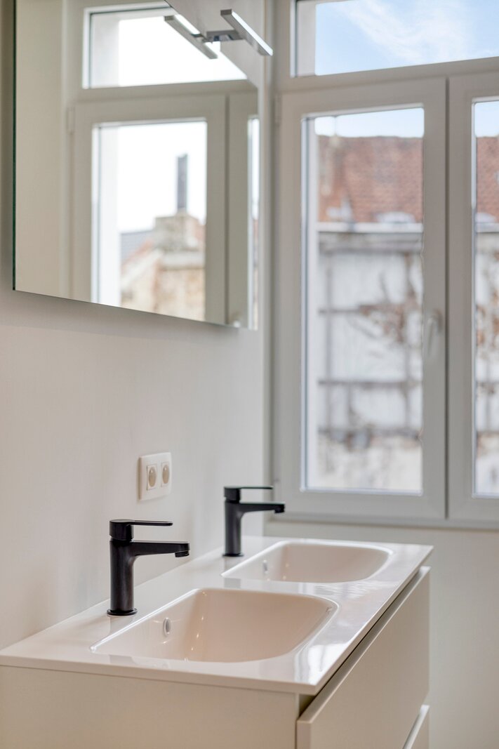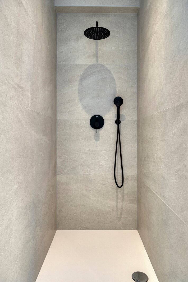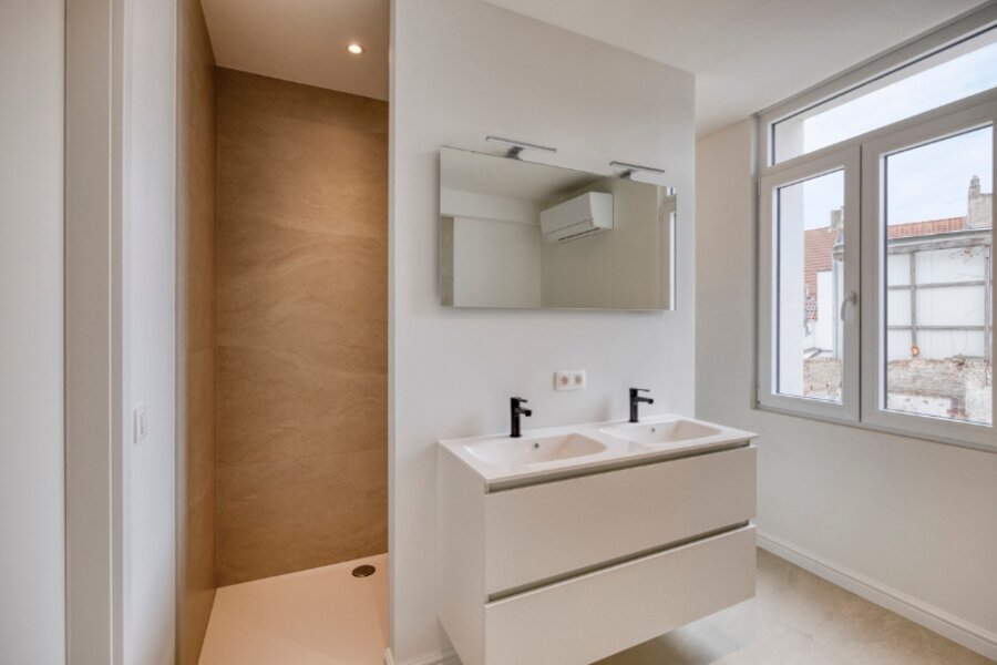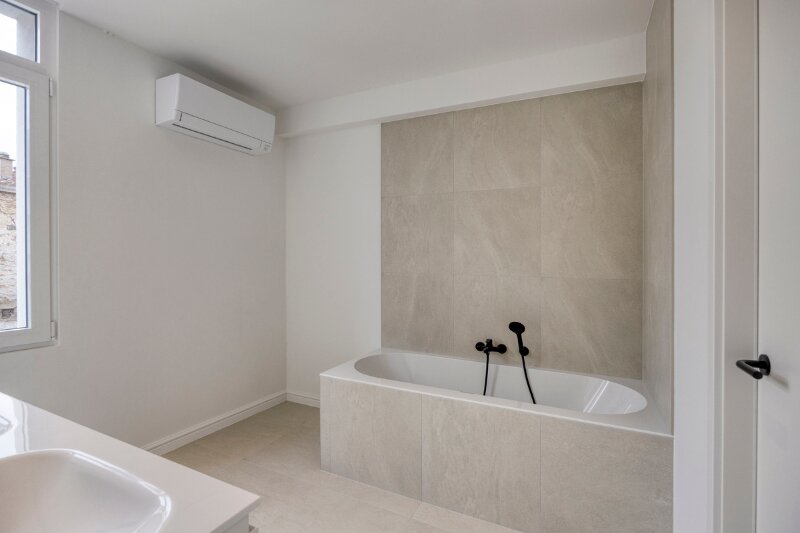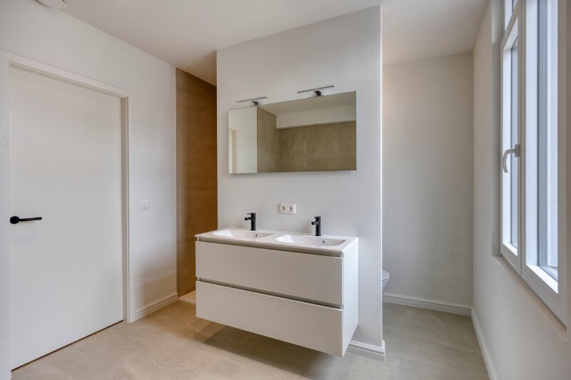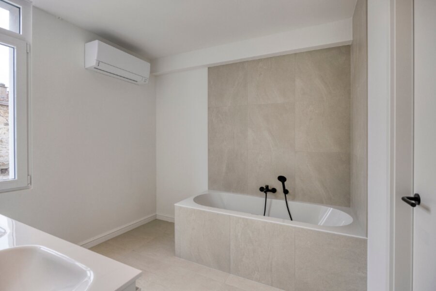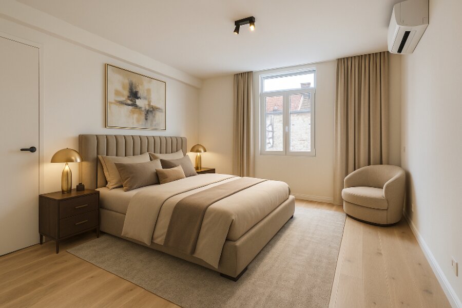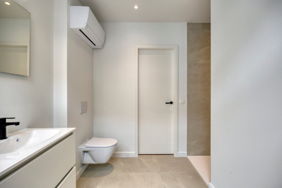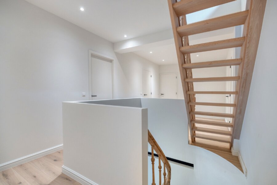 Op de eerste verdieping bevindt zich een ruime overloop, ideaal om in te richten als bureau of leeshoek. De drie volwaardige slaapkamers zijn allen ruim en elegant afgewerkt. De masterbedroom beschikt bovendien over een aparte ruimte die perfect kan dienen als dressing, én een luxueuze badkamer met zowel ligbad als inloopdouche, alles uitgevoerd in een verfijnde stijl. De woning wordt verwarmd met een energiezuinige warmtepomp die in de zomer tevens zorgt voor aangename verkoeling dankzij geïntegreerde airconditioning.