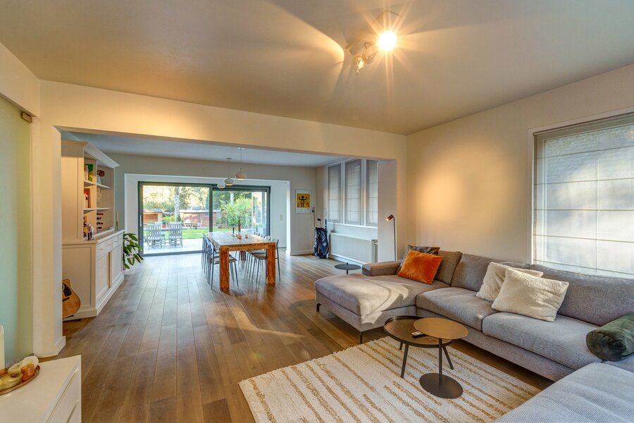 Ruime inkomhal met gastentoilet, inmaakkast en toegang tot de droge kelder. De ruime leefruimte met zithoek en eetkamer op parketvloer is voorzien van een mooie hoeveelheid lichtinval vanwege de vele ramen en open indeling. Op elk moment kan u genieten van de prachtige tuin rondom de woning. Aan de achterzijde werd een bureauruimte voorzien, ideaal voor thuiswerk. De keuken met grote raampartijen en tuinzicht is het hart van deze woning en werd voorzien van alle nodige toestellen en een ontbijthoek.
