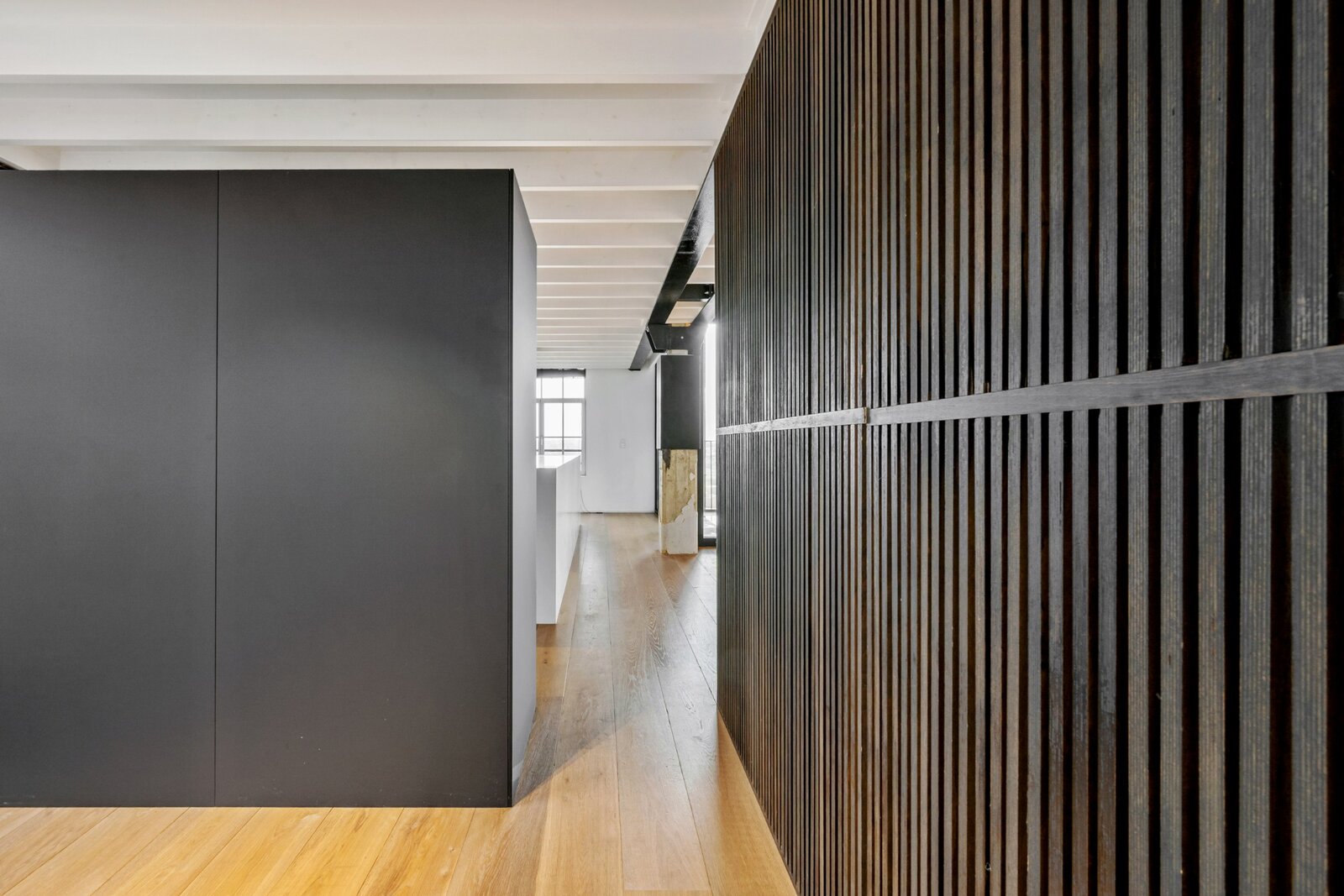 Deze loft werd afgewerkt met hoogwaardige en luxueuze materialen, met behoud van het industriële karakter en prachtige hoge plafonds die het ruimtegevoel versterken.