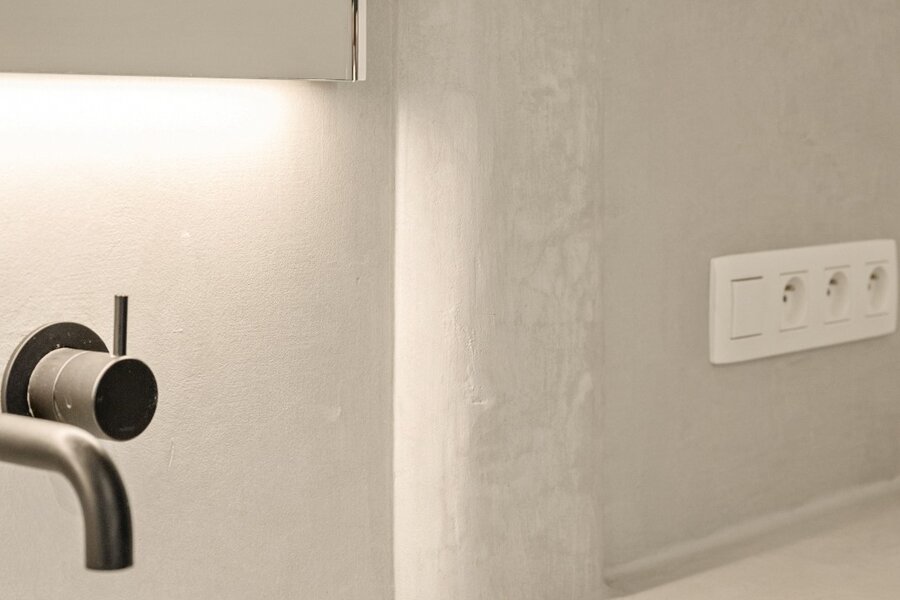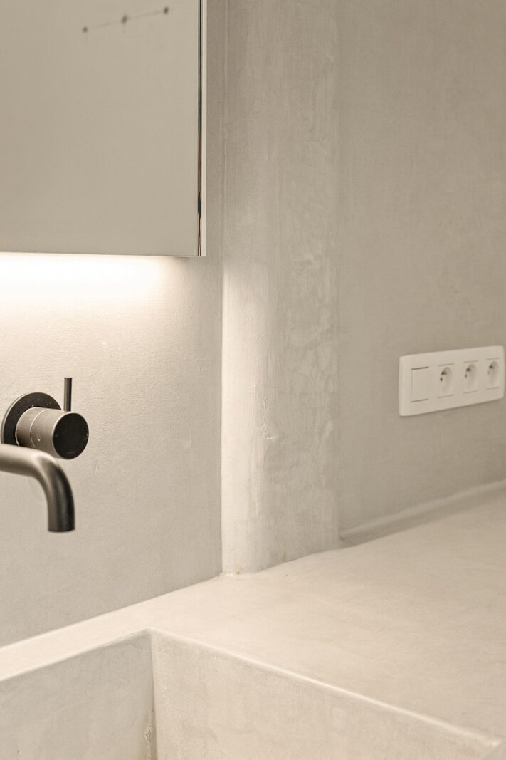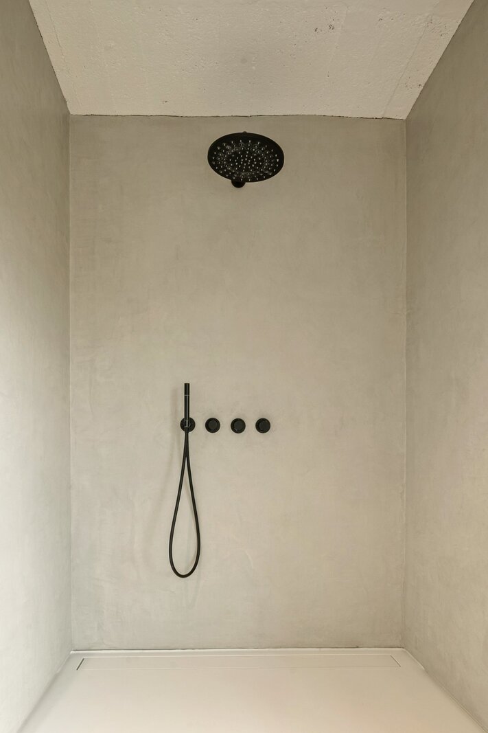 De badkamer is stijlvol afgewerkt in mortex en beschikt over: