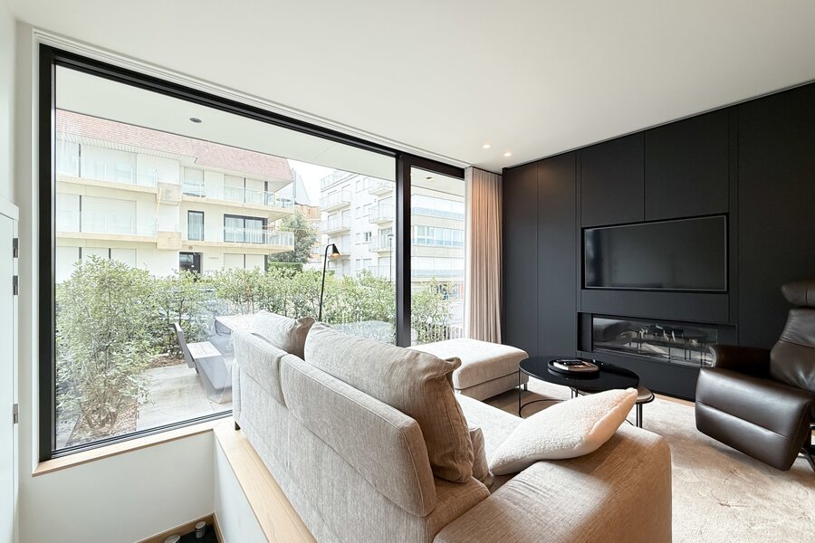 De lichtrijke woonkamer met grote raampartijen geeft uit op een aangenaam terras met zijdelings zeezicht, waar u kunt genieten van zon en zee. De leefruimte is uitgerust met een sfeerhaard, ingemaakte kasten en een open keuken met praktisch kookeiland en eetgedeelte. Aansluitend bevindt zich een berging met aansluiting voor was- en droogautomaat.