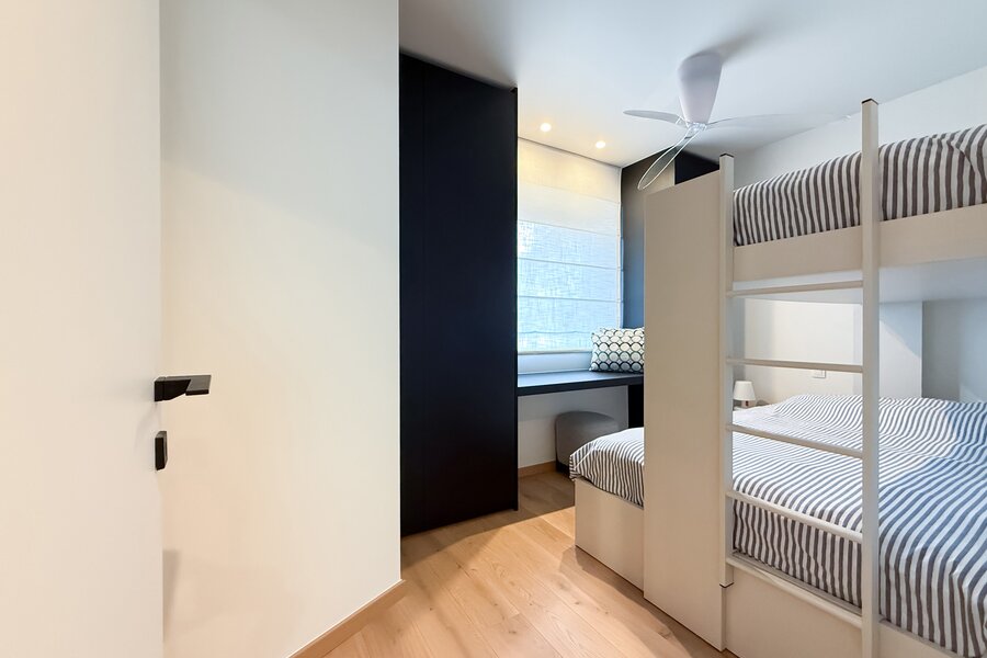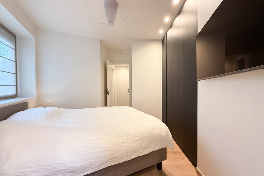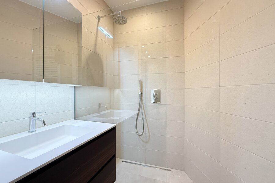Achteraan bevinden zich twee slaapkamers, beide met ingemaakte kasten en en-suite douchekamers. Eén slaapkamer beschikt bovendien over een bureelhoekje, ideaal voor thuiswerk of extra functionaliteit. Achteraan zijn automatische rolluiken voorzien voor extra comfort en privacy.