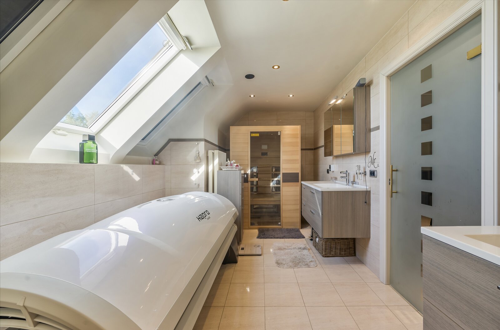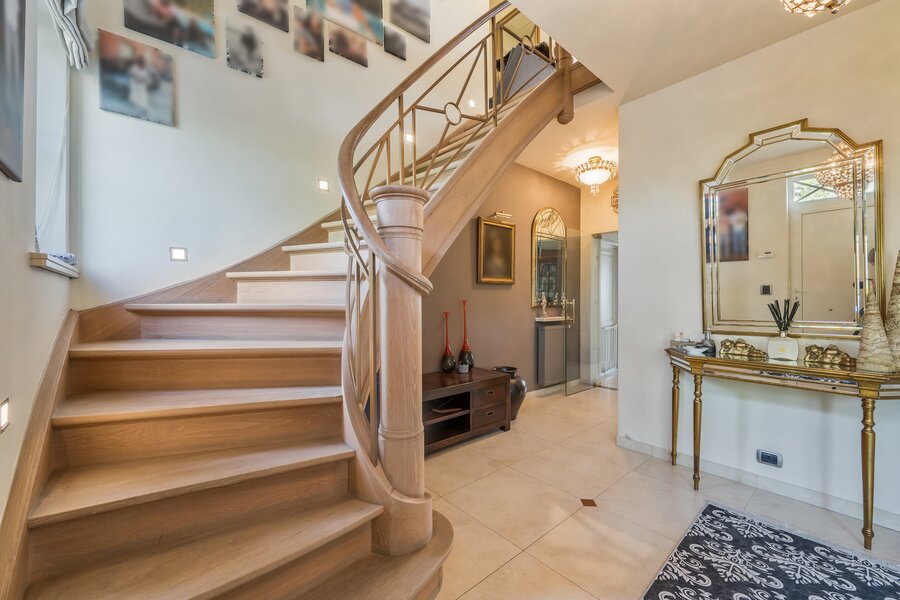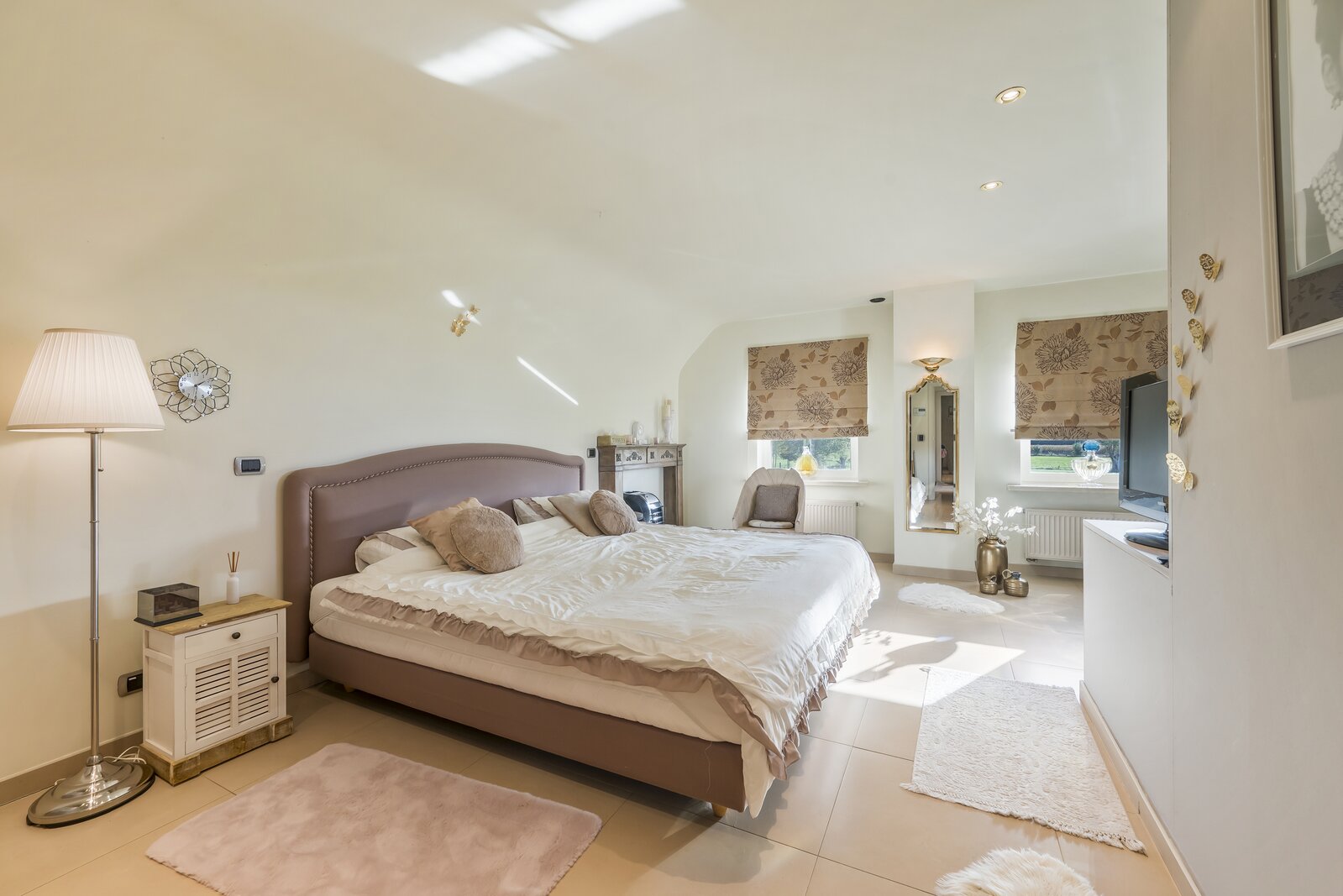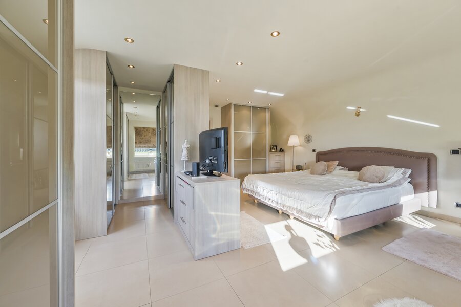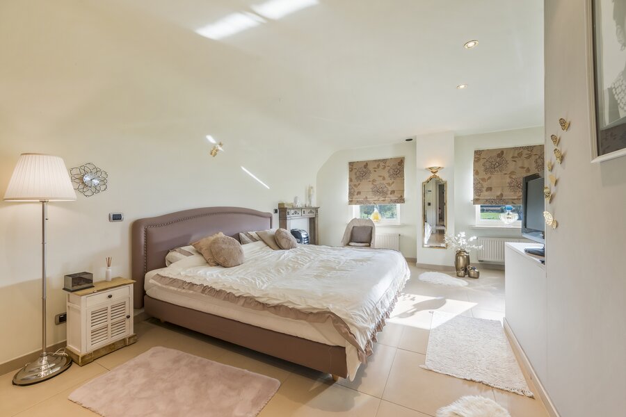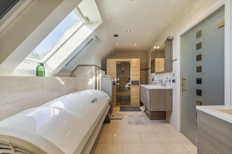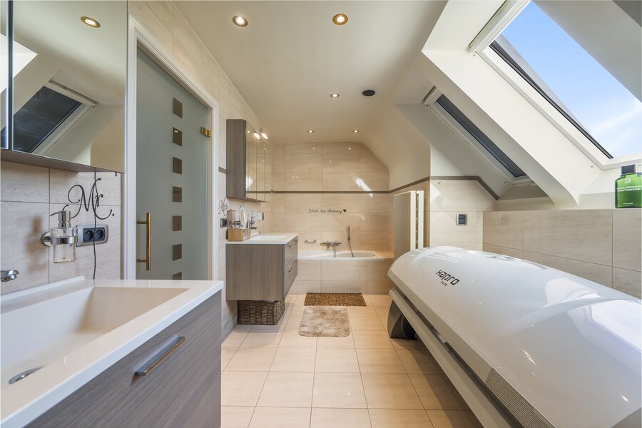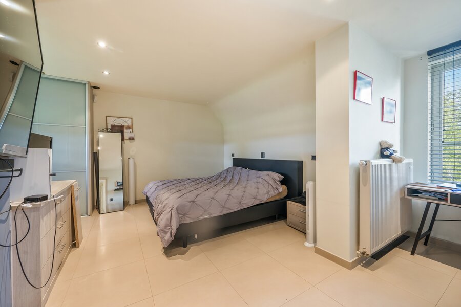 1stev: Op de eerste verdieping geeft de nachthal (5 m²) toegang tot twee riante slaapkamers van 25 m² en 29 m², beide voorzien van ingemaakte kasten. De badkamer van 13 m² is uitgerust met een dubbele wastafel, ligbad en douche. Ook een apart toilet (3 m²) is aanwezig.
