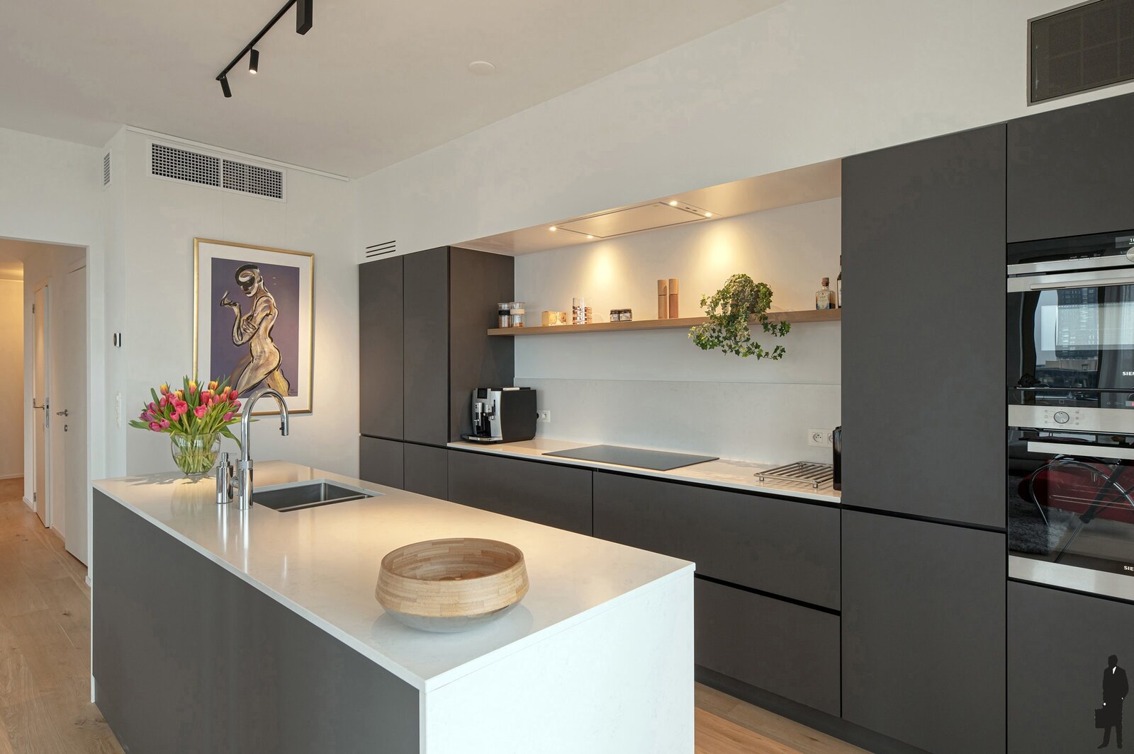De designkeuken met toestellen waaronder Siemens ovens, inductiekookplaat, Quooker en geïntegreerde vaatwasser sluit perfect aan bij de hoogwaardige afwerking doorheen het appartement. Maatwerkmeubilair, een elegant tv-meubel met Faber waterdamphaard versterken het gevoel van klasse en comfort. Vloerverwarming, een gelakte eikenhouten vloer en discreet ingewerkte airconditioning tillen het woonniveau naar een hoger niveau. De verzorgde master bedroom beschikt over een badkamer met dubbele lavabo en inloopdouche. Samen met de tweede slaapkamer en extra badkamer biedt het appartement een comfortabele en flexibele indeling.