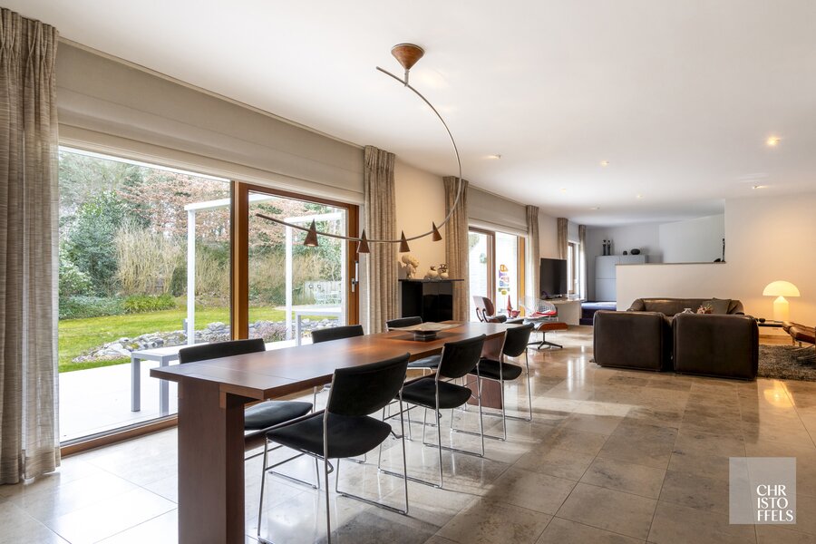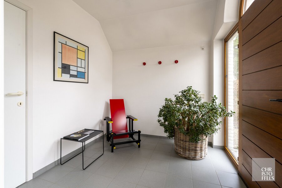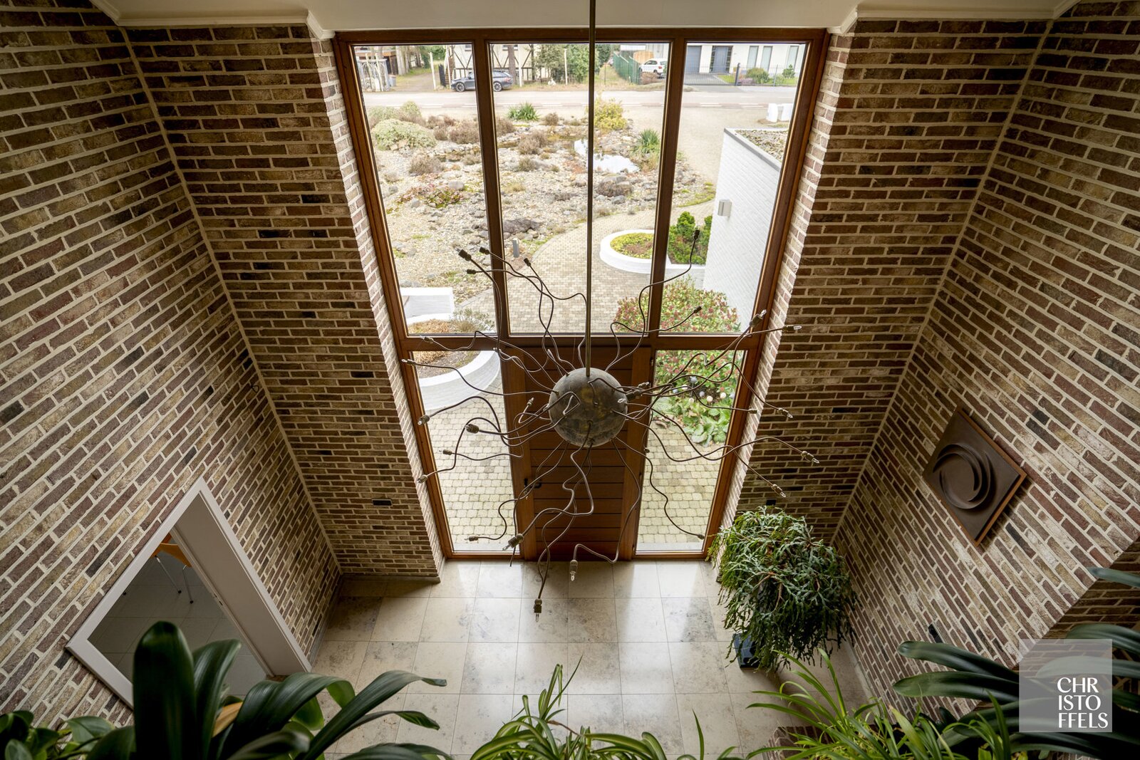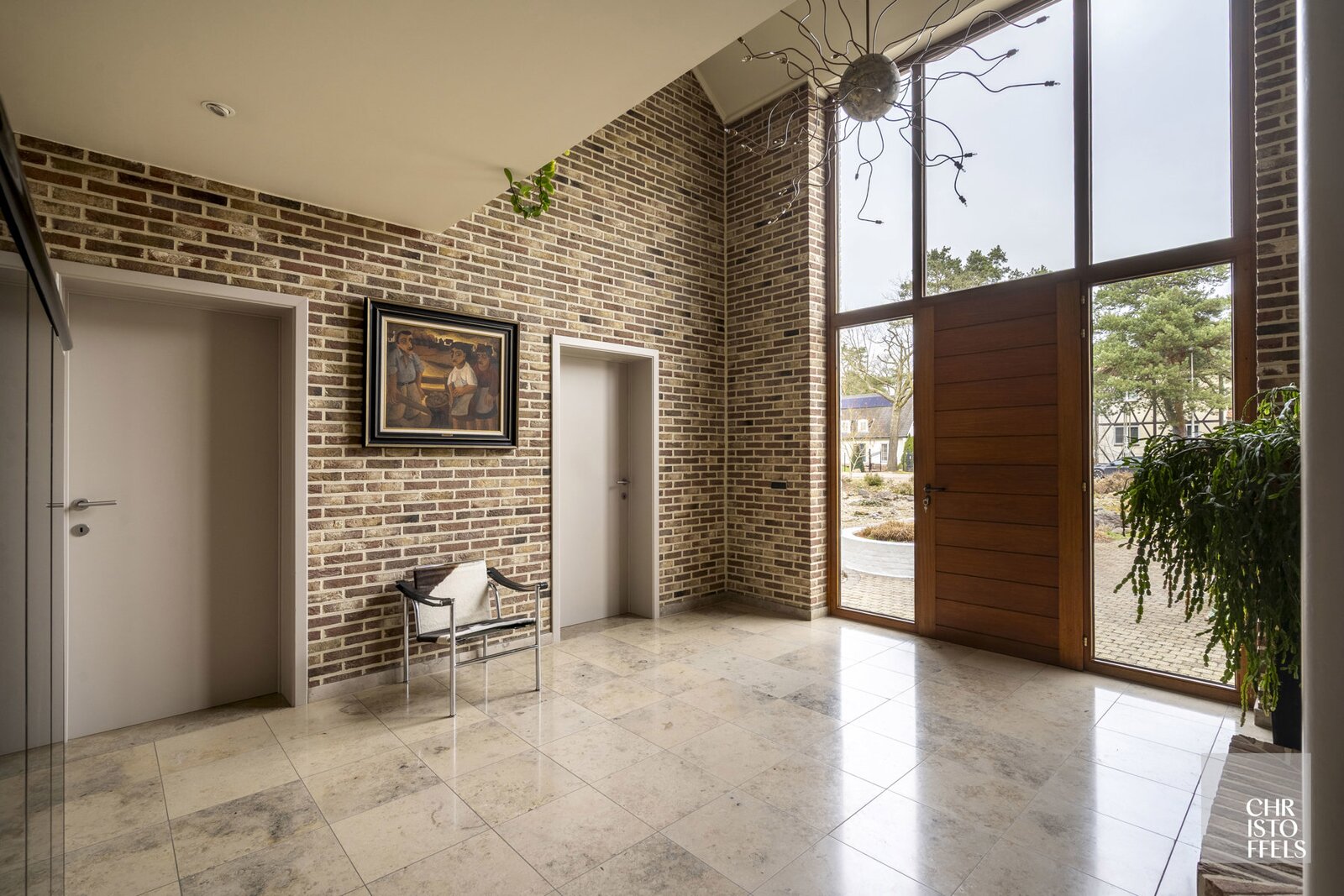 De villa heeft daarnaast een centrale hoofdingang, bestaande uit een ruime hal inclusief vestiaire en gastentoilet. De open leefruimte is ingedeeld met een zit- en eethoek, een open leefkeuken met rechtstreekse toegang tot de berging en een uitzonderlijke grote bijkeuken . Op de begane grond bevindt zich tevens een inpandige garage, geschikt voor twee auto's.