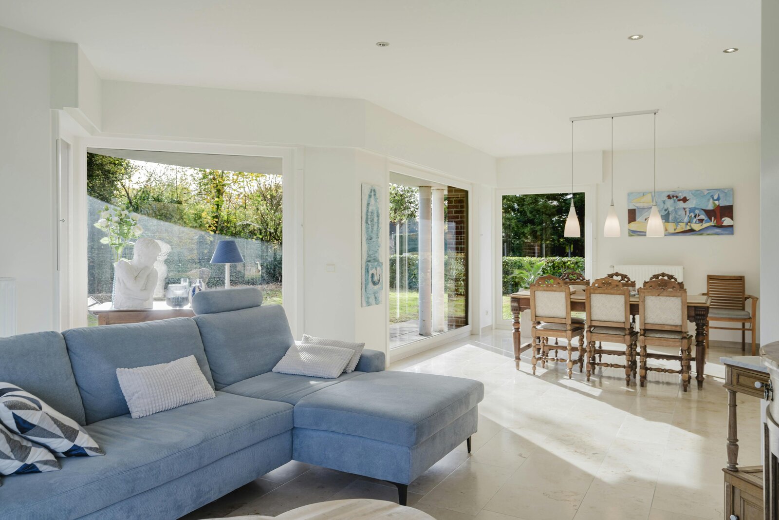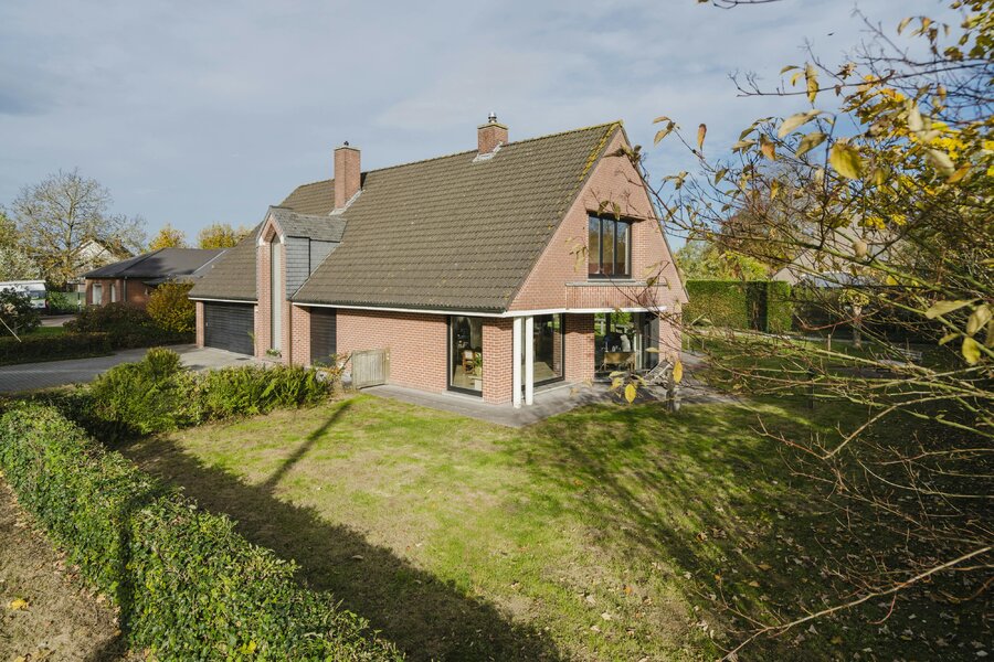 Inkomhal - apart toilet - leefruimte met zeer veel lichtinval en open haard - keuken (kookplaten, oven, spoelbak, vaatwas) met eetplaats - kelder - wasberging - kamer 1 met douche en dubbele lavabo - dubbele garage - aangename zuidgerichte tuin