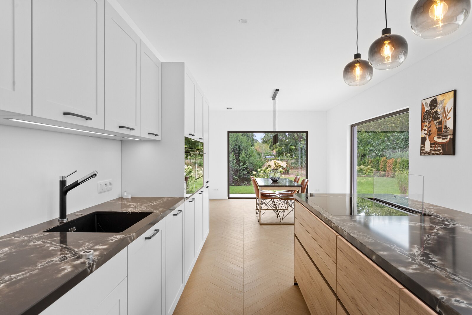 De open keuken, uitgerust met de nieuwste snufjes, vloeit moeiteloos over in de sfeervolle eetkamer die rechtstreeks in verbinding staat met de tuin. Naast de keuken vindt u een praktische berg- en technische ruimte, voorzien van alle moderne installaties.