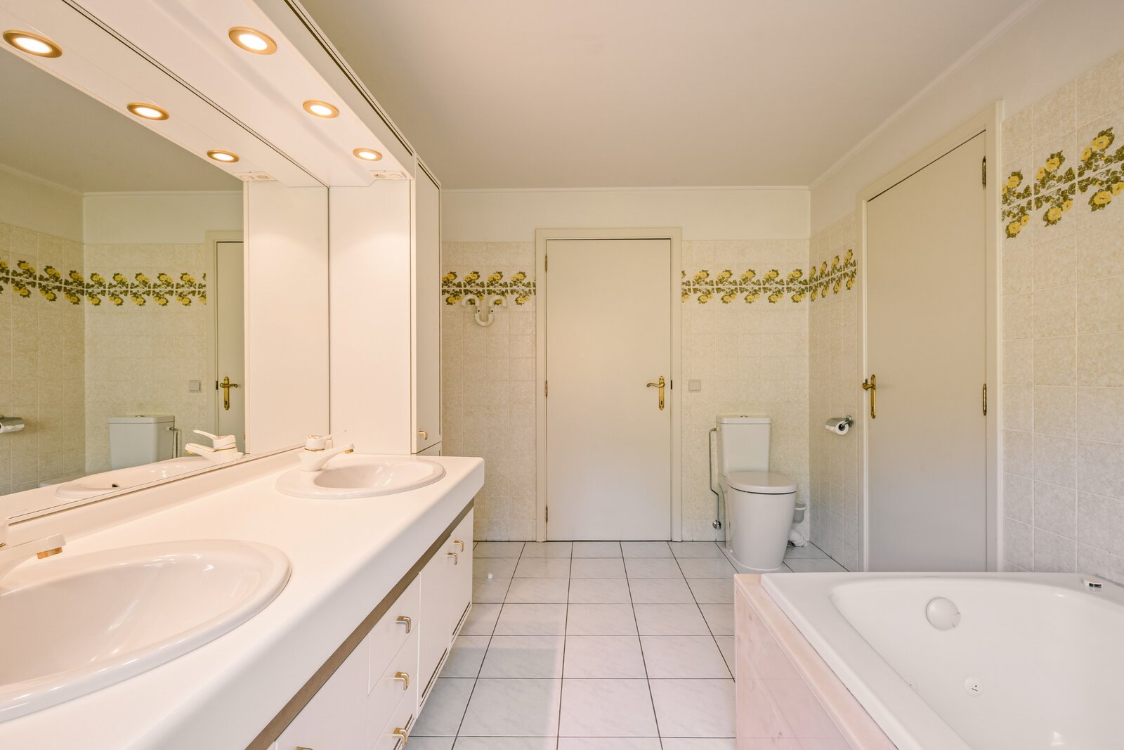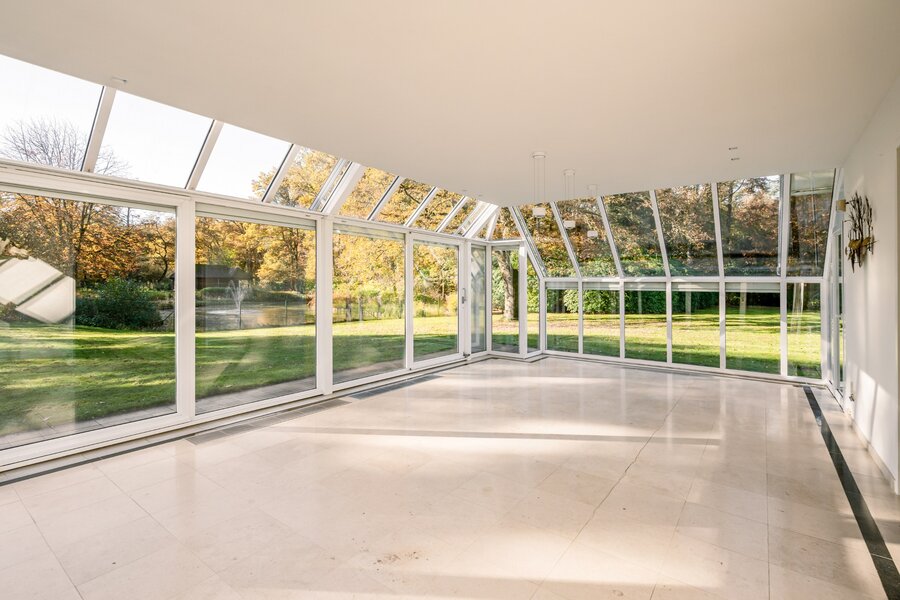 De villa verwelkomt u via een ruime en lichtrijke inkomhal met vestiaire en gastentoilet. Vanuit hier bereikt u de aangename leefruimte met open haard en grote raampartijen, die zorgen voor een prachtig uitzicht op de fraai aangelegde tuin. Aansluitend bevindt zich een sfeervolle leefveranda, volledig omringd door schuiframen en voorzien van automatische zonnescreens, zodat u het hele jaar door geniet van een maximale lichtinval en een harmonieus zicht op het groen.