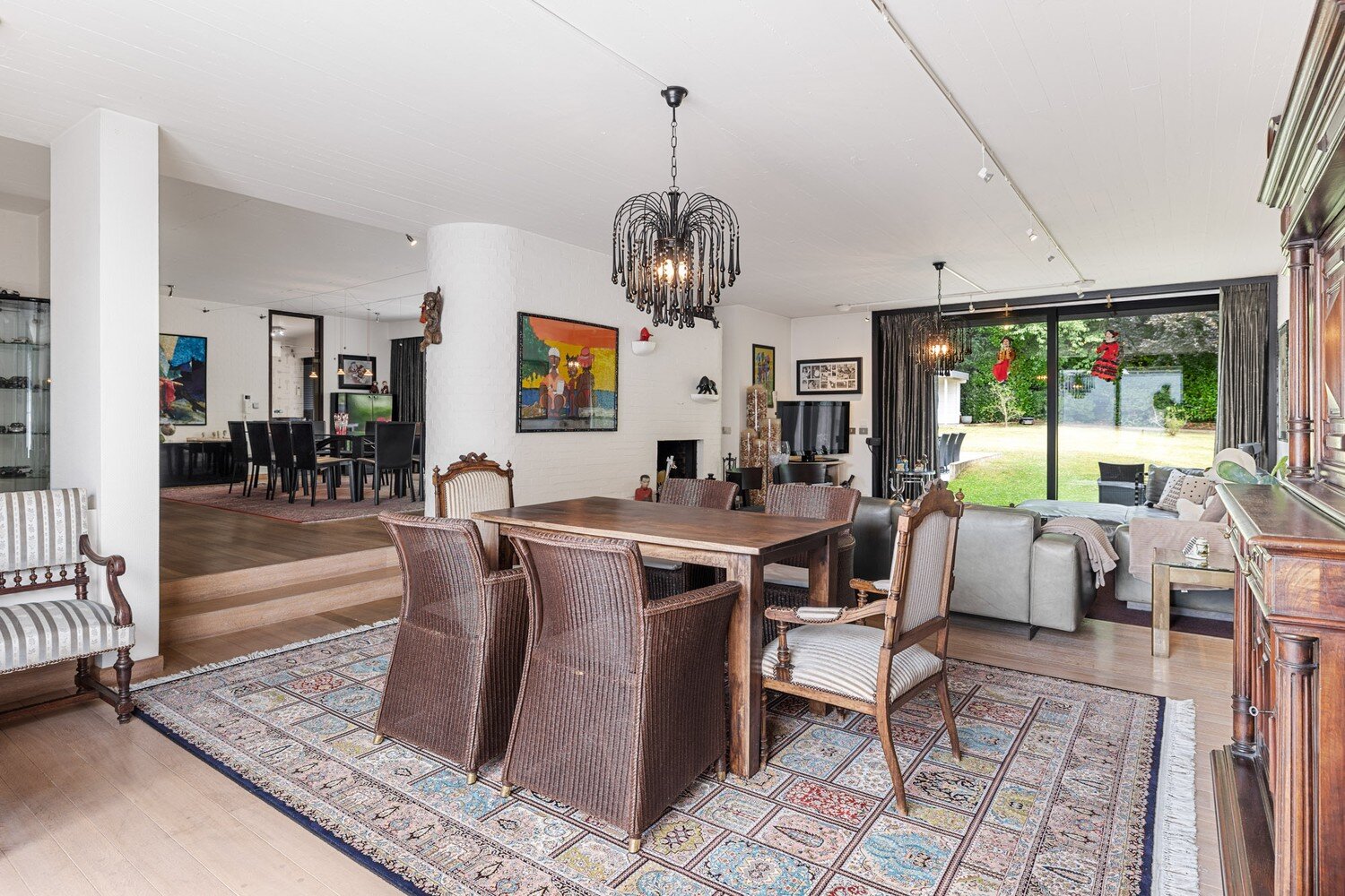 Bij het betreden van de woning komt u binnen in een ruime inkomhal met vestiaire. De royale leefruimte baadt in het licht en biedt een prachtig uitzicht op de tuin en de aangrenzende terrassen. Dankzij de indeling beschikt u over een gezellige zithoek, afgescheiden van de eetruimte door een sfeervolle haard waardoor dit een perfecte plek is om tot rust te komen.