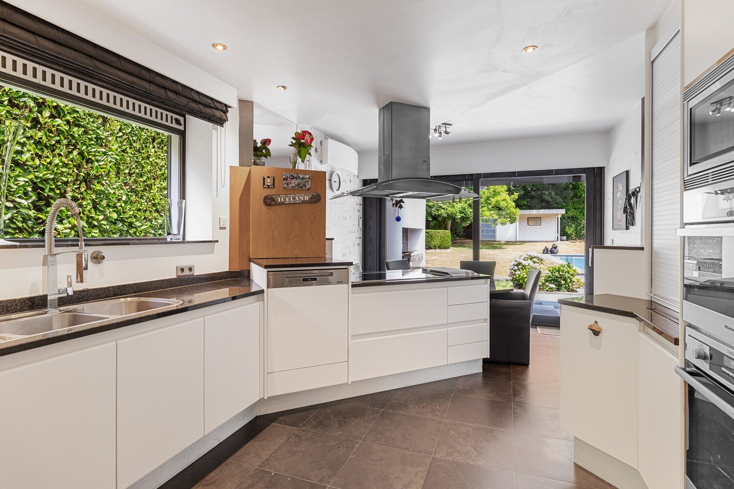 Aan de eetplaats grenst de keuken, uitgerust met de nodige toestellen en eveneens met directe toegang tot zowel de tuin als de inkomhal.