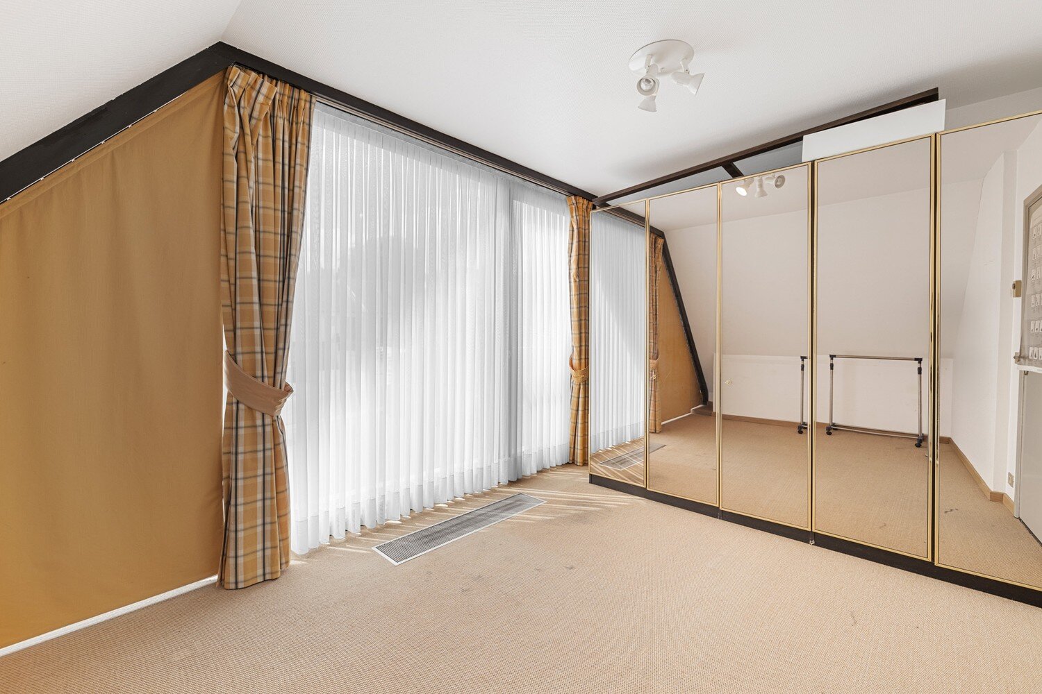 De eerste verdieping telt vier bijkomende slaapkamers, een tweede badkamer met bad, inloopdouche en dubbele lavabo, én een apart toilet. De ruime nachthal biedt bovendien de mogelijkheid om een vaste trap naar de zolder te voorzien. Deze zolder, opgedeeld in twee ruimtes, biedt een prachtig uitzicht op de omgeving en leent zich uitstekend voor het creëren van extra kamers of opslagruimte dankzij de unieke architectuur.