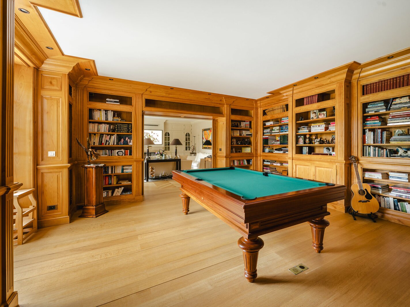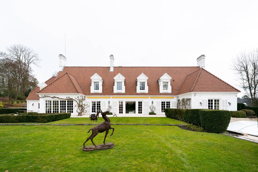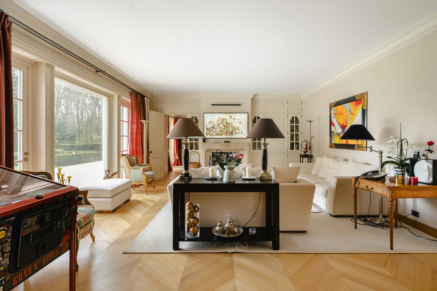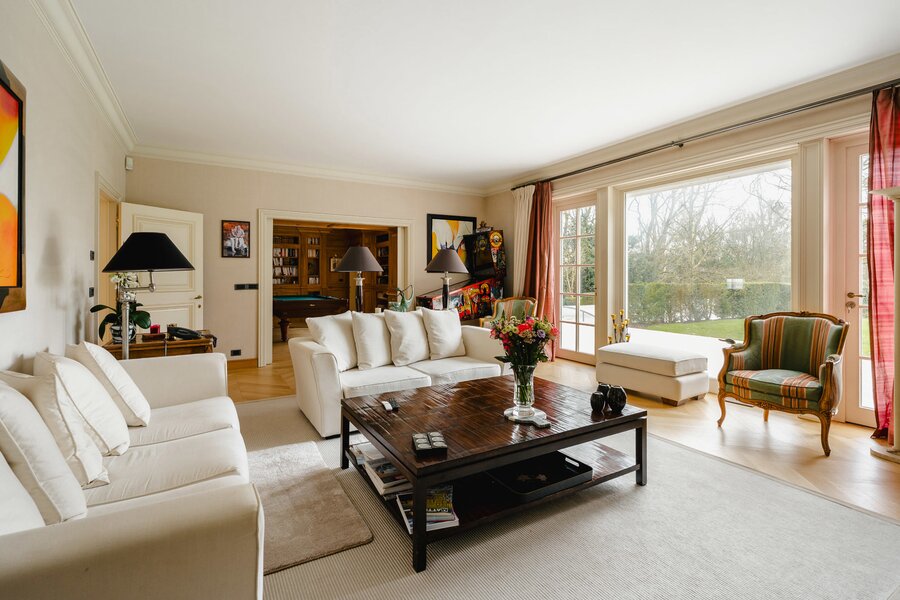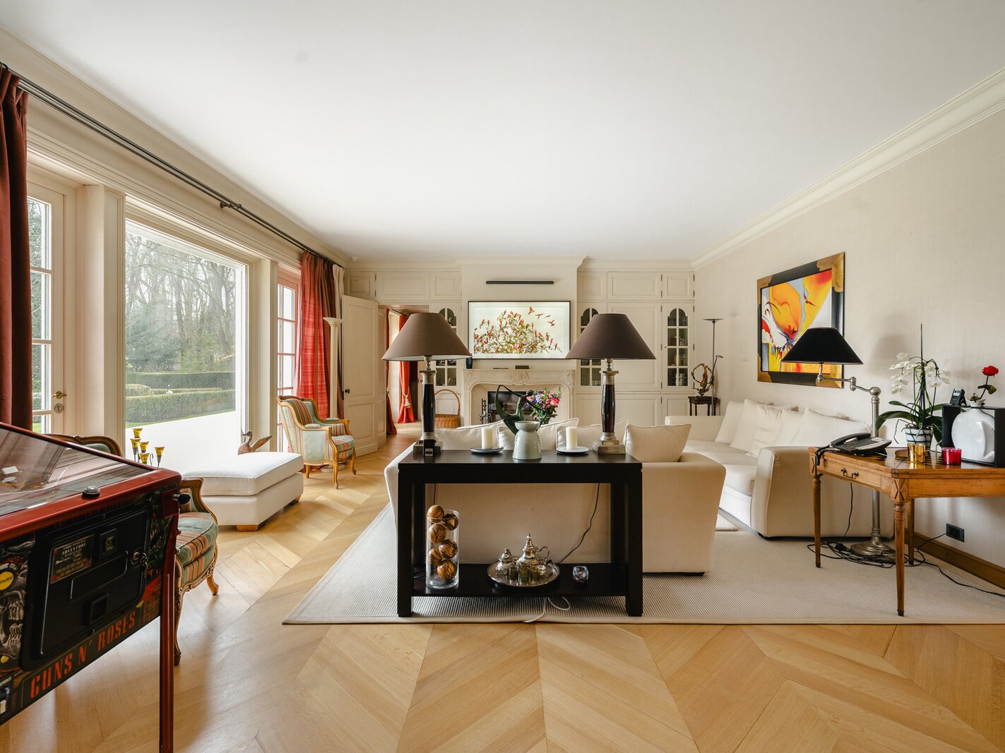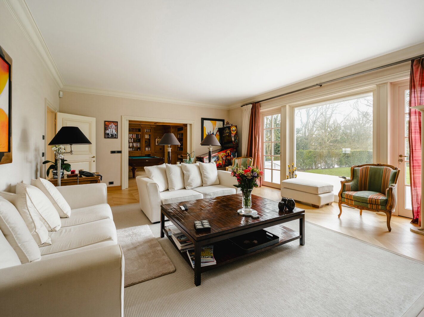 De villa combineert een klassieke stijl met hoogwaardige afwerkingen en bestaat uit een inkomhal, fraaie ontvangstruimtes met een ruime salon met houtkachel, een biljart-/bibliotheeksalon, een televisiesalon met gashaard, een eetkamer, een ruime, volledig uitgeruste semi-professionele keuken met ontbijtruimte, die allemaal uitkomen op het terras en de tuin. Een tweede hal met dienstingang geeft toegang tot de wasruimte, een dubbel kantoor en de verwarmde garages voor 4 auto's. Het slaapgedeelte bestaat op de begane grond uit een complete suite met kleedkamer en badkamer en op de bovenverdieping uit de hoofdslaapkamer met badkamer en kleedkamer en drie andere slaapkamers met aangrenzende badkamers, een dienstappartement (woonkamer, kitchenette, slaapkamer, badkamer) en een duplex speelkamer. Een verwarmde garage in de kelder voor vier auto's en talrijke kelders maken dit geheel compleet.