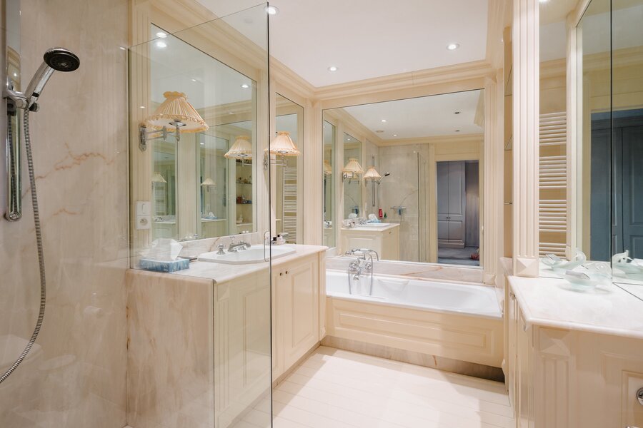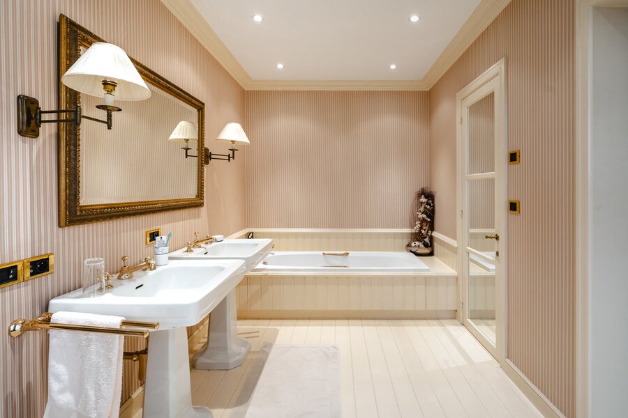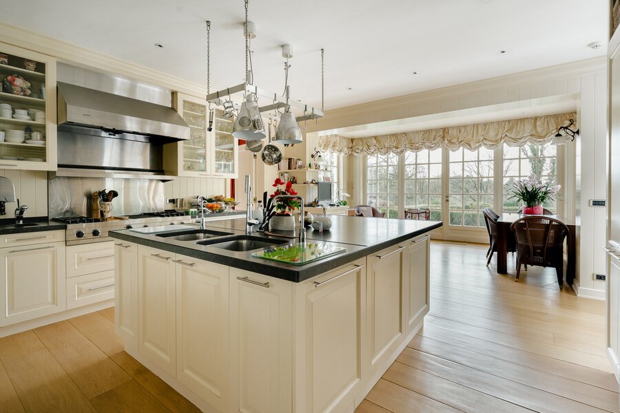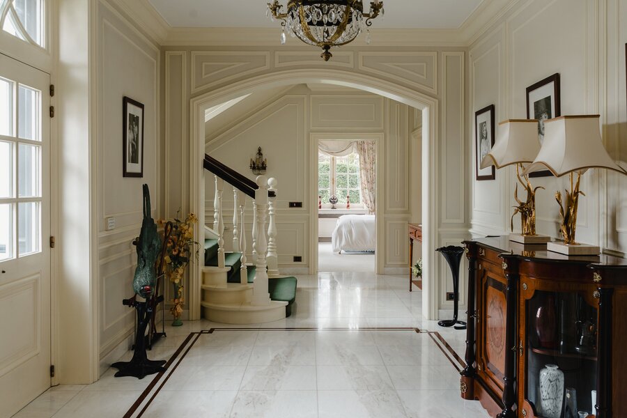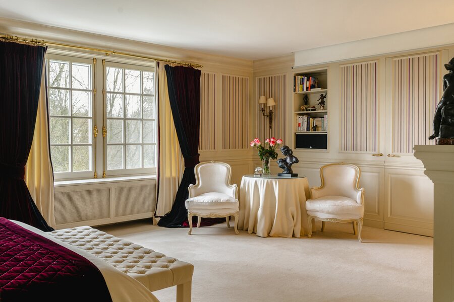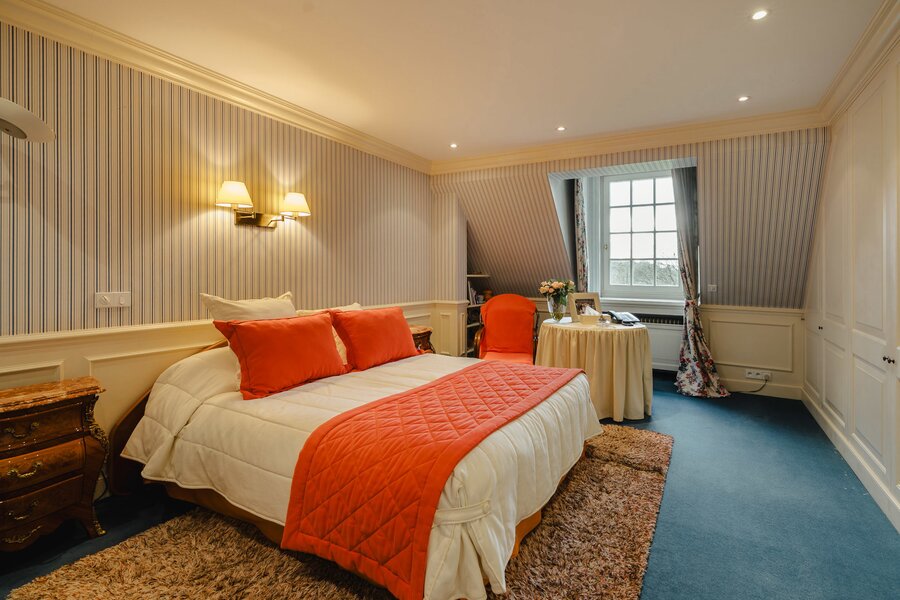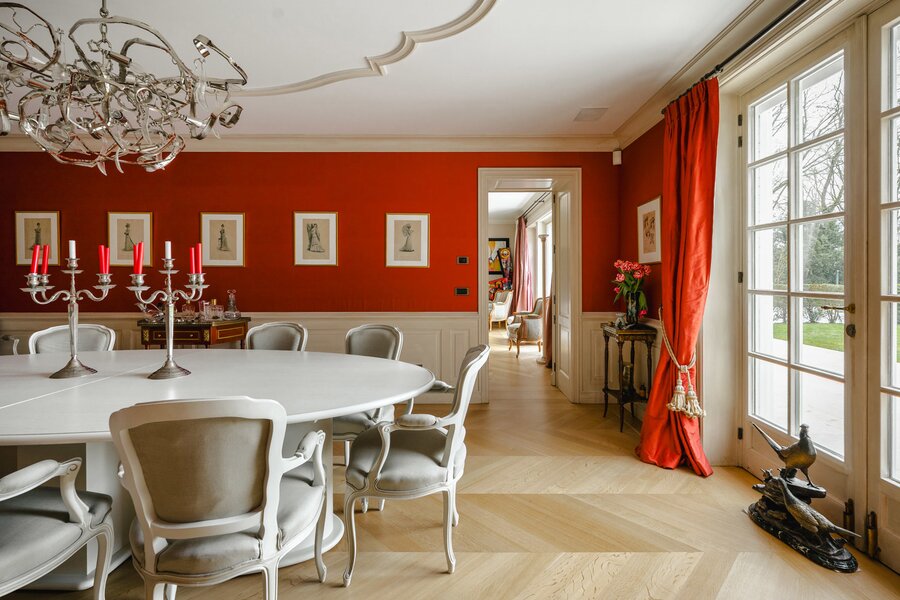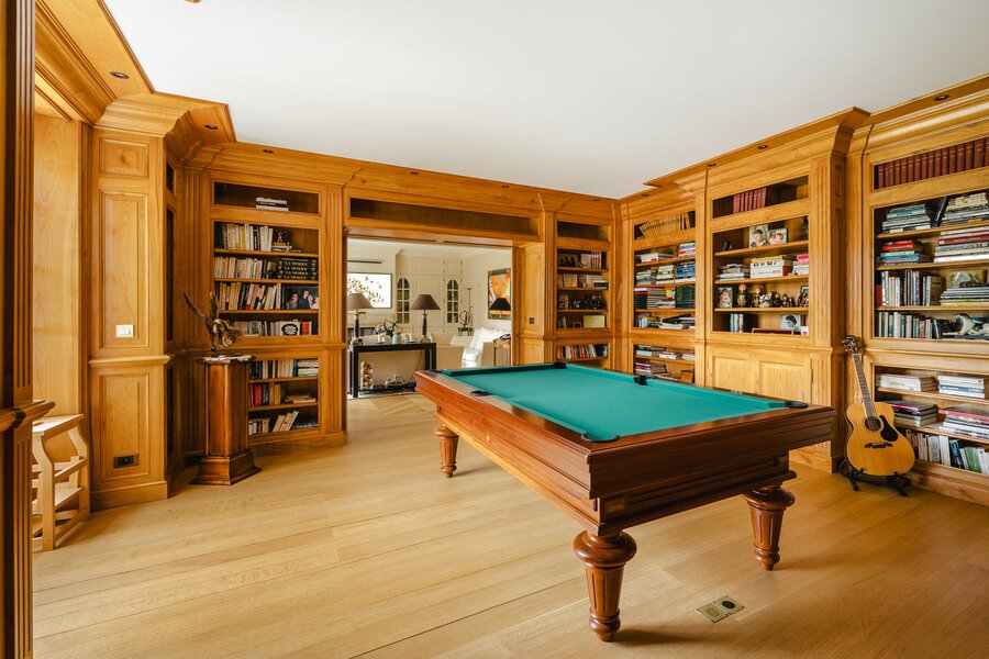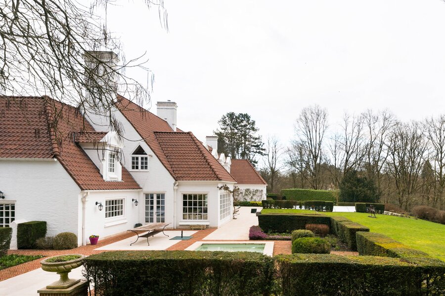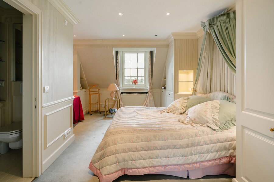 De villa combineert een klassieke stijl met hoogwaardige afwerkingen en bestaat uit een inkomhal, fraaie ontvangstruimtes met een ruime salon met houtkachel, een biljart-/bibliotheeksalon, een televisiesalon met gashaard, een eetkamer, een ruime, volledig uitgeruste semi-professionele keuken met ontbijtruimte, die allemaal uitkomen op het terras en de tuin. Een tweede hal met dienstingang geeft toegang tot de wasruimte, een dubbel kantoor en de verwarmde garages voor 4 auto's. Het slaapgedeelte bestaat op de begane grond uit een complete suite met kleedkamer en badkamer en op de bovenverdieping uit de hoofdslaapkamer met badkamer en kleedkamer en drie andere slaapkamers met aangrenzende badkamers, een dienstappartement (woonkamer, kitchenette, slaapkamer, badkamer) en een duplex speelkamer. Een verwarmde garage in de kelder voor vier auto's en talrijke kelders maken dit geheel compleet.