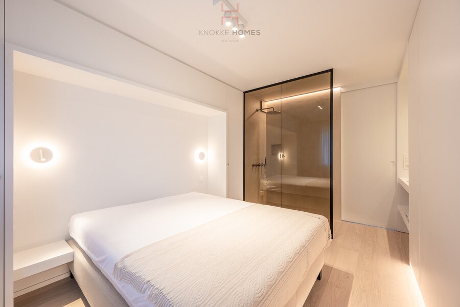 Masterbedroom met ingemaakte kasten en ensuite badkamer (inloopdouche + vrijstaand bad). Tweede slaapkamer met ingemaakte kasten en eigen douche.