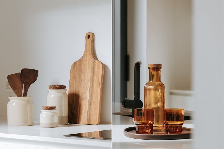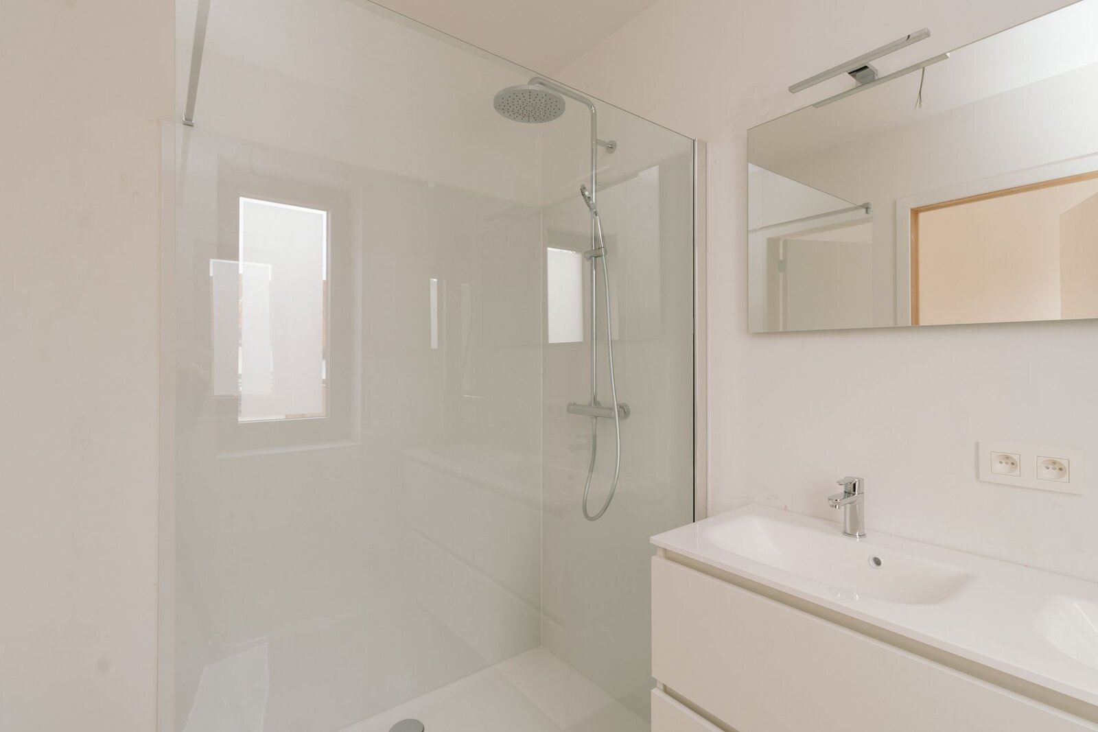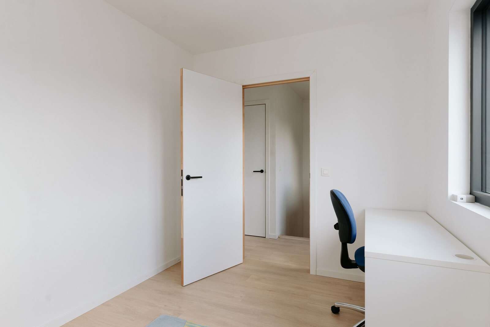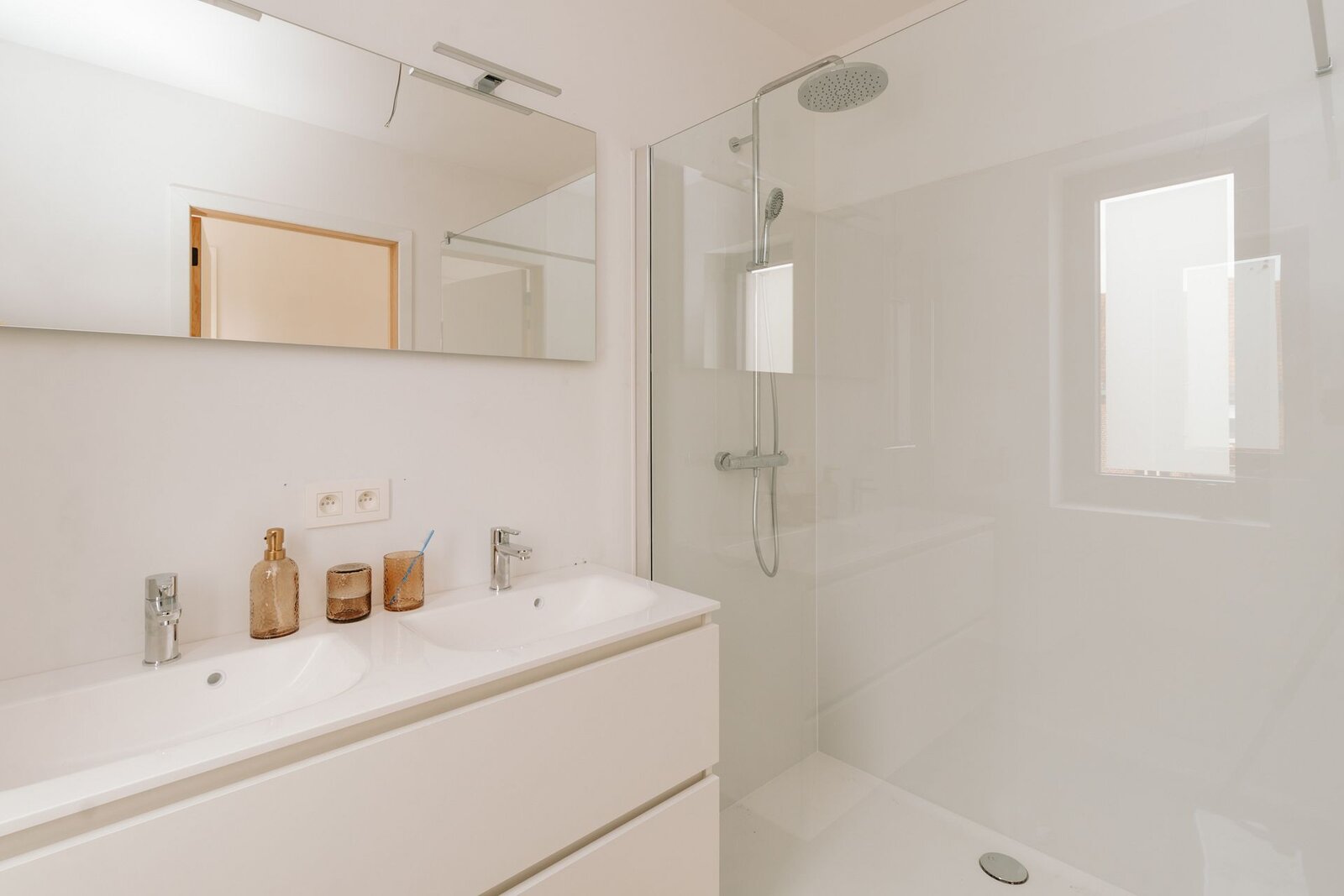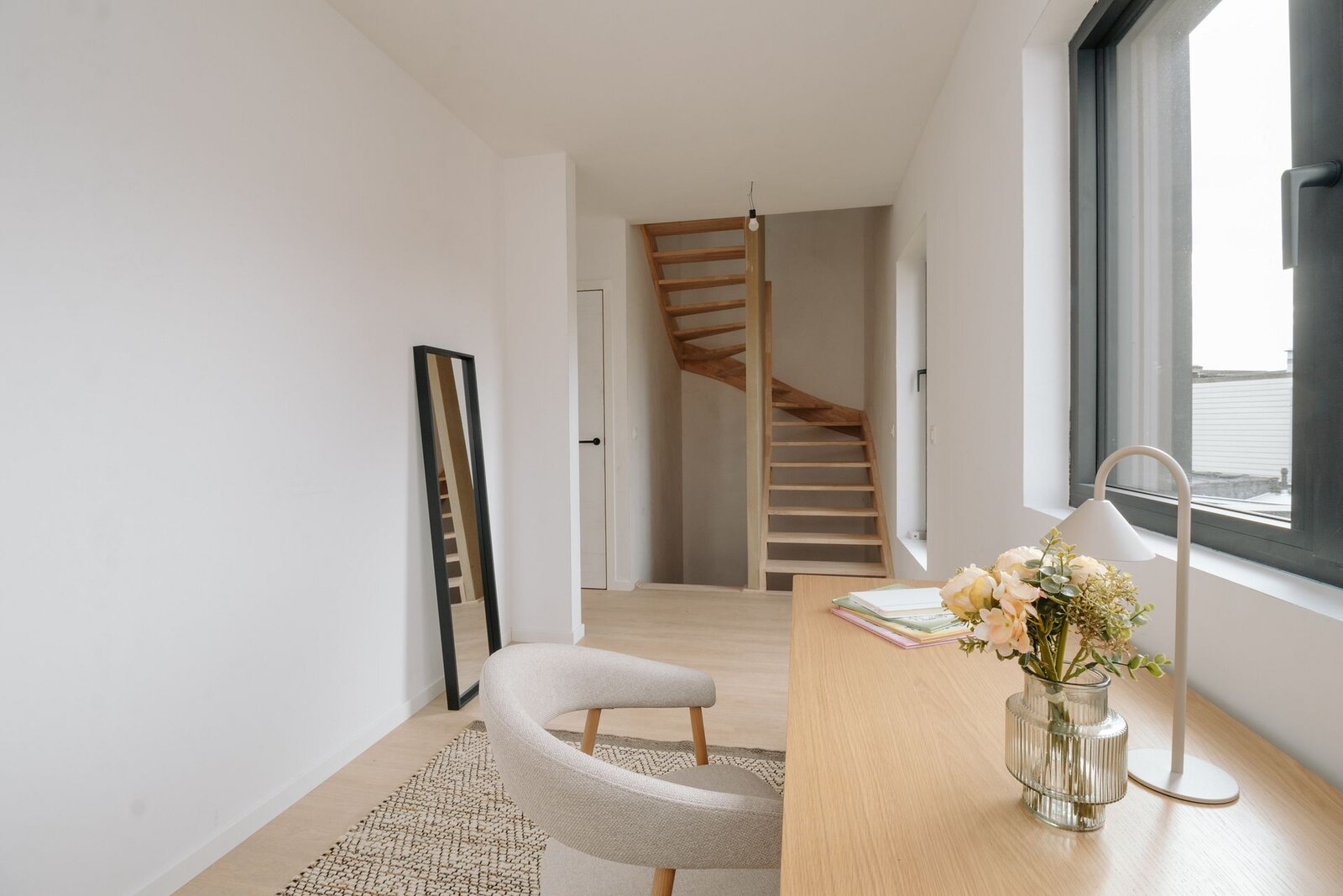 Op het gelijkvloers vinden we de inkomhal met ruime berging/technische ruimte en gastentoilet. Via een steel‑look glazen deur kom je in de lichtrijke leefruimte met open, volledig uitgeruste keuken en kookeiland. Grote raampartijen zorgen voor een sterke connectie met de tuin.