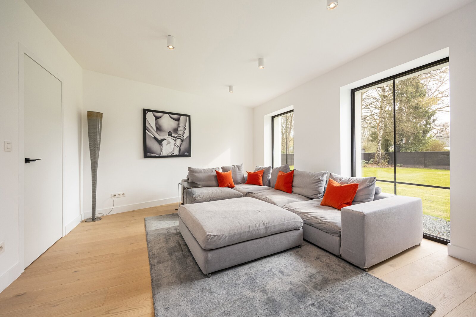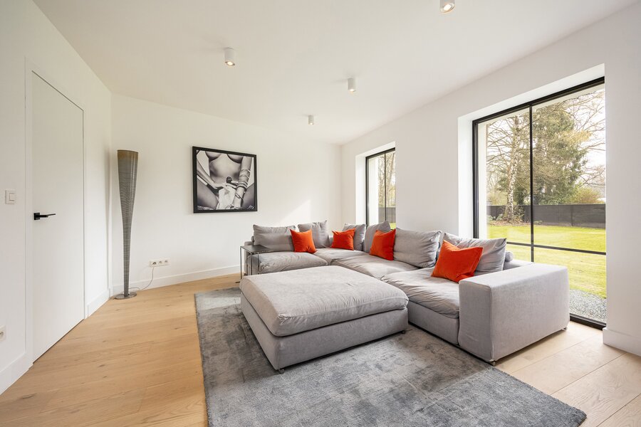 De royale leefruimte wordt gekenmerkt door veel natuurlijke lichtinval en heeft een prachtig