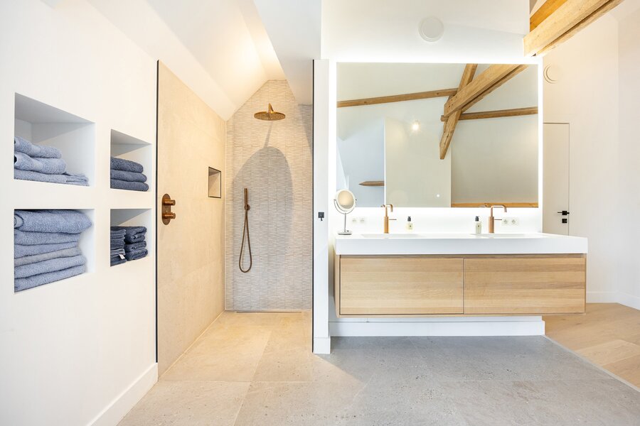 ruime inloopdouche, dubbele wastafel en ligbad, ruimte voor een dressing en met een