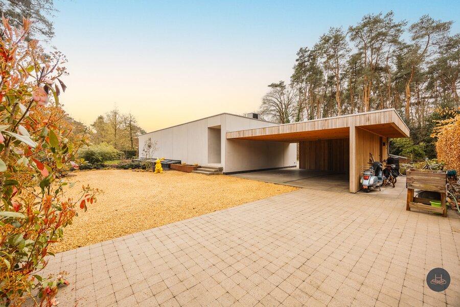 Buiten is het volop genieten op het aangename terras. De woning biedt uitmuntende parkeergelegenheid dankzij een carport voor twee wagens en meerdere parkeerplaatsen op het domein. Kortom, een energiezuinige droomwoning op een absolute toplocatie voor wie houdt van luxe, rust en moderne architectuur.