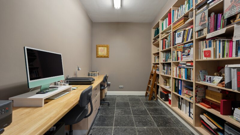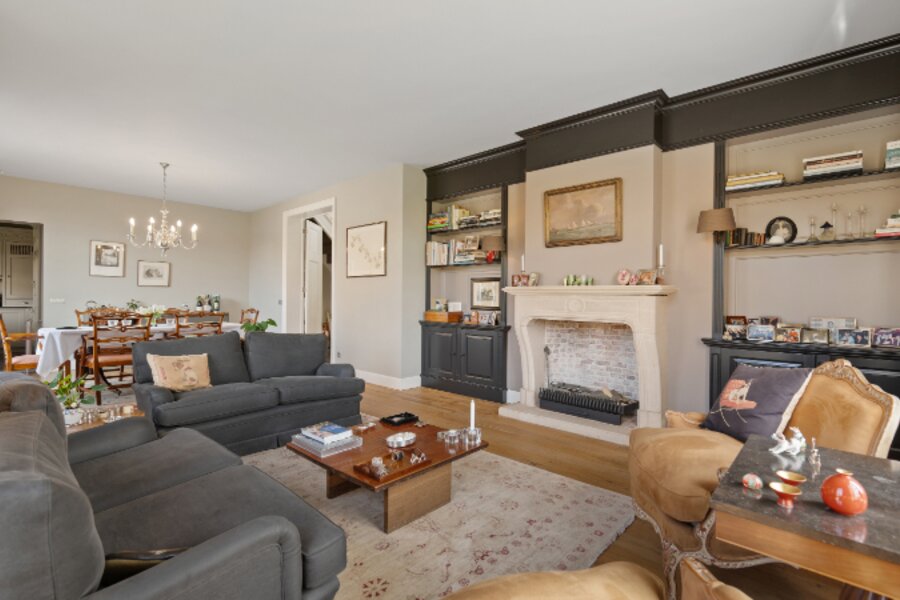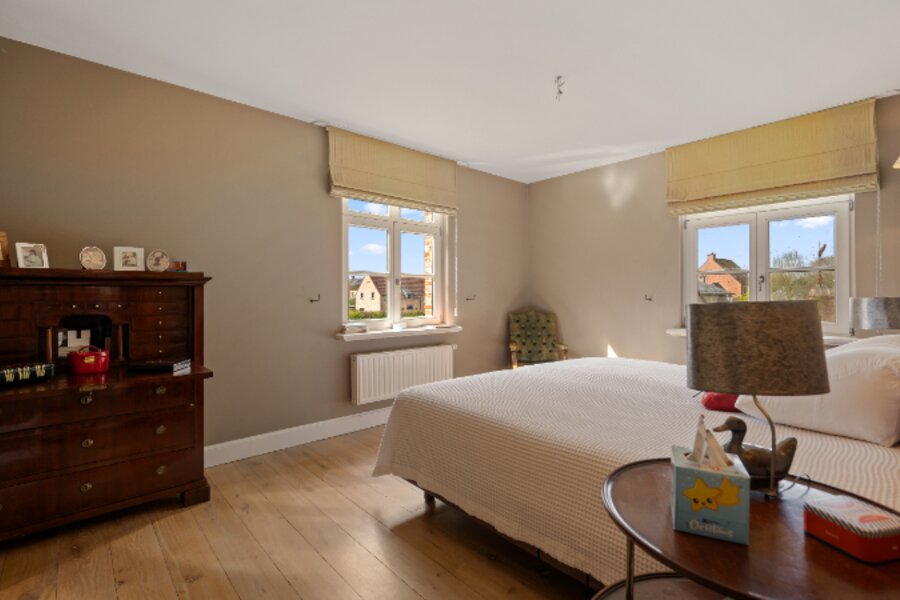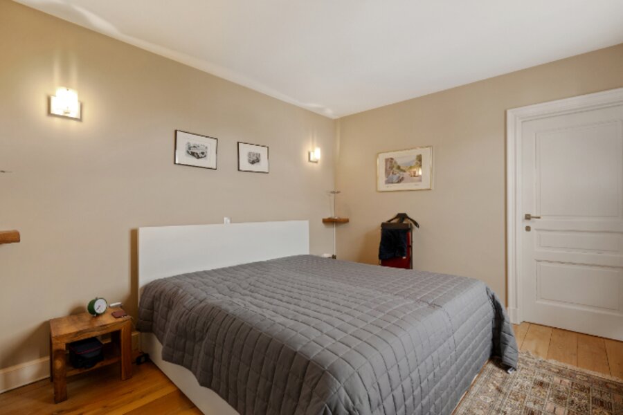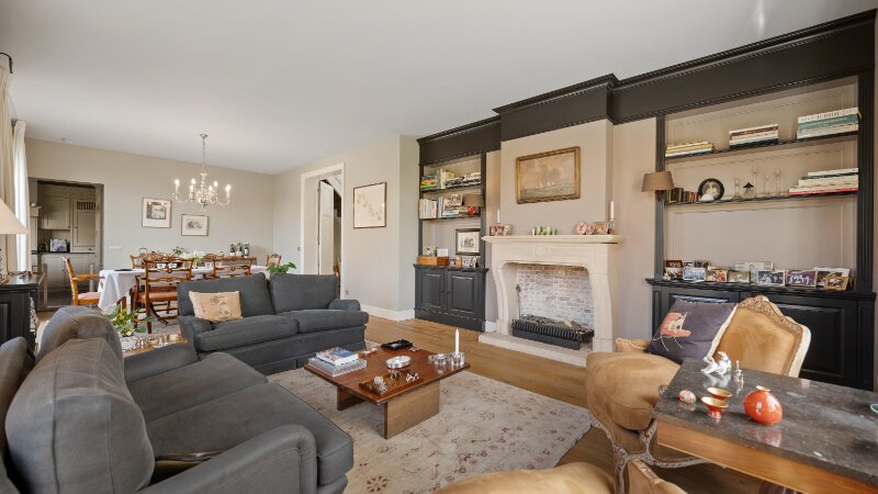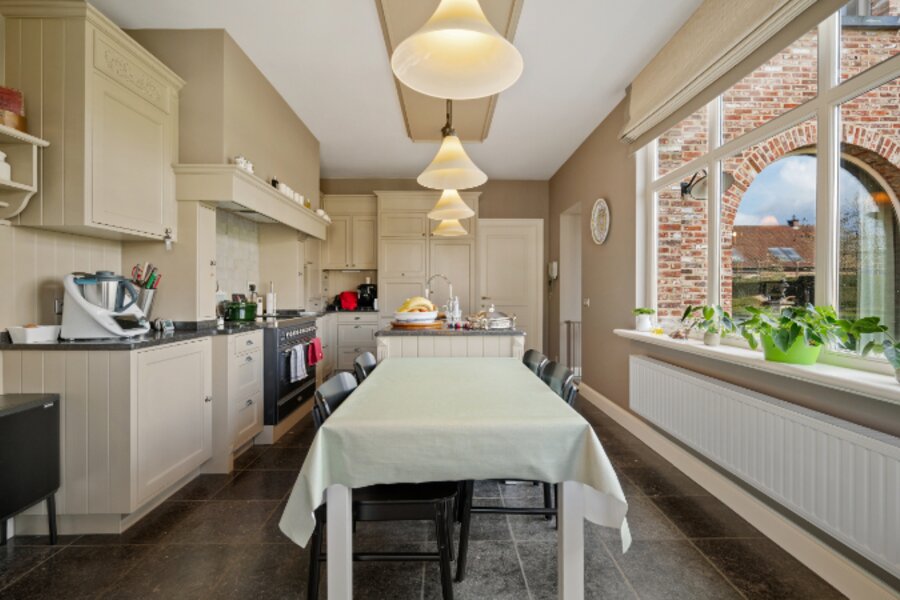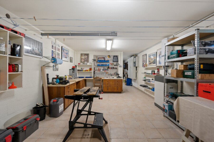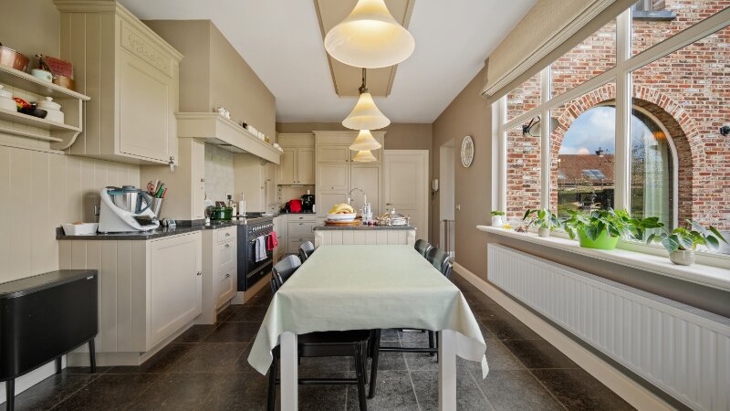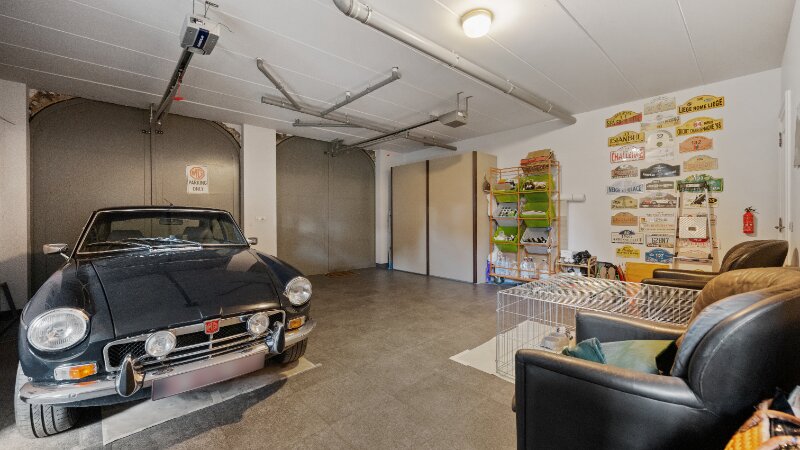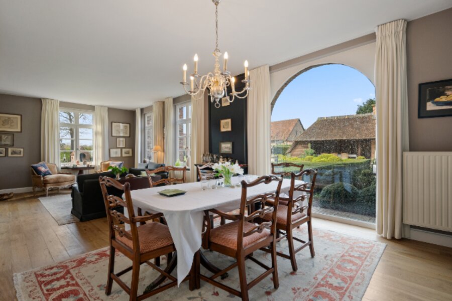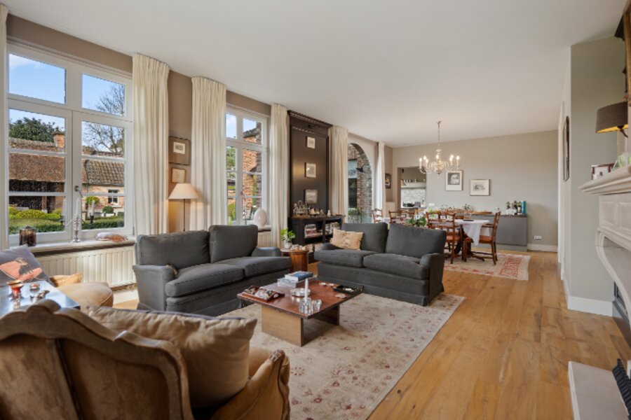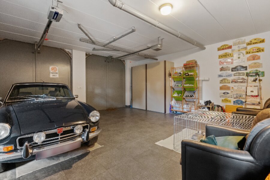 Omvat: ruime kelder (82 m2 ) met wijnkelder, opslag en hobby of werkplaats - inkomhal met vestiaire en wc, living 41m² met haard en parket, volledig ingerichte keuken met eethoek 23m², koele berging, wasplaats, dubbele garage, bureel 24m², 4 slaapkamers met parket, 2 bad-of douchekamers, 2 dressings. 2 slaapkamers vormen thans ruime studio, geschikt voor inwoon van extra familielid of dienstpersoneel.
