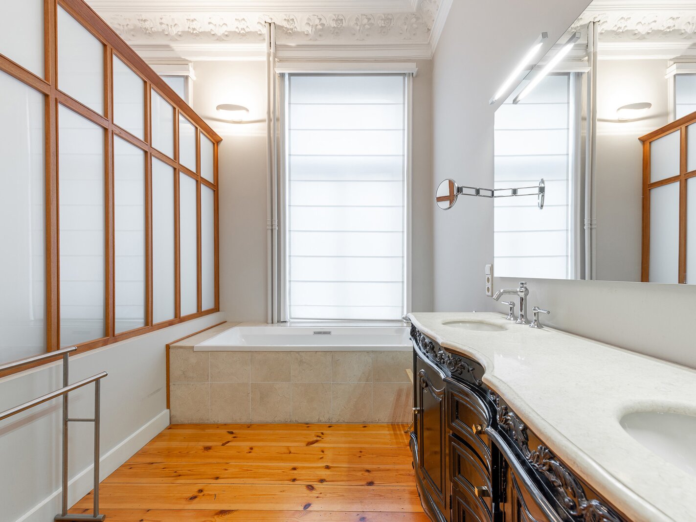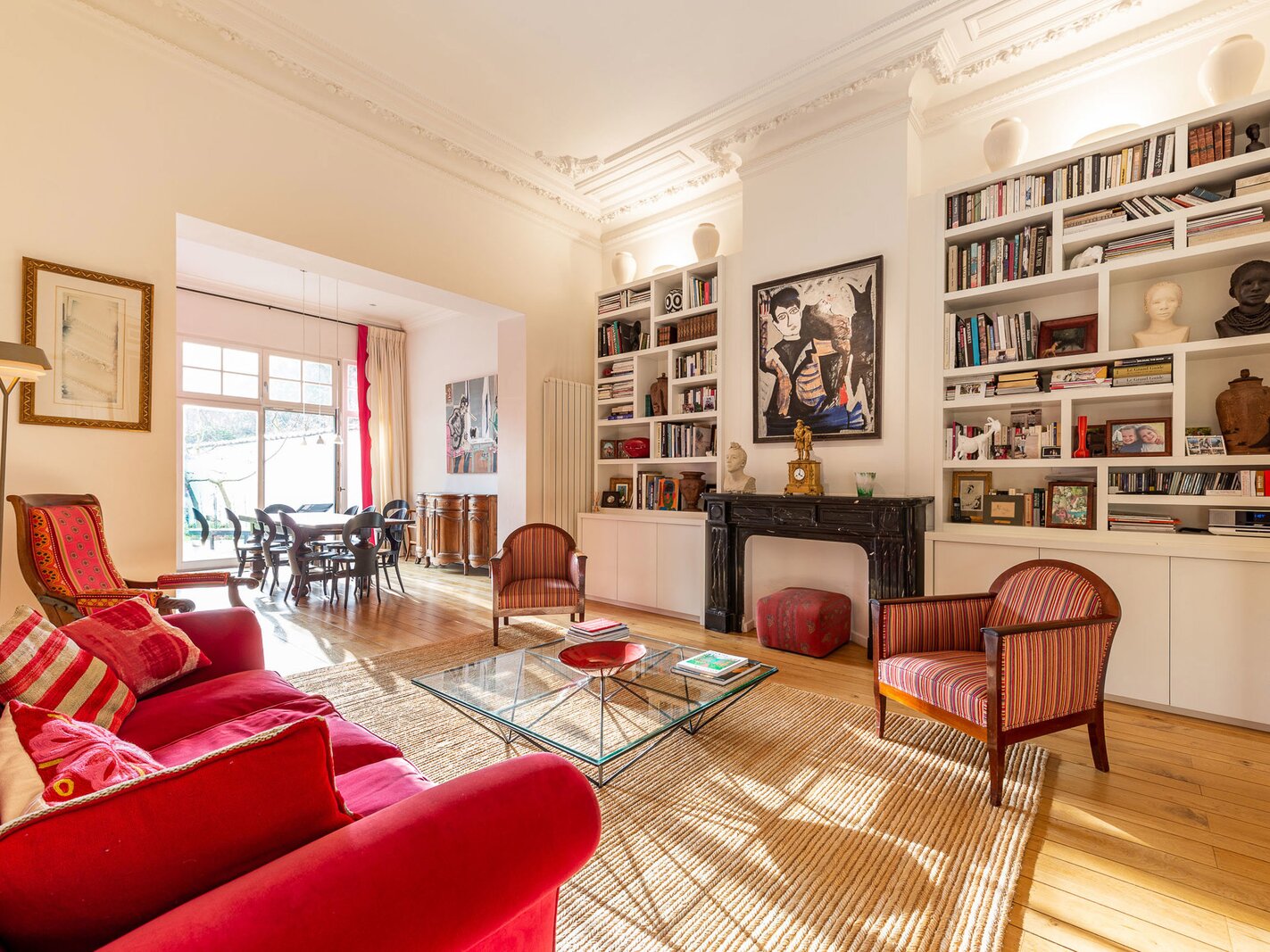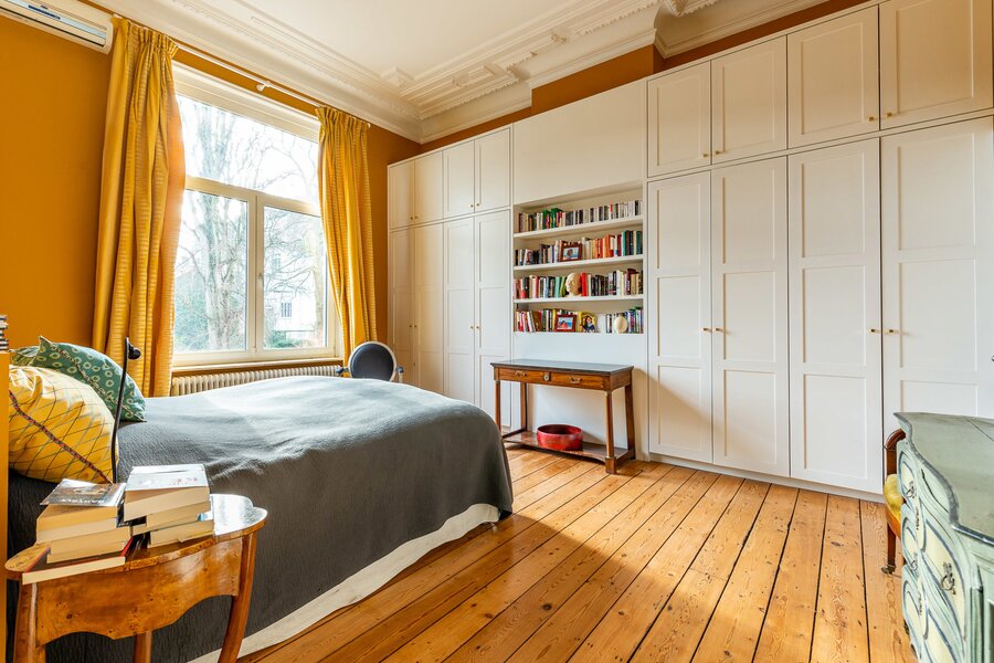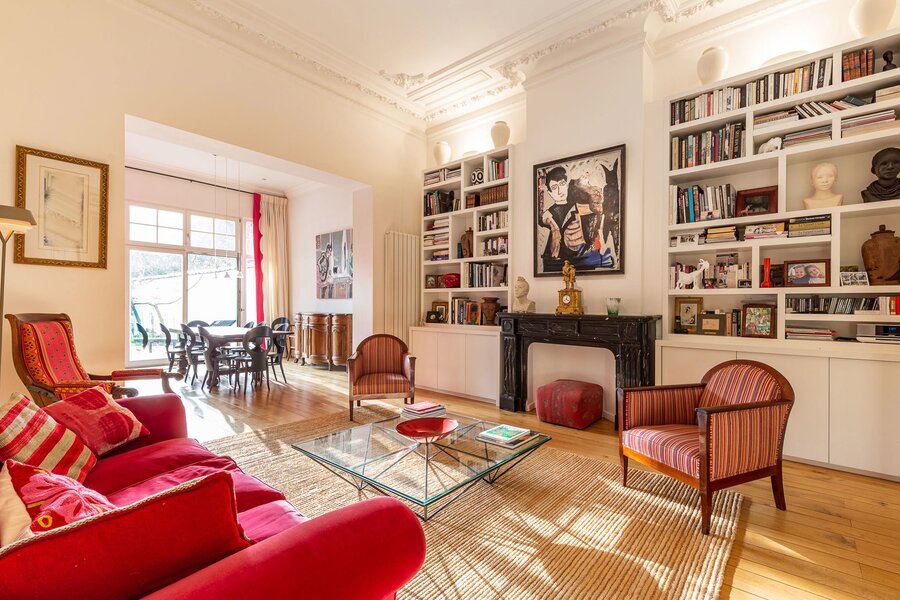 De woning opent naar een ruime hal die toegang geeft tot prachtige ontvangstkamers met een open haard, een woonkamer en een eetkamer met toegang tot het terras en de tuin. De open keuken vormt een harmonieuze aanvulling op deze uitnodigende leefruimte. Op de begane grond bevindt zich de master suite met een kleedkamer, een complete badkamer, een zitkamer en een slaapkamer met uitzicht op de tuin. Op de eerste verdieping delen twee ruime slaapkamers een aparte doucheruimte. De tweede verdieping biedt een slaapkamer met een en-suite badkamer, een kitchenette en een zolderruimte. De woning heeft zijn prachtige authentieke elementen (lijstwerk en hoge plafonds) behouden, die perfect samengaan met modernere afwerkingen.